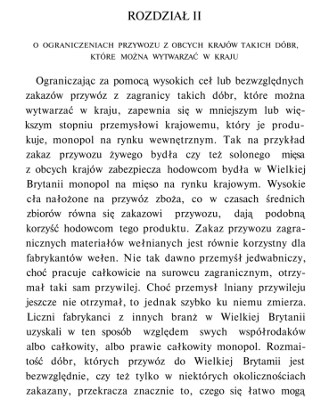 ROZDZIAŁ II O OGRANICZENIACH PRZYWOZU Z OBCYCH KRAJÓW TAKICH DÓBR, KTÓRE MOŻNA WYTWARZAĆ W KRAJU Ograniczając za pomocą wysokich ceł lub bezwzględnych zakazów przywóz z zagranicy takich dóbr, które można wytwarzać w kraju, zapewnia się w mniejszym lub większym stopniu przemysłowi krajowemu, który je produkuje, monopol na rynku wewnętrznym. Tak na przykład zakaz przywozu żywego bydła czy też solonego mięsa z obcych krajów zabezpiecza hodowcom bydła w Wielkiej Brytanii monopol na mięso na rynku krajowym. Wysokie cła nałożone na przywóz zboża, co w czasach średnich zbiorów równa się zakazowi przywozu, dają podobną korzyść hodowcom tego produktu. Zakaz przywozu zagranicznych materiałów wełnianych jest równie korzystny dla fabrykantów wełen. Nie tak dawno przemyśł jedwabniczy, choć pracuje całkowicie na surowcu zagranicznym, otrzymał taki sam przywilej. Choć przemysł lniany przywileju jeszcze nie otrzymał, to jednak szybko ku niemu zmierza. Liczni fabrykanci z innych branż w Wielkiej Brytanii uzyskali w ten sposób względem swych współrodaków albo całkowity, albo prawie całkowity monopol. Rozmaitość dóbr, których przywóz do Wielkiej Brytamii jest bezwzględnie, czy też tylko w niektórych okolicznościach zakazany, przekracza znacznie to, czego się łatwo mogą 42 Systemy ekonomii politycznej IV, 2 domyślić ludzie nie obznajmieni dobrze z przepisami celnymi. Nie ulega wątpliwości, że monopol na rynku krajowym wspiera ogromnie tę gałąź przemysłu, która z niego korzysta i że często kieruje ku niej więcej pracy i zasobów społeczeństwa, niżby to miało miejsce, gdyby tego monopolu nie było. Ale czy prowadzi to do wzrostu ogólnej wytwórczości społeczeństwa, czy nadaje jej kierunek najbardziej pożądany — tego nie można chyba uznać za równie oczywiste. Ogólna działalność produkcyjna społeczeństwa nie może nigdy przekroczyć rozmiarów, jakie zakreśla wielkość kapitałów, które społeczeństwo może w niej ulokować. Podobnie jak liczba robotników, których zatrudnia poszczególny człowiek, musi pozostawać w pewnym stosunku do jego kapitałów, tak i liczba robotników, których mogą stale zatrudniać wszyscy członkowie jakiegoś wielkiego społeczeństwa, musi pozostawać w pewnym stosunku do całego kapitału, jaki to społeczeństwo posiada i nie może tego stosunku przekroczyć. Żadne przepisy handlowe nie mogą zwiększyć rozmiarów działalności produkcyjnej jakiegoś Społeczeństwa ponad to, co jego kapitał może uruchomić. Ustawodawstwo może co najwyżej skierować część wytwórczości tam, gdzie inaczej mogłaby nie trafić; ale bynajmniej nie jest pewne, czy ów sztucznie nadany kierunek będzie korzystniejszy dla społeczeństwa niż kierunek, który by wytwórczość obrała samorzutnie. Każdy człowiek czyni stale wysiłki, by znaleźć najbardziej korzystne zastosowanie dla kapitału, jakim może rozporządzać. Ma oczywiście na widoku własną korzyść, a nie korzyść społeczeństwa. Ale poszukiwanie własnej korzyści wiedzie go w sposób naturalny, a nawet nieuchronny IV, 2 Ograniczenie przywozu dóbr 43 do tego, by wybrał takie za stosowanie, jakie jest najkorzystniejsze dla społeczeństwa. Po pierwsze każdy człowiek usiłuje ulokować swój kapitał możliwie blisko, a więc wkłada tyle, ile tylko może w rozwój przemysłu krajowego, zawsze pod warunkiem, że może w ten sposób osiągnąć zwykłe, lub niewiele mniejsze niż zwykłe, zyski z kapitału. Tak więc przy jednakowych lub niemal jednakowych zyskach każdy kupiec-hurtownik woli z natury rzeczy handel wewnętrzny od konsumpcyjnego handlu zagranicznego, a znów konsumpcyjny handel zagraniczny przekłada nad przewozowy handel zagraniczny. W handlu wewnętrznym nie traci z oczu swego kapitału na okres tak długi, na jaki traci go często w konsumpcyjnym handlu zagranicznym. Może poznać lepiej charakter i położenie osób, którym ma zaufać, a gdyby zdarzyło się, że został oszukany, orientuje się lepiej w prawach krajowych, do których musi się uciec, by szukać zadośćuczynienia. W przewozowym handlu zagranicznym kapitał kupca jest jak gdyby rozdzielony między dwa obce kraje; nie znaczy to wcale, że jakaś część tego kapitału na pewno wróci kiedykolwiek do kraju ojczystego, ani też że koniecznie znajdzie się bezpośrednio pod jego okiem i w jego rozporządzeniu. Na ogół połowa kapitału kupca amsterdamskiego, który używa swego kapitału dla przewozu zboża z Królewca do Lizbony oraz wina i owoców z Lizbony do Królewca, musi się znajdować w Królewcu, a druga połowa w Lizbonie, Nie ma potrzeby, aby choć część tego kapitału powracała kiedykolwiek do Amsterdamu. Naturalną siedzibą takiego kupca powinien być Królewiec albo Lizbona i tylko zgoła wyjątkowe okoliczności mogą sprawić, że jako miejsce stałego pobytu wybierze Amsterdam. A jednak niepokój, jaki kupiec odczuwa, gdy jest tak da- 44 Systemy ekonomii politycznej lV,2 leko od swego kapitału, skłania go na ogół do tego, by sprowadzić z Królewca do Amsterdamu cześć towarów przeznaczonych dla rynku w Lizbonie, jak również część towarów z Lizbony przeznaczonych dla rynku w Królewcu: i choć naraża go to nieuchronnie na podwójne opłaty za wyładunek i załadowanie, a także na opłacanie pewnych podatków i ceł, to jednak chętnie ponosi owe dodatkowe koszta, aby choć część kapitału mieć pod okiem i we własnym rozporządzeniu. W ten oto sposób każdy kraj, który ma jakiś znaczny udział w handlu przewozowym, staje się zawsze miejscem składowym, czyli powszechnym rynkiem dla towarów wszystkich krajów, których sprawy handlowe załatwia. Aby uniknąć powtórnego załadowania i wylądowania kupiec stara się zawsze sprzedać na rynku krajowym jak najwięcej dóbr z tych wszystkich krajów i w ten sposób, w miarę możności, przekształcić swój handel przew