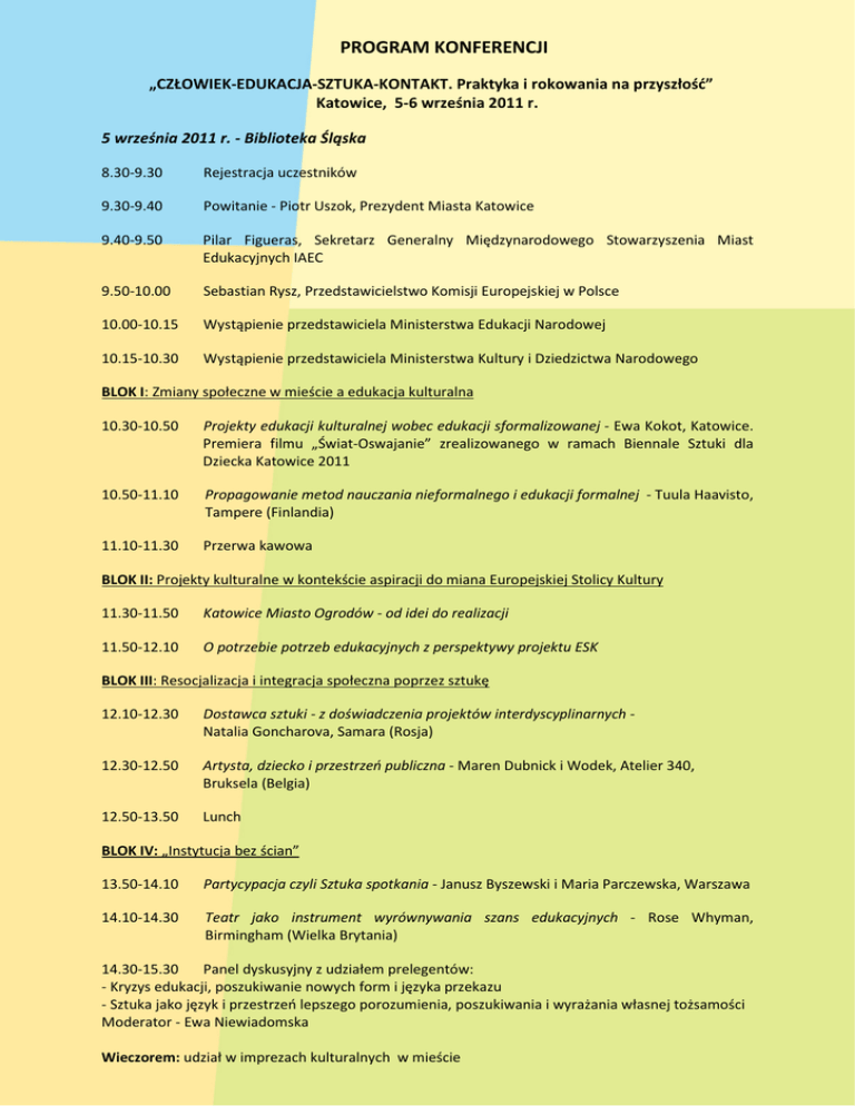 PROGRAM KONFERENCJI „CZŁOWIEK-EDUKACJA-SZTUKA-KONTAKT. Praktyka i rokowania na przyszłość” Katowice, 5-6 września 2011 r. 5 września 2011 r. - Biblioteka Śląska 8.30-9.30 Rejestracja uczestników 9.30-9.40 Powitanie - Piotr Uszok, Prezydent Miasta Katowice 9.40-9.50 Pilar Figueras, Sekretarz Generalny Międzynarodowego Stowarzyszenia Miast Edukacyjnych IAEC 9.50-10.00 Sebastian Rysz, Przedstawicielstwo Komisji Europejskiej w Polsce 10.00-10.15 Wystąpienie przedstawiciela Ministerstwa Edukacji Narodowej 10.15-10.30 Wystąpienie przedstawiciela Ministerstwa Kultury i Dziedzictwa Narodowego BLOK I: Zmiany społeczne w mieście a edukacja kulturalna 10.30-10.50 Projekty edukacji kulturalnej wobec edukacji sformalizowanej - Ewa Kokot, Katowice. Premiera filmu „Świat-Oswajanie” zrealizowanego w ramach Biennale Sztuki dla Dziecka Katowice 2011 10.50-11.10 Propagowanie metod nauczania nieformalnego i edukacji formalnej - Tuula Haavisto, Tampere (Finlandia) 11.10-11.30 Przerwa kawowa BLOK II: Projekty kulturalne w kontekście aspiracji do miana Europejskiej Stolicy Kultury 11.30-11.50 Katowice Miasto Ogrodów - od idei do realizacji 11.50-12.10 O potrzebie potrzeb edukacyjnych z perspektywy projektu ESK BLOK III: Resocjalizacja i integracja społeczna poprzez sztukę 12.10-12.30 Dostawca sztuki - z doświadczenia projektów interdyscyplinarnych Natalia Goncharova, Samara (Rosja) 12.30-12.50 Artysta, dziecko i przestrzeń publiczna - Maren Dubnick i Wodek, Atelier 340, Bruksela (Belgia) 12.50-13.50 Lunch BLOK IV: „Instytucja bez ścian” 13.50-14.10 Partycypacja czyli Sztuka spotkania - Janusz Byszewski i Maria Parczewska, Warszawa 14.10-14.30 Teatr jako instrument wyrównywania szans edukacyjnych - Rose Whyman, Birmingham (Wielka Brytania) 14.30-15.30 Panel dyskusyjny z udziałem prelegentów: - Kryzys edukacji, poszukiwanie nowych form i języka przekazu - Sztuka jako język i przestrzeń lepszego porozumienia, poszukiwania i wyrażania własnej tożsamości Moderator - Ewa Niewiadomska Wieczorem: udział w imprezach kulturalnych w mieście 6 września 2011 r. – Hotel Campanile 9.00-11.00 Prezentacja działalności Międzynarodowego Stowarzyszenia Miast Edukacyjnych IAEC Spotkanie miast członkowskich sieci Europy Środkowej IAEC oraz miast zainteresowanych przynależnością do organizacji. Finał międzynarodowego edukacyjnego konkursu ekologicznego „Zapuść korzenie w swoim mieście”. Warsztaty twórcze w instytucjach sztuki, placówkach oświatowych i przestrzeni Miasta Warsztaty otwarte: 12.00 Warsztaty twórcze wobec literatury (nr 1) - Rose Whyman, Biblioteka Śląska - odbiorca: grupa gimnazjalna wraz z opiekunem 13.00 Rosyjska sztuka współczesna (nr 2) - Natalia Goncharova, Galeria Sztuki Współczesnej BWA w Katowicach - wykład dla edukatorów sztuki, animatorów kultury, artystów i wszystkich zainteresowanych 15.00 Akcja artystyczna w przestrzeni publicznej (nr 3) - Janusz Byszewski, Ewa Kokot i członkowie INSEA Poland, ul. Stawowa 15.00 Akcja artystyczna w przestrzeni publicznej „Od drzewa do drzewa” (nr 4) - Jacek Bożek i Klub Gaja, ul. Mariacka Warsztaty zamknięte: 13.00 Warsztaty twórcze dla osób niepełnosprawnych „Wspólny pokój” - Aleksandra Włodarczyk, Centrum Kultury Katowice - we współpracy z mieszkańcami Domu Pomocy Społecznej w Orzeszu 14.00 Wokół prac artystki Beat Zoderer - Maren Dubnick, Zespół Szkół Plastycznych 16.00 Akcja plastyczna dla osób 60+ - Maria Parczewska i członkowie INSEA Poland, plac Miarki - we współpracy z Uniwersytetem Trzeciego Wieku w Katowicach Partnerzy: Organizatorzy: Patronat: Współorganizatorzy: