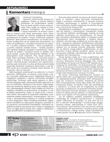 AKTUALNOŚCI Komentarz miesiąca Szanowni mieszkańcy, Kwiecień zdominowały sprawy porządkowe. Święta są zawsze dobrym pretekstem do posprzątania miasta. Przy tej okazji wyszło na jaw wiele potrzeb, które nigdy nie zostały w Puszczykowie rozwiązane. Nie grabiono z reguły trawników na wiosnę i sprzątano je dopiero przy okazji pierwszego cięcia trawy. Problemem okazała się również pielęgnacja bratków posadzonych na rondzie i innych, nielicznych miejskich skwerach. Brak systemu nawadniania, czy choćby możliwości podłączenia się do hydrantów powodował, że roślin nie podlewano, a kwiatów przezornie nie sadzono. Z punktu widzenia budżetu – same oszczędności, z punktu widzenia estetyki miasta – niestety porażka. Tym bardziej dziękuję wszystkim mieszkańcom, którzy chwycili za grabie i wyczyścili tereny w pobliżu własnych posesji, nawet jeśli teoretycznie należało to do obowiązków służb miejskich. Przy okazji prośba do osób, które zamiatają chodniki o nie zrzucanie piasku i śmieci na ulicę. Z uwagi na szczupłe finanse częstotliwość mechanicznego zamiatania jest ograniczona, podczas gdy zmiecione na ulicę zanieczyszczenia będą zapychały studzienki kanalizacji deszczowej, a pył będzie unosił się w powietrzu brudząc nasze ubrania, samochody i okna w domach. Braki rozwiązań systemowych są widoczne i w innych obszarach. Obiektywnie, nie zawsze z winy miasta, a często z powodu wadliwego prawa. Najbardziej dotyczy to niespójnych przepisów z zakresu zachowania porządku publicznego. Ponieważ wiele spraw zapisano w dokumencie wyższego rzędu, którym jest Kodeks wykroczeń, to nie ma możliwości wpisania ich do prawa miejscowego, które jest podstawą egzekucji przez straż miejską. Zgodnie z obowiązującym prawem straż miejska nie może np. nakładać mandatów za przewinienia na drogach, w tym za błędne parkowanie, chyba, że wiąże się to z niszczeniem zieleni. Nie zwalnia to oczywiście strażników z prowadzenia działań edukacyjnych i prewencyjnych. Tym nie mniej z niecierpliwością czekamy na zmianę przepisów o ruchu drogowym, które umożliwią strażnikom wypisywania mandatów za wykroczenia drogowe i pozwolą im na ponowne uruchomienie fotoradarów. Generalnie zagadnienia systemu poruszania się w mieście i uspokojenia ruchu są ciągle jeszcze przed nami i będą w najbliższym czasie przedmiotem szczegółowej analizy. Echo Puszczykowa Wydawca: Adres redakcji: Telefon: e-mail: Urząd Miasta Puszczykowa ul. Podleśna 4 061 813 32 25, 061 898 37 00 [email protected] www.puszczykowo.pl Redakcja zastrzega sobie prawo do skracania i zmiany tytułów dostarczanych materiałów. Anonimów nie publikujemy. Autor tekstu ma prawo zastrzec swoje dane do wiadomości redakcji. 2 ECHO PUSZCZYKOWA Pozwolę sobie odnieść się jeszcze do dwóch spraw, które w ostatnim czasie poruszyły mieszkańców. Myślę o proteście mieszkańców w sprawie otwarcia oddziału ratunkowego w szpitalu w Puszczykowie oraz zamknięciu ścieżki rowerowej na odcinku od granicy z Łęczycą do Dworca PKP. Zdecydowanie wolałabym, by profil działania szpitala był zbieżny z rekreacyjnym charakterem miasta i by zamiast oddziału ratunkowego mieściły się tutaj oddziały sanatoryjne czy rehabilitacyjne. W sytuacji gdy ratunkowa działalność będzie w zasadzie usankcjonowaniem stanu istniejącego, a nadanie statusu oddziału ratunkowego zwiększy po prostu jego standard i przysporzy szpitalowi dodatkowych pieniędzy, trudno jednak protestować. Nie mając najmniejszego wpływu ani na decyzje przeszłe dotyczące szpitala, ani na obecne mogę jedynie zadeklarować, że jako burmistrz miasta dołożę wszelkich starań, by funkcjonowanie oddziału ratunkowego było jak najmniej uciążliwe dla mieszkańców. Druga sprawa wiąże się z inną uciążliwością, tym razem osób, które wybierają się na przejażdżkę rowerową. Budowana jesienią ubiegłego roku ścieżka prowadząca od Łęczycy do dworca PKP okazała się inwestycją nie zamkniętą i nie dopuszczoną do użytkowania. W tej sytuacji zmuszona byłam podjąć decyzję o jej zamknięciu. Niezbędne prace ziemne zostaną zakończone do końca kwietnia i wierzę, że cykliści będą mogli znów bezpiecznie wyruszyć na trasę. Na koniec informacja optymistyczna. Rzutem na taśmę udało nam się przygotować projekt techniczny na zagospodarowanie otwartych stref rekreacyjnych pod tzw. fundusze norweskie. Podobnie jak ponad 450 wnioskodawców mamy tylko około 5% szans na otrzymanie dotacji. To bardzo mało, ale wychodzimy z założenia, że nawet jeśli nie znajdziemy się wśród tej grupy szczęśliwców, to powstał konkretny projekt, który wyznacza kierunek działania na przyszłość i na pewno w ograniczonym zakresie i w dłuższej perspektywie czasu będzie w Puszczykowie realizowany. Już po oddaniu projektu zyskaliśmy dodatkową motywację do podjęcia wyznaczonych w projekcie zadań. Wierzymy, że wszystko, co uda nam się zrobić w zakresie rekreacyjnego i turystycznego przygotowania miasta, zaprocentuje w czasie Euro 2012. Puszczykowo może bowiem stać się centrum odnowy i wypoczynku dla sportowców i turystów, którzy zjadą na mistrzostwa z całego świata, czego Mieszkańcom i sobie gorąco życzę. Małgorzata Ornoch-Tabędzka redaguje zespół: redaktor naczelny: Ewa Stasiak, [email protected] współpraca: Maciej Dettlaff, Anna Gonet, Barbara Mulczyńska, Katarzyna Nowak, Agnieszka Zielińska zdjęcia: Katarzyna Nowak, [email protected] opracowanie graficzne: Artwork – grafika i reklama, [email protected] skład tekstów, korekta: redakcja druk: Studio ARTpress, Kraków, 2800 egz. KWIECIEŃ 2007