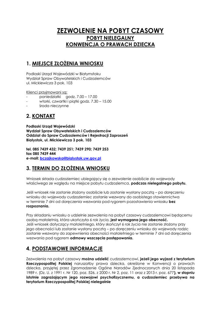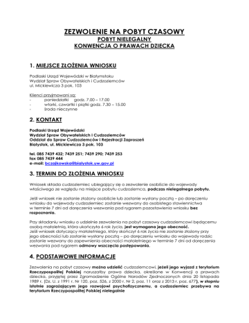 ZEZWOLENIE NA POBYT CZASOWY POBYT NIELEGALNY KONWENCJA O PRAWACH DZIECKA 1. MIEJSCE ZŁOŻENIA WNIOSKU Podlaski Urząd Wojewódzki w Białymstoku Wydział Spraw Obywatelskich i Cudzoziemców ul. Mickiewicza 3 pok. 103 Klienci przyjmowani są: poniedziałki godz. 7.00 – 17.00 wtorki, czwartki i piątki godz. 7.30 – 15.00 środa nieczynne 2. KONTAKT Podlaski Urząd Wojewódzki Wydział Spraw Obywatelskich i Cudzoziemców Oddział do Spraw Cudzoziemców i Rejestracji Zaproszeń Białystok, ul. Mickiewicza 3 pok. 103 tel. 085 7439 432; 7439 251; 7439 290; 7439 253 fax 085 7439 444 e-mail: [email protected] 3. TERMIN DO ZŁOŻENIA WNIOSKU Wniosek składa cudzoziemiec ubiegający się o zezwolenie osobiście do wojewody właściwego ze względu na miejsce pobytu cudzoziemca, podczas nielegalnego pobytu. Jeśli wniosek nie zostanie złożony osobiście lub zostanie wysłany pocztą – po doręczeniu wniosku do wojewody cudzoziemiec zostanie wezwany do osobistego stawiennictwa w terminie 7 dni od doręczenia wezwania pod rygorem pozostawienia wniosku bez rozpoznania. Przy składaniu wniosku o udzielnie zezwolenia na pobyt czasowy cudzoziemcowi będącemu osobą małoletnią, która ukończyła 6 rok życia, jest wymagana jego obecność. Jeśli wniosek dotyczący małoletniego, który skończył 6 rok życia nie zostanie złożony przy jego obecności lub zostanie wysłany pocztą – po doręczeniu wniosku do wojewody rodzic zostanie wezwany do zapewnienia obecności małoletniego w terminie 7 dni od doręczenia wezwania pod rygorem odmowy wszczęcia postępowania. 4. PODSTAWOWE INFORMACJE Zezwolenia na pobyt czasowy można udzielić cudzoziemcowi, jeżeli jego wyjazd z terytorium Rzeczypospolitej Polskiej naruszałby prawa dziecka, określone w Konwencji o prawach dziecka, przyjętej przez Zgromadzenie Ogólne Narodów Zjednoczonych dnia 20 listopada 1989 r. (Dz. U. z 1991 r. Nr 120, poz. 526, z 2000 r. Nr 2, poz. 11 oraz z 2013 r. poz. 677), w stopniu istotnie zagrażającym jego rozwojowi psychofizycznemu, a cudzoziemiec przebywa na terytorium Rzeczypospolitej Polskiej nielegalnie 2 a okoliczność, która jest podstawą ubiegania się o to zezwolenie, uzasadnia pobyt na terytorium Rzeczypospolitej Polskiej przez okres dłuższy niż 3 miesiące. Zezwolenia na pobyt czasowy udziela się na okres nie dłuższy niż 3 lata. Zezwolenia na pobyt czasowy udziela lub odmawia udzielenia wojewoda właściwy ze względu na miejsce pobytu cudzoziemca, w drodze decyzji. Wniosek o udzielenie zezwolenia na pobyt czasowy cudzoziemiec składa na formularzu. Od cudzoziemca ubiegającego się o udzielenie zezwolenia na pobyt czasowy pobiera się odciski linii papilarnych. W przypadku, gdy pobranie odcisków linii papilarnych od cudzoziemca jest fizycznie niemożliwe, odcisków tych nie pobiera się. 5. WYMAGANE DOKUMENTY wypełniony zgodnie z pouczeniem formularz wniosku, 4 fotografie osoby, której wniosek dotyczy - spełniające następujące wymagania - nieuszkodzone, kolorowe, o dobrej ostrości; - wymiary 35 mm x 45 mm; - wykonane nie wcześniej niż w ciągu 6 miesięcy przed dniem złożenia wniosku; - przedstawiające wizerunek twarzy cudzoziemca od wierzchołka głowy do górnej części barków, tak aby twarz zajmowała 70-80% fotografii, na jednolitym jasnym tle, w pozycji frontalnej, patrzącego na wprost z otwartymi oczami, nieprzesłoniętymi włosami, z naturalnym wyrazem twarzy i zamkniętymi ustami, a także odwzorowują naturalny kolor jego skóry; - przedstawiające wyraźnie oczy cudzoziemca, a zwłaszcza źrenice, linia oczu cudzoziemca jest równoległa do górnej krawędzi fotografii. ważny dokument podróży (w szczególnie uzasadnionym przypadku, gdy cudzoziemiec nie posiada ważnego dokumentu podróży i nie ma możliwości jego uzyskania, może przedstawić inny dokument potwierdzający tożsamość), Brak, któregokolwiek z wyżej wymienionych dokumentów spowoduje wezwanie cudzoziemca do jego uzupełnienia w terminie 7 dni od doręczenia wezwania pod rygorem pozostawienia wniosku bez rozpoznania. dokumenty potwierdzające stan psychofizyczny dziecka, dokumenty potwierdzające istnienie więzi rodzinnych z małoletnim cudzoziemcem (np. akt urodzenia dziecka), opłata skarbowa. Dokumenty powinny być: sporządzone w języku polskim; oryginałami lub kopiami potwierdzonymi urzędowo za zgodność z oryginałem; zamiast oryginału dokumentu cudzoziemiec może złożyć odpis dokumentu, jeżeli jego zgodność z oryginałem została poświadczona przez notariusza albo przez występującego w sprawie pełnomocnika cudzoziemca – będącego adwokatem, radcą prawnym, rzecznikiem patentowym lub doradcą podatkowym – nie dotyczy dokumentów tożsamości (podróży); 3 przetłumaczone na język polski przez tłumacza przysięgłego – w przypadku dokumentów sporządzonych w języku obcym, służących za dowód w postępowaniu (nie dotyczy dokumentu podróży). Cudzoziemiec może działać przez pełnomocnika, chyba że charakter czynności wymaga jej osobistego działania. Pełnomocnikiem może być osoba fizyczna posiadająca zdolność do czynności prawnych. pełnomocnictwo powinno być udzielone na piśmie lub zgłoszone do protokołu; pełnomocnik dołącza do akt oryginał lub urzędowo poświadczony odpis pełnomocnictwa; wraz z pełnomocnictwem do akt sprawy należy dołączyć dowód wniesienia opłaty skarbowej w wysokości 17 PLN; udzielone pełnomocnictwo powinno upoważniać do reprezentowania cudzoziemca w konkretnym postępowaniu zarówno przed właściwym wojewodą jaki i przed Szefem Urzędu do Spraw Cudzoziemców. 6. FORMULARZ WNIOSKU DO POBRANIA 7. OPŁATA ZA ZEZWOLENIE NA ZAMIESZKANIE NA POBYT CZASOWY Opłata skarbowa za udzielenie zezwolenia na pobyt czasowy wynosi: 340 PLN. Na terenie Podlaskiego Urzędu Wojewódzkiego w Białymstoku nie ma możliwości dokonania opłaty skarbowej. Zapłaty opłaty skarbowej można dokonać gotówką – bez prowizji –w 