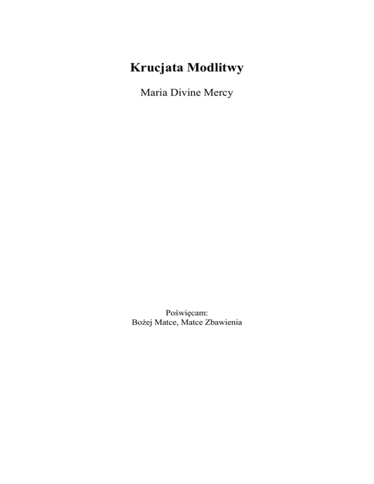 Krucjata Modlitwy Maria Divine Mercy Poświęcam: Bożej Matce, Matce Zbawienia Krucjata Modlitw Modlitwy podyktowane przez Niebo Lokucje przekazane Marii Bożego Miłosierdzia – Maria Divine Mercy – od listopada 2011 Modlitwy Krucjaty Modlitwy Litanie Krucjaty Modlitwy Inne Modlitwy Angielski oryginał na stronie: www.thewarningsecondcoming.com Geneza powstania tego Modlitewnika Modlitwy zawarte w tej książeczce nie pochodzą od człowieka. Zostały one przekazane zwyczajnej kobiecie, mężatce i matce, żyjącej w Europie, która została wezwana, aby głosić Słowo Boże. Otrzymała ona ponad 700 orędzi z nieba w codziennych przekazach od listopada 2010 roku, pragnąc przy tym pozostać nieznaną i poza jakąkolwiek sławą. Wszystkie te orędzia stanowią główną treść strony internetowej: www.thewarningsecondcoming.com Orędzia te odsłaniają Boży Plan wobec umierającego świata, dotyczący tego wszystkiego, co ujawni się w czasach ostatecznych, wiodących do Drugiego Przyjścia Jezusa Chrystusa. Owe wizje, orędzia i modlitwy zostały jej przekazane za pośrednictwem Ducha Świętego i są przedstawione w tej książeczce tak, jak zostały podyktowane tej Bożej służebnicy o imieniu Maria Bożego Miłosierdzia. Tak samo było za dni, gdy narodził się Jezus – Bóg wysłał swojego proroka, Jana Chrzciciela, aby „prostował drogę Pańską” i ostrzegł naród Izraela, że proroctwa Izajasza, dotyczące Mesjasza, wkrótce się wypełnią. Orędzie Jana wzywało ludzi, aby się przygotowali na przyjście Mesjasza poprzez pokutę i duchowe oczyszczenie. Dzisiaj jest nam przekazywane to samo orędzie – że Mesjasz wkrótce powróci i że musimy być na to duchowo przygotowani. W przeciwnym wypadku zostaniemy zaskoczeni i staniemy przed Bogiem w śmiertelnym zawstydzeniu, bo nasze grzechy zostaną bez ogródek odsłonięte i ogarnie nas szok, którego nie można sobie w ogóle wyobrazić czy pojąć. Na przestrzeni historii Boży prorocy byli odrzucani, czego najjaskrawszym przykładem jest Jedyny Syn Boga, Który został ukrzyżowany przez tych samych ludzi, których przyszedł ocalić. Moglibyśmy przypuszczać, że dzisiaj Boży wysłannicy, a w rzeczywistości Sam Bóg może nie zostać przyjęty inaczej, niż za dni Jana Chrzciciela. A jednak jest naszym obowiązkiem, by uważnie słuchać tych głosów „wołających na pustyni”, nawołujących nas, aby porzucić wszystko, co jest grzeszne, i powrócić do naszego Stworzyciela z otwartymi sercami, chętnymi na przyjęcie od Boga przebaczenia i Jego Łaski. Odrzucenie tych orędzi – bez zastanowienia się – naraża nas na to samo niebezpieczeństwo, co tych, którzy odrzucili Jana Chrzciciela, a następnie Syna Bożego, Jezusa Chrystusa. Dzięki przyjęciu Bożej Prawdy i podążaniu za nią, gdziekolwiek nas ona nie powiedzie, stajemy się jak rodziny Noego i Lota, i możemy zostać oszczędzeni od nadchodzących kar, które wkrótce zostaną wylane na ten urągliwy i zeświecczały świat. Chociaż czas ucieka, Jezus wyciąga do nas Swoją Dłoń pojednania, tak aby żadna dusza nie została zgubiona. Nieważne, jak daleko zabłądziliśmy, oddalając się od Jezusa, gdyż poprzez przyjęcie Jego Miłosierdzia i zezwalając Mu na wejście do naszych serc, ciągle możemy poznać radość zostania pojednanym z naszym Stworzycielem, gdy wkroczymy do Wiecznego Królestwa Bożego. Kiedy będziecie czytać modlitwy zapisane w tej książeczce, otwórzcie wasze serce i módlcie się, aby Duch Święty do was przemówił, oświecił wasze serce i udzielił wam łaski, abyście rozpoznali źródło, z którego pochodzą słowa, znajdujące się na niniejszych stronach. Uwaga dla polskich Czytelników: Pisownia małą i wielką literą nie zawsze odpowiada zasadom polskiej pisowni, co podyktowane jest chęcią podkreślenia bądź uroczystego, bądź szczególnie pozytywnego, bądź szczególnie negatywnego znaczenia niektórych pojęć, nazw i tytułów. Krucjaty Modlitwy i Litanie Spis Treści Modlitwy Krucjaty Modlitwy Modlitwy dla kapłanów zaznaczone są tłustym drukiem (1) Mój dar dla Jezusa, dla ratowania dusz 17 listopada 2011 (2) Modlitwa za światowych przywódców 18 listopada 2011 (3) Uwolnić świat od lęku 19 listopada 2011 (4) Zjednoczyć wszystkie Rodziny 20 listopada 2011 (5) Chwała Bogu Najwyższemu 21 listopada 2011 (6) Modlitwa o powstrzymanie antychrysta 22 listopada 2011 (7) Modlitwa za odrzucających Miłosierdzie 22 listopada 2011 (8) Spowiedź 22 listopada 2011 (9) Ofiarowanie cierpienia jako daru 28 listopada 2011 (10) Nieść płomień Twojej miłości 29 listopada 2011 (11) Powstrzymanie nienawiści wobec wizjonerów 30 listopada 2011 (12) Modlitwa o uniknięcie Grzechu Pychy 3 grudnia 2011 (13) Modlitwa o ochronę od potępienia 11 grudnia 2011 (14) Modlitwa do Boga Ojca o ochronę przed Wojną Atomową 14 grudnia 2011 (15) Podziękowanie za dar Bożego Miłosierdzia 15 grudnia 2011 (16) Przyjęcie łask ofiarowanych podczas Ostrzeżenia 31 grudnia 2011 (17) Modlitwa do Matki Zbawienia za Ciemne Dusze 1 stycznia 2012 (18) Powstrzymanie antychrysta i jego grupy 11 stycznia 2012 (19) Modlitwa za młodych ludzi 13 stycznia 2012 (20) Powstrzymanie antychrysta od zniszczenia świata 19 stycznia 2012 (21) Dziękczynienie Bogu Ojcu za zbawienie ludzkości 24 stycznia 2012 (22) Dla Księży katolickich o podtrzymywanie nauczania Kościoła 27 stycznia 2012 (23) Modlitwa o bezpieczeństwo dla Benedykta XVI 28 stycznia 2012 (24) Odpust zupełny dla rozgrzeszenia 31 stycznia 2012 (25) O Ochronę dla wizjonerów z całego świata 4 lutego 2012 (26) Módlcie się na Różańcu, aby uratować swój naród 5 lutego 2012 (27) Modlitwa o Pokój na Świecie 6 lutego 2012 (28) Maryja Panna: modlitwa o zjednoczenie wszystkich Kościołów Chrześcijańskich 8 lutego 2012 (29) O ochronę chrześcijańskich praktyk religijnych 12 lutego 2012 (30) Bóg Ojciec: Modlitwa o uniknięcie wojny, głod