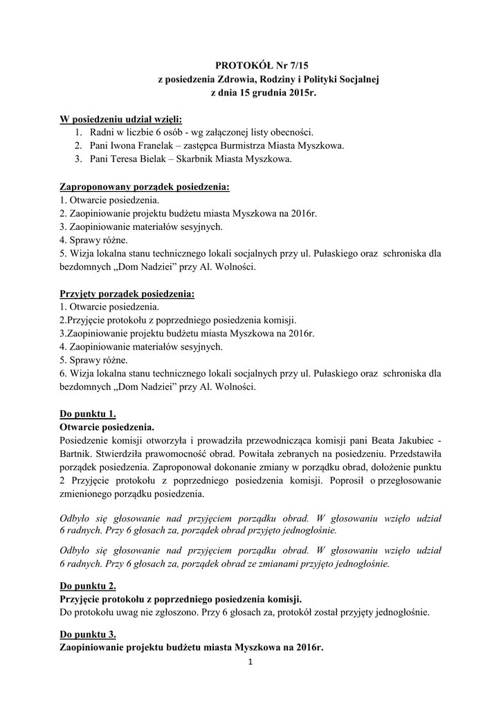 PROTOKÓŁ Nr 7/15 z posiedzenia Zdrowia, Rodziny i Polityki Socjalnej z dnia 15 grudnia 2015r. W posiedzeniu udział wzięli: 1. Radni w liczbie 6 osób - wg załączonej listy obecności. 2. Pani Iwona Franelak – zastępca Burmistrza Miasta Myszkowa. 3. Pani Teresa Bielak – Skarbnik Miasta Myszkowa. Zaproponowany porządek posiedzenia: 1. Otwarcie posiedzenia. 2. Zaopiniowanie projektu budżetu miasta Myszkowa na 2016r. 3. Zaopiniowanie materiałów sesyjnych. 4. Sprawy różne. 5. Wizja lokalna stanu technicznego lokali socjalnych przy ul. Pułaskiego oraz schroniska dla bezdomnych „Dom Nadziei” przy Al. Wolności. Przyjęty porządek posiedzenia: 1. Otwarcie posiedzenia. 2.Przyjęcie protokołu z poprzedniego posiedzenia komisji. 3.Zaopiniowanie projektu budżetu miasta Myszkowa na 2016r. 4. Zaopiniowanie materiałów sesyjnych. 5. Sprawy różne. 6. Wizja lokalna stanu technicznego lokali socjalnych przy ul. Pułaskiego oraz schroniska dla bezdomnych „Dom Nadziei” przy Al. Wolności. Do punktu 1. Otwarcie posiedzenia. Posiedzenie komisji otworzyła i prowadziła przewodnicząca komisji pani Beata Jakubiec Bartnik. Stwierdziła prawomocność obrad. Powitała zebranych na posiedzeniu. Przedstawiła porządek posiedzenia. Zaproponował dokonanie zmiany w porządku obrad, dołożenie punktu 2 Przyjęcie protokołu z poprzedniego posiedzenia komisji. Poprosił o przegłosowanie zmienionego porządku posiedzenia. Odbyło się głosowanie nad przyjęciem porządku obrad. W głosowaniu wzięło udział 6 radnych. Przy 6 głosach za, porządek obrad przyjęto jednogłośnie. Odbyło się głosowanie nad przyjęciem porządku obrad. W głosowaniu wzięło udział 6 radnych. Przy 6 głosach za, porządek obrad ze zmianami przyjęto jednogłośnie. Do punktu 2. Przyjęcie protokołu z poprzedniego posiedzenia komisji. Do protokołu uwag nie zgłoszono. Przy 6 głosach za, protokół został przyjęty jednogłośnie. Do punktu 3. Zaopiniowanie projektu budżetu miasta Myszkowa na 2016r. 1 Pani Skarbnik powiedziała, że wczoraj przyszła opinia z RIO odnośnie projektu uchwały budżetowej na 2016r. Opinia jest pozytywna, nie ma żadnych uwag. Druga opinia jest o projekcie uchwały w sprawie Wieloletniej Prognozy Finansowej. Ona jest też pozytywna. Opinia ta zawiera jedną uwagę, dla mnie to omyłka. W kolumnie 10.1 w latach 2020 – 2022 nieprawidłowo określono kwoty spłat kredytów i pożyczek z wypłaconej nadwyżki budżetowej. Pracownik, który kiedyś opracowywał WPF jest na zwolnieniu chorobowym od sierpnia, w tej chwili sami borykamy się z WPF i wkradła się taka bzdura. Do 2020r. te kwoty są nierówne z tą kwotą ogólną. Na poprzednich komisjach mówiłam o autopoprawce Burmistrza, że będzie związana z sesja nadzwyczajną. Chodzi o zabezpieczenie środków na budowę drogi w ul. Klonowej i Sadowej oraz ogródka rekreacyjnego, zmniejszane będą środki z ul. Wapiennej. To samo co zadziało się na sesji nadzwyczajnej, teraz trzeba dostosować to do budżetu na 2016r. Odbyło się głosowanie. W głosowaniu uczestniczyło 6 radnych przy 6 głosach za, projekt w sprawie budżetu miasta na 2016 rok został zaopiniowany pozytywnie jednogłośnie. Odbyło się głosowanie. W głosowaniu uczestniczyło 6 radnych przy 6 głosach za, projekt w sprawie uchwalenia Wieloletniej Prognozy Finansowej Gminy Myszków na lata 2015- 2031 został zaopiniowany pozytywnie jednogłośnie. Do Komisji Finansów i Budżetu została skierowana opinia: Po omówieniu na posiedzeniu w dniu 11 grudnia 2015r. projektu budżetu na 2016 rok Komisja Zdrowia, Rodziny i Polityki Socjalnej w Myszkowie pozytywnie jednogłośnie zaopiniowała projekt budżetu na 2016r. Do punktu 4. Zaopiniowanie materiałów sesyjnych. 1/ Projekt uchwały w sprawie uchwalenia budżetu miasta na 2016 rok. Odbyło się głosowanie. W głosowaniu uczestniczyło 6 radnych przy 6 głosach za, projekt uchwały został zaopiniowany pozytywnie jednogłośnie. 2/ Projekt uchwały w sprawie Wieloletniej Prognozy Finansowej Gminy Myszków na lata 2016- 2031. Odbyło się głosowanie. W głosowaniu uczestniczyło 6 radnych przy 6 głosach za, projekt uchwały został zaopiniowany pozytywnie jednogłośnie. 3/ Projekt uchwały w sprawie uchwalenia Gminnego Programu Profilaktyki i Rozwiązywania Problemów Alkoholowych dla Miasta Myszkowa na 2016r. Odbyło się głosowanie. W głosowaniu uczestniczyło 6 radnych przy 6 głosach za, projekt uchwały został zaopiniowany pozytywnie jednogłośnie. 4/ Projekt uchwały w sprawie uchwalenia Gminnego Programu Przeciwdziałania Narkomanii dla Miasta Myszkowa na 2016r. 2 Odbyło się głosowanie. W głosowaniu uczestniczyło 6 radnych przy 6 głosach za, projekt uchwały został zaopiniowany pozytywnie jednogłośnie. Do punktu 5. Sprawy różne. Spraw różnych nie zgłoszono. Do punktu 6. Wizja lokalna stanu technicznego lokali socjalnych przy ul. Pułaskiego oraz schroniska dla bezdomnych „Dom Nadziei” przy Al. Wolności. Wszyscy członkowie Komisji Zdrowia, Rodziny i Polityki Socjalnej uczestniczyli w wizji lokalnej, której celem było zapoznanie się ze stanem technicznym lokali socjalnych oraz schroniska dla bezdomnych „Dom Nadziei” przy Al. Wolności. Trasa objazdu wiodła od internatu przy ul. Pułaskiego w Myszkowie, a została zakończona w „Domu Nadziei” przy Al. Wolności w Myszkowie, trwała dwie godziny. Na zakończenie wizji lokalnej w internacie, która pozwoliła zwłaszcza nowym radnym poznać problemy związane ze stanem technicznym budynku zostało zgłoszonych kilka uwag. Radny Krzysztof Kłosowicz zaproponował, żeby zabezpieczyć okna przed zimą i wandalami. Stan budynku na dole jest najlepszy. Radna Zofia Jastrzębska zwróciła uwagę, że parkiet może być do odzyskania i również była zdania, że należy zabezpieczyć okna. Pani Burmistrz dodała, że tu będzie bardzo poważny remont. Część parkietu wykorzystaliśmy do sali sesyjnej i sa