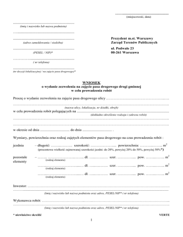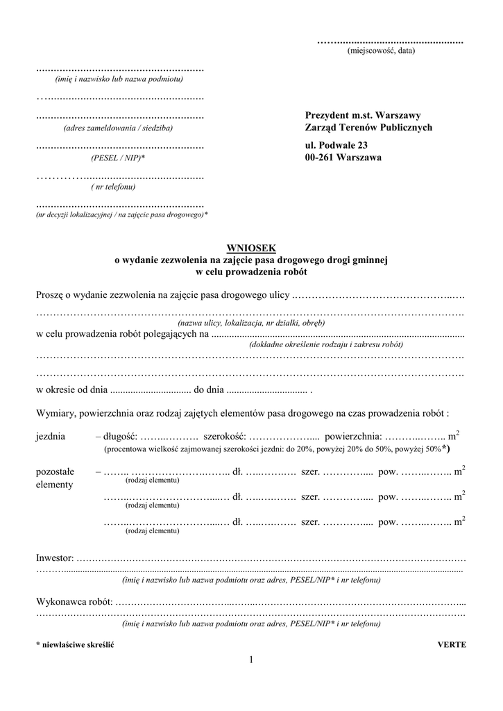……............................................. (miejscowość, data) ......................................................... (imię i nazwisko lub nazwa podmiotu) …..................................................... ......................................................... Prezydent m.st. Warszawy Zarząd Terenów Publicznych (adres zameldowania / siedziba) ......................................................... ul. Podwale 23 00-261 Warszawa (PESEL / NIP)* …………......................................... ( nr telefonu) ......................................................... (nr decyzji lokalizacyjnej / na zajęcie pasa drogowego)* WNIOSEK o wydanie zezwolenia na zajęcie pasa drogowego drogi gminnej w celu prowadzenia robót Proszę o wydanie zezwolenia na zajęcie pasa drogowego ulicy .………………………………………..…. ………………………………………………………………………………………………………………. (nazwa ulicy, lokalizacja, nr działki, obręb) w celu prowadzenia robót polegających na .................................................................................................... (dokładne określenie rodzaju i zakresu robót) ………………………………………………………………………………………………………………. ………………………………………………………………………………………………………………. w okresie od dnia ................................ do dnia ................................ . Wymiary, powierzchnia oraz rodzaj zajętych elementów pasa drogowego na czas prowadzenia robót : jezdnia – długość: ……..………. szerokość: ……………….... powierzchnia: ………..…….. m2 (procentowa wielkość zajmowanej szerokości jezdni: do 20%, powyżej 20% do 50%, powyżej 50% *) pozostałe elementy – …….. ………………….…….. dł. …..…….…. szer. ………….... pow. ……..…….. m2 (rodzaj elementu) ……..……………………....… dł. …..….……. szer. ………….... pow. ……..…….. m2 (rodzaj elementu) ……..……………………....… dł. …..….……. szer. ………….... pow. ……..…….. m2 (rodzaj elementu) Inwestor: ……………………………………………………………………………………………………………… ………............................................................................................................................................................................ (imię i nazwisko lub nazwa podmiotu oraz adres, PESEL/NIP* i nr telefonu) Wykonawca robót: ………………………………..……..…………………………………………………………... …………………………………………………………………………………………………………………………. (imię i nazwisko lub nazwa podmiotu oraz adres, PESEL/NIP* i nr telefonu) * niewłaściwe skreślić VERTE 1 Do wniosku o wydanie zezwolenia na zajęcie pasa drogowego dołączam: (właściwe pole należy zaznaczyć krzyżykiem) 1) szczegółowy plan sytuacyjny w skali 1:1000 / 1:500*, z zaznaczeniem granic i podaniem wymiarów planowanej powierzchni zajęcia pasa drogowego (plan sytuacyjny - tzw. podkład geodezyjny - można nabyć w Ośrodku Dokumentacji Geodezyjnej i Kartograficznej Biura Geodezji i Katastru Urzędu m. st. Warszawy – ul. Sandomierska 12 (budynek B1), 2) projekt organizacji ruchu nr ………………………… związany z robotami prowadzonymi w pasie drogowym, określający sposób zabezpieczenia tych robót zgodnie z wymogami bezpieczeństwa ruchu drogowego - zatwierdzony przez Inżyniera Ruchu m.st. Warszawy (ul. Marszałkowska 77/79) (jeżeli zajęcie pasa drogowego wpływa na ruch drogowy lub ogranicza widoczność na drodze albo powoduje wprowadzenie zmian w istniejącej organizacji ruchu pojazdów lub pieszych), 3) ogólny plan orientacyjny w skali 1:10 000 / 1:25 000* z zaznaczeniem zajmowanego odcinka pasa drogowego oraz informację o sposobie zabezpieczenia robót (jeżeli nie jest wymagany projekt organizacji ruchu), 4) oświadczenie inwestora: - o posiadaniu ważnego pozwolenia na budowę obiektu umieszczanego w pasie drogowym*, - o zgłoszeniu budowy*, - o zgłoszeniu prowadzonych robót*, 5) odpis z Krajowego Rejestru Sądowego / Ewidencji Działalności Gospodarczej* (jeżeli wnioskodawca jest podmiotem prowadzącym działalność gospodarczą) , 6) pełnomocnictwo - z oryginałem dokumentu potwierdzającego wniesienie opłaty skarbowej (jeżeli wnioskodawca reprezentowany będzie w postępowaniu przez pełnomocnika) , oraz dodatkowe dokumenty na żądanie zarządcy drogi: 7) projekt budowlany obiektu umieszczanego w pasie drogowym, 8) harmonogram robót prowadzonych w pasie drogowym (w przypadku etapowego prowadzenia robót), 9) inne: ………………………………………………………………………………………………… 10) inne: ………………………………………………………………………………………………… 11) inne: ………………………………………………………………………………………………… Forma odbioru decyzji: osobiście / pocztą* ................................................... ( podpis osoby składającej wniosek ) * niewłaściwe skreślić Druk:WIR-01-01/z.1 2