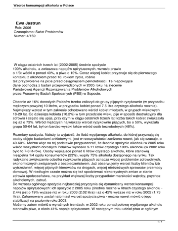 Wzorce konsumpcji alkoholu w Polsce Ewa Jastrun Rok: 2006 Czasopismo: Świat Problemów Numer: 4/159 W ciągu ostatnich trzech lat (2002-2005) średnie spożycie 100% alkoholu, a zwłaszcza napojów spirytusowych, wzrosło prawie o 1/3: wódki o ponad 40%, a piwa o 10%. Coraz więcej kobiet przyznaje się do pierwszego kontaktu z alkoholem przed 18. rokiem życia, rośnie też przyzwolenie na picie przed osiągnięciem pełnoletności. Te niepokojące dane pochodzą z badań przeprowadzonych w 2005 roku na zlecenie Państwowej Agencji Rozwiązywania Problemów Alkoholowych przez Pracownię Badań Społecznych (PBS) w Sopocie. Obecnie aż 16% dorosłych Polaków trzeba zaliczyć do grupy pijących ryzykownie (w przypadku mężczyzn powyżej 10 litrów, w przypadku kobiet ponad 7.5 litra czystego alkoholu rocznie). Największy wzrost w tym zakresie odnotowano wśród kobiet młodych, w grupach wiekowych 18-29 lat. Co dziesiąta kobieta (10.2%) w tym przedziale wieku pije w sposób destrukcyjny dla zdrowia i często się upija, przy czym w ciągu ostatnich trzech lat liczba takich kobiet zwiększyła się aż o 73%. Wśród mężczyzn największy wzrost ryzykownie pijących, bo o 50%, wykazała grupa 50-64 lat, był on bardzo wysoki także wśród osób bezrobotnych (48%). Rozmiary spożycia. Należy tu wyjaśnić, że ilość wypijanego alkoholu, do której przyznają się osoby objęte badaniami ankietowymi, jest w rzeczywistości zaniżona nawet, jak się szacuje, o 40-60%. Można więc na tej podstawie przypuszczać, że średnie spożycie alkoholu w 2005 roku wśród wszystkich dorosłych Polaków wynosiło 9-11 litrów czystego 100% alkoholu (w 2002 roku było to 7-8 lit-rów). Osoby wypijające ponad 6 litrów czystego alkoholu, które stanowią niespełna 1/4 ogółu konsumentów (23%), wypiły 75% alkoholu dostępnego na rynku. Tak radykalne zwiększenie odsetka ryzykownie pijących oznacza więcej problemów zdrowotnych, ekonomicznych związanych z bezpieczeństwem. Już obserwujemy wzrost liczby klientów izb wytrzeźwień, więcej pijanych kierowców na drogach, więcej nietrzeźwych sprawców przemocy domowej. W niedługim czasie można się też spodziewać niekorzystnych zmian w stanie zdrowia społeczeństwa, na przykład większej liczby przypadków marskości wątroby, psychoz alkoholowych, zatruć. Do wzrostu ogólnego spożycia najbardziej przyczynia się dynamiczny wzrost konsumpcji napojów spirytusowych: ich spożycie z 2005 roku (średnie roczne w litrach czystego alkoholu 2.44) jest o 19% wyższe niż w roku 2003 (2.02 litra) i aż o 42% wyższe niż w roku 2002 (1.73 litra). Zahamowany został natomiast wzrost spożycia piwa - można nawet mówić o jego stabilizacji na poziomie roku 2003. Możemy zatem mówić o wyraźnych trendach: w 2002 roku ponad połowę wypijanego alkoholu stanowiło piwo, a około 41% napoje spirytusowe. W następnym roku udział piwa w ogólnym 1/4 Wzorce konsumpcji alkoholu w Polsce spożyciu spadł do 48%, zaś napojów spirytusowych wzrósł do 43%. Obecne badania ujawniły, że struktura spożycia sprzed trzech lat została odwrócona: dzisiaj najwięcej alkoholu, bo ponad 47%, wypijamy w postaci wódki, a w postaci piwa - 44.5%. Udział wina w konsumpcji alkoholu jest stabilny i nadal nieznaczny, oscylujący w granicach 9%. Obserwowane zmiany są wynikiem zwiększenia się częstotliwości picia: średnie spożycie napojów spirytusowych przy jednej okazji w 2005 roku jest bardzo zbliżone do roku 2003 i nieco niższe niż w roku 2002. Odsetek abstynentów pozostaje na stałym poziomie, około 15-16%, przy czym stopniowo rośnie ich udział wśród kobiet: 23% w 2005 roku wobec 21% w 2002, a spada wśród mężczyzn (odpowiednio 11% i 8%). Najmniej abstynentów jest wśród najmłodszych badanych w wieku 18-29 lat - zanotowano tu spadek z 6.4% w 2002 do 3.1% w 2005 - kawalerów i panien, mieszkańców największych miast, osób z wykształceniem wyższym, posiadających najwyższe dochody oraz osób niewierzących i niepraktykujących. Badanie dostarcza informacji co do ilości i sposobu picia w poszczególnych kategoriach społeczno-demograficznych. I tak: - mężczyźni piją średnio 3.5-krotnie więcej alkoholu niż kobiety; - najwięcej piją osoby najmłodsze - w wieku 18-29 lat, najmniej najstarsze - w wieku ponad 65 lat, które spożywają średnio cztery razy mniej alkoholu niż najmłodsi; - coraz więcej piją kobiety rozwiedzione: średnio 4.28 litra w 2005 wobec 1.66 w 2002; - stopniowo wzrasta spożycie alkoholu w miastach powyżej 50 tysięcy mieszkańców, natomiast na obszarach wiejskich utrzymuje się ono na stałym poziomie; - najwięcej piją bezrobotni, najmniej renciści i emeryci; - w kolejnych latach najbiedniejsi piją coraz więcej: wzrost ze średnio 5.7 litra w 2002 roku do 9.0 litrów w 2005, natomiast najbogatsi coraz mniej - spadek z 6.5 litra w 2002 roku do 4.7 litra w roku 2005); - piwo jest najbardziej popularne wśród ludzi młodych, uczniów i studentów, osób z wykształceniem co najmniej średnim i zamieszkujących miasta (brak wyraźnych zmian w ciągu trzech lat), jednak również w tych grupach stopniowo przestaje być najpopularniejszym trunkiem na korzyść napojów spirytusowych. Warto przy tym zauważyć, że - chociaż najważniejszymi problemami społecznymi spośród poddanych ocenie badanych zarówno w skali kraju, jak i na poziomie lokalnym pozostają bezrobocie oraz spadek stopy życiowej - na kolejnych miejscach hierarchii ważności znajdują się przemoc i agresja na ulicach oraz dwa problemy związane z alkoholem: uzależnienie oraz picie młodzieży. Picie alkoholu przez nieletnich za bardzo ważny problem społeczny uznało 58% respondentów (55% w 2002 i 2003 roku). Znacznie wyżej w hierarchii problemów niż w poprzednich latach znalazła się również przemoc w rodzinie. Niepokojące wydają się wyniki testu przesiewowego CAGE, który był integralnym elementem ankiety z