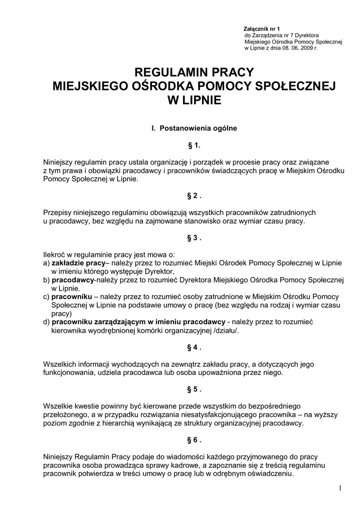Regulamin pracy - Miejski Ośrodek Pomocy Społecznej w Lipnie