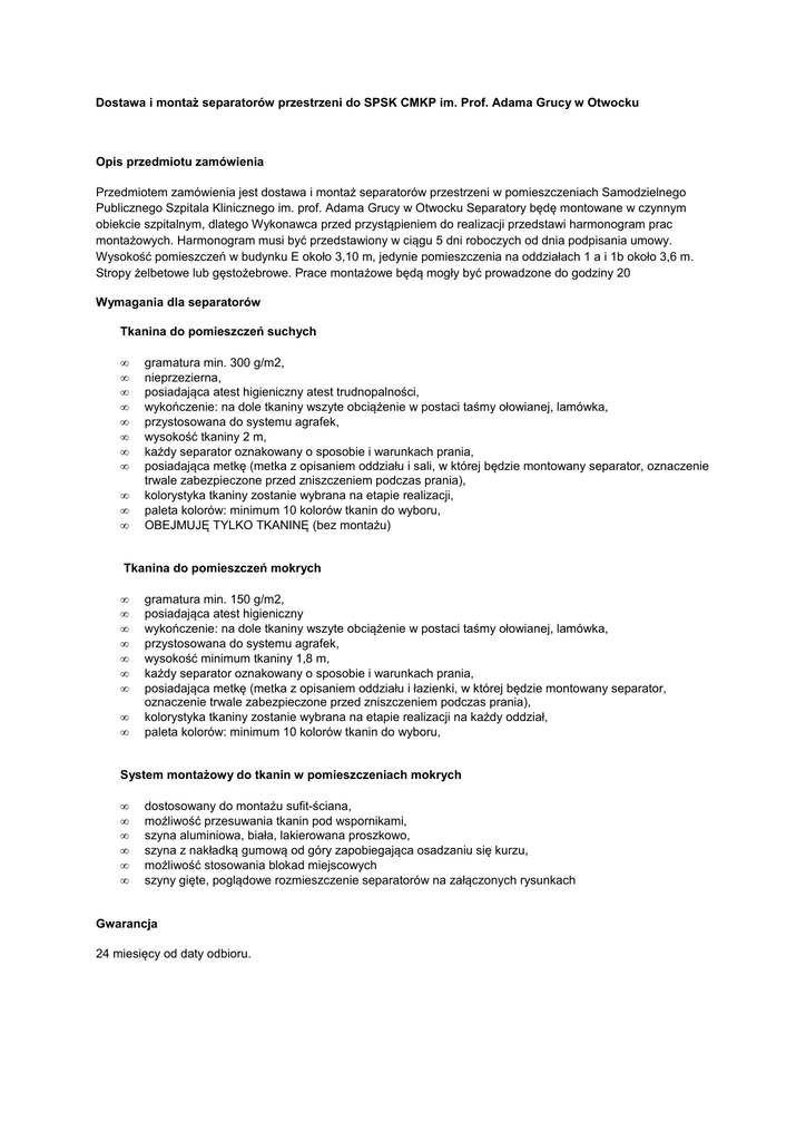 Dostawa i montaż separatorów przestrzeni do SPSK CMKP im. Prof. Adama Grucy w Otwocku Opis przedmiotu zamówienia Przedmiotem zamówienia jest dostawa i montaż separatorów przestrzeni w pomieszczeniach Samodzielnego Publicznego Szpitala Klinicznego im. prof. Adama Grucy w Otwocku Separatory będę montowane w czynnym obiekcie szpitalnym, dlatego Wykonawca przed przystąpieniem do realizacji przedstawi harmonogram prac montażowych. Harmonogram musi być przedstawiony w ciągu 5 dni roboczych od dnia podpisania umowy. Wysokość pomieszczeń w budynku E około 3,10 m, jedynie pomieszczenia na oddziałach 1 a i 1b około 3,6 m. Stropy żelbetowe lub gęstożebrowe. Prace montażowe będą mogły być prowadzone do godziny 20 Wymagania dla separatorów Tkanina do pomieszczeń suchych • • • • • • • • • • • gramatura min. 300 g/m2, nieprzezierna, posiadająca atest higieniczny atest trudnopalności, wykończenie: na dole tkaniny wszyte obciążenie w postaci taśmy ołowianej, lamówka, przystosowana do systemu agrafek, wysokość tkaniny 2 m, każdy separator oznakowany o sposobie i warunkach prania, posiadająca metkę (metka z opisaniem oddziału i sali, w której będzie montowany separator, oznaczenie trwale zabezpieczone przed zniszczeniem podczas prania), kolorystyka tkaniny zostanie wybrana na etapie realizacji, paleta kolorów: minimum 10 kolorów tkanin do wyboru, OBEJMUJĘ TYLKO TKANINĘ (bez montażu) Tkanina do pomieszczeń mokrych • • • • • • • • • gramatura min. 150 g/m2, posiadająca atest higieniczny wykończenie: na dole tkaniny wszyte obciążenie w postaci taśmy ołowianej, lamówka, przystosowana do systemu agrafek, wysokość minimum tkaniny 1,8 m, każdy separator oznakowany o sposobie i warunkach prania, posiadająca metkę (metka z opisaniem oddziału i łazienki, w której będzie montowany separator, oznaczenie trwale zabezpieczone przed zniszczeniem podczas prania), kolorystyka tkaniny zostanie wybrana na etapie realizacji na każdy oddział, paleta kolorów: minimum 10 kolorów tkanin do wyboru, System montażowy do tkanin w pomieszczeniach mokrych • • • • • • dostosowany do montażu sufit-ściana, możliwość przesuwania tkanin pod wspornikami, szyna aluminiowa, biała, lakierowana proszkowo, szyna z nakładką gumową od góry zapobiegająca osadzaniu się kurzu, możliwość stosowania blokad miejscowych szyny gięte, poglądowe rozmieszczenie separatorów na załączonych rysunkach Gwarancja 24 miesięcy od daty odbioru.