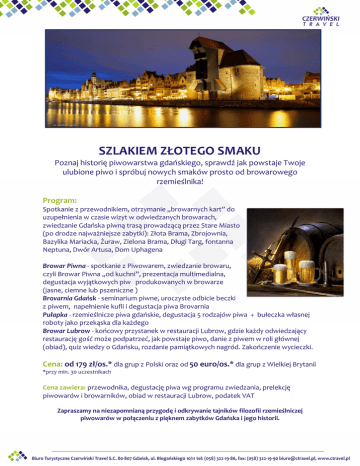 SZLAKIEM ZŁOTEGO SMAKU Poznaj historię piwowarstwa gdańskiego, sprawdź jak powstaje Twoje ulubione piwo i spróbuj nowych smaków prosto od browarowego rzemieślnika! Program: Spotkanie z przewodnikiem, otrzymanie „browarnych kart” do uzupełnienia w czasie wizyt w odwiedzanych browarach, zwiedzanie Gdańska piwną trasą prowadzącą przez Stare Miasto (po drodze najważniejsze zabytki): Złota Brama, Zbrojownia, Bazylika Mariacka, Żuraw, Zielona Brama, Długi Targ, fontanna Neptuna, Dwór Artusa, Dom Uphagena Browar Piwna - spotkanie z Piwowarem, zwiedzanie browaru, czyli Browar Piwna „od kuchni”, prezentacja multimedialna, degustacja wyjątkowych piw produkowanych w browarze (jasne, ciemne lub pszeniczne ) Brovarnia Gdańsk - seminarium piwne, uroczyste odbicie beczki z piwem, napełnienie kufli i degustacja piwa Brovarnia Pułapka - rzemieślnicze piwa gdańskie, degustacja 5 rodzajów piwa + bułeczka własnej roboty jako przekąska dla każdego Browar Lubrow - końcowy przystanek w restauracji Lubrow, gdzie każdy odwiedzający restaurację gość może podpatrzeć, jak powstaje piwo, danie z piwem w roli głównej (obiad), quiz wiedzy o Gdańsku, rozdanie pamiątkowych nagród. Zakończenie wycieczki. Cena: od 179 zł/os.* dla grup z Polski oraz od 50 euro/os.* dla grup z Wielkiej Brytanii *przy min. 30 uczestnikach Cena zawiera: przewodnika, degustację piwa wg programu zwiedzania, prelekcję piwowarów i browarników, obiad w restauracji Lubrow, podatek VAT Zapraszamy na niezapomnianą przygodę i odkrywanie tajników filozofii rzemieślniczej piwowarów w połączeniu z pięknem zabytków Gdańska i jego historii.