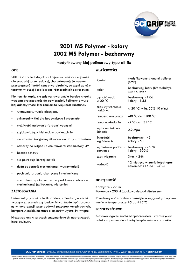 2001 MS Polymer - kolory 2002 MS Polymer - bezbarwny modyfikowany klej polimerowy typu all-fix WŁAŚCIWOŚCI OPIS 2001 i 2002 to hybrydowe kleje-uszczelniacze o jakości dla produckji przemysłowej, charakteryzuje je wysoka przyczepność i krótki czas utwardzabnia, co czyni go użytecznym w dużej ilości bardzo różnorodnych zastosowań. Klej ten nie kapie, nie spływa, gwarantuje bardzo wysoką wstępną przyczepność do powierzchni. Polimery o wysokiej adhezywności klei znakomita większość substancji. żywica modyfikowany silanami polieter (SMP) kolor bezbarwny, biały (UV stabilny), czarny, szary gęstość wzgl. w 20 °C bezbarwny - 1.06 kolory - 1.53 czas wytworzenia naskórka w 20 °C, wilg. 55% 10 minut temperatura pracy -40 °C do +100 °C temp. nakładania -5 °C do +35 °C wytrzymałość na ścinanie 2.2 Mpa bezbarwny - 45 kolory - 60 • wytrzymały, trwale elastyczny • uniwersalny klej dla budownictwa i przemysłu • możliwość malowania farbami wodnymi • szybkowiążący, klei mokre powierzchnie • nie zawiera izocyjanów, silikonów ani rozpuszczalników Twardość wg Shore A • odporny na wilgoć i pleśń, zawiera stabilizatory UV • bezzapachowy wydłużenie podczas bezbarwny - 250% zerwania kolory - 300% • nie powoduje korozji metali • duża odporność mechaniczna i wytrzymałość • pochłania drgania akustyczne i mechaniczne • utwardzona spoina może być poddawana obróbce mechanicznej (szlifowanie, wiercenie) ZASTOSOWANIA czas wiązania 3mm / 24h ważność 12 miesięcy w zamkniętych opakowaniach (+5 do +25°C) DOSTĘPNOŚĆ Kartrydże - 290ml Powercan - 200ml (opakowanie pod ciśnieniem) Uniwersalny produkt dla ślusarstwa, stolarstwa, obróbki tworzyw sztucznych czy budownictwa. Może być stosowany w motoryzacji, przy podukcji przyczep kempingowych, kamperów, mebli, montażu elementów wystrojów wnętrz. Przechowywać szczelnie zamknięte w oryginalnym opakowaniu w temperaturze +5 do +25°C Niezastąpiony w pracach utrzymaniowych, naprawczych, instalacyjnych. Stosować ogólne środki bezpieczeństwa. Przed użyciem należy zapoznać się z kartą bezpieczeństwa produktu. BEZPIECZEŃSTWO SCIGRIP Europe, Unit 22, Bentall Business Park, Glover Road, Washington, Tyne & Wear, NE37 3JD, U.K. • scigrip.com Informacje zawarte w powyższym cenniku zostały podane w dobrej wierze, opierając się na próbach przeprowadzanych przez producenta oraz naszą firmę, jednakże należy je traktować wyłącznie jako wskazówki. Producent oraz nasza firma nie biorą odpowiedzialności za konsekwencje użycia produktu przez osoby postronne, których działania są poza naszą kontrolą. Odpowiedzialność za niewłaściwe użycie produktu i przechowywanie produktu ponosi użytkownik. Na nabywcy spoczywa obowiązek zastosowania należytych środków ostrożności chroniących personel i materiały podczas przechowywania, transportu lub użytkowania produktu. Producent zastrzega sobie prawo do zmiany charakterystyk i cen bez ostrzeżenia.