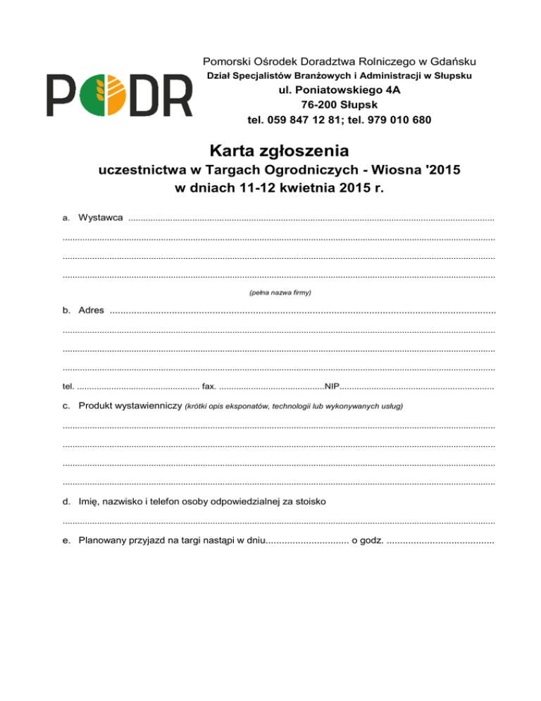 KARTA ZGŁOSZENIA TARGI OGRODNICZE