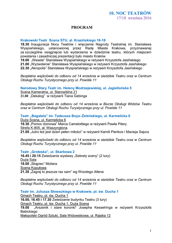 10. NOC TEATRÓW 17/18 września 2016 PROGRAM Krakowski Teatr Scena STU, al. Krasińskiego 16-18 18.30 Inauguracja Nocy Teatrów i wręczenie Nagrody Teatralnej im. Stanisława Wyspiańskiego, ustanowionej przez Radę Miasta Krakowa, przyznawanej za szczególne osiągnięcia lub wydarzenia w dziedzinie teatru, których miejscem powstania i zasadniczej prezentacji było miasto Kraków 19.00 „Wesele” Stanisława Wyspiańskiego w reżyserii Krzysztofa Jasińskiego 21.00 „Wyzwolenie” Stanisława Wyspiańskiego w reżyserii Krzysztofa Jasińskiego 22.30 „Akropolis” Stanisława Wyspiańskiego w reżyserii Krzysztofa Jasińskiego Bezpłatne wejściówki do odbioru od 14 września w siedzibie Teatru oraz w Centrum Obsługi Ruchu Turystycznego przy ul. Powiśle 11 Narodowy Stary Teatr im. Heleny Modrzejewskiej, ul. Jagiellońska 5 Scena Kameralna, ul. Starowiślna 21 21.00 „Dekalog” w reżyserii Tiana Gebinga Bezpłatne wejściówki do odbioru od 14 września w Biurze Obsługi Widzów Teatru oraz w Centrum Obsługi Ruchu Turystycznego przy ul. Powiśle 11 Teatr „Bagatela” im. Tadeusza Boya–Żeleńskiego, ul. Karmelicka 6 Duża Scena, ul. Karmelicka 6 19.30 „Pomoc domowa” Marca Camelottiego w reżyserii Pawła Pitery Strefa K-805, al. Waszyngtona 21.00 „Jutro też jest dzień pełen miłości” w reżyserii Kamili Pieńkos i Macieja Sajura Bezpłatne wejściówki do odbioru od 14 września w siedzibie Teatru oraz w Centrum Obsługi Ruchu Turystycznego przy ul. Powiśle 11 Teatr „Groteska”, ul. Skarbowa 2 16.45 i 20.15 Zwiedzanie wystawy „Sekrety sceny” (2 tury) Duża Sala 18.00 „Skąpiec” Moliera Scena Kopułowa 21.30 „Zagraj to jeszcze raz sam” wg Woodego Allena Bezpłatne wejściówki do odbioru od 14 września w siedzibie Teatru oraz w Centrum Obsługi Ruchu Turystycznego przy ul. Powiśle 11 Teatr im. Juliusza Słowackiego w Krakowie, pl. św. Ducha 1 Gmach Teatru, pl. św. Ducha 1 16.00, 16.45 i 17.30 Zwiedzanie budynku Teatru (3 tury) Gmach Teatru, pl. św. Ducha 1, Duża Scena 19.00 „Arszenik i stare koronki” Josepha Kesselringa w reżyserii Krzysztofa Babickiego Małopolski Ogród Sztuki, Sala Widowiskowa, ul. Rajska 12 1 21.30 „Dzieje upadków” wg powieści Honore de Balzaca „Kuzynka Bietka” w reżyserii Małgorzaty Warsickiej Scena Miniatura, pl. św. Ducha 2 24.00 „Ziemia, planeta ludzi” Antoine’a de Saint-Exupery w reżyserii Darii Kopiec Małopolski Ogród Sztuki, Sala Widowiskowa, ul. Rajska 12 23.00 „Więcej niż możesz zjeść” - czytanie felietonów parakulinarnych Doroty Masłowskiej Foyer Teatru, pl. św. Ducha 1 22.00 Nocny Krakowski Salon Poezji „Kocham Teatr” Gmach Teatru, pl. św. Ducha 1 21.00 Iluminacja Teatru Bezpłatne wejściówki do odbioru od 14 września w siedzibie Teatru oraz w Centrum Obsługi Ruchu Turystycznego przy ul. Powiśle 11 Teatr KTO, ul. Krowoderska 74 Ośrodek Dokumentacji Sztuki Tadeusza Kantora CRICOTEKA, ul. Nadwiślańska 2-4 20.00 „Chór Sierot” w reżyserii Jerzego Zonia Muzeum Sztuki i Techniki Japońskiej MANGGHA, ul. Konopnickiej 26 23.00 „Sprzedam dom, w którym już nie mogę mieszkać” w reżyserii Jerzego Zonia Bezpłatne wejściówki do odbioru od 14 września w siedzibie Teatru oraz w Centrum Obsługi Ruchu Turystycznego przy ul. Powiśle 11 Teatr Ludowy, os. Teatralne 34 Duża Scena Teatru, os. Teatralne 34 17.00 „Tartuffe albo Szalbierz” Moliera w reżyserii Tomasa Svobody Scena Pod Ratuszem, Rynek Główny 1 22.00 „Jądro dziwności. Nowa Rosja” P. Pomerantseva – czytanie performatywne reportażu w ramach cyklu „Kraków bez fikcji” – opieka reżyserska Karolina Kirsz Scena Stolarnia, os. Teatralne 34 20.00 „Gdy przyjdzie sen. Tragedia miłosna” Katarzyny Dworak i Pawła Wolaka – otwarta próba z improwizacjami aktorsko-muzycznymi – opieka reżyserska Małgorzata Bogajewska Bezpłatne wejściówki do odbioru od 14 września w siedzibie Teatru oraz w Centrum Obsługi Ruchu Turystycznego przy ul. Powiśle 11 Teatr „Łaźnia Nowa”, os. Szkolne 25 Duża Scena 17.00 i 21.00 „Wszystko o mojej matce” w reżyserii Michała Borczucha Bezpłatne wejściówki do odbioru od 14 września w siedzibie Teatru oraz w Centrum Obsługi Ruchu Turystycznego przy ul. Powiśle 11 Opera Krakowska, ul. Lubicz 48 Scena Opera Studio, ul. Lubicz 48 23.00 „Dwie Historie - jeden Taniec (Inwokacja)” – pokaz przedpremierowy. Taneczna opowieść o losie nastolatków wchodzących w dorosłość. Wykonanie: Balet Opery Krakowskiej, choreografia: Jacek Tyski 2 Bezpłatne wejściówki do odbioru od 14 września w Kasie Opery oraz Centrum Obsługi Ruchu Turystycznego przy ul. Powiśle 11 Państwowa Wyższa Szkoła Teatralna im. L. Solskiego, ul. Straszewskiego 22 Scena im. S. Wyspiańskiego, ul. Straszewskiego 22 19.00 „Ożenek” Mikołaja Gogola, reżyseria Wiktor Loga – Skarczewski – pokaz studentów V roku Wydziału Aktorskiego Scena 210, ul. Straszewskiego 22 21.00 „Między nami dobrze jest”, reżyseria Agnieszka Glińska Bezpłatne wejściówki do odbioru od 14 września w siedzibie Szkoły oraz w Centrum Obsługi Ruchu Turystycznego przy ul. Powiśle 11 Balet Dworski „Cracovia Danza”, plac Na Groblach 7 Muzeum Historyczne Miasta Krakowa – Celestat, ul. Lubicz 16 18.00 „Od acana do waćpana” w wykonaniu tancerzy Baletu Dworskiego „Cracovia Danza”, choreografia Romana Agnel, Leszek Rembowski Bezpłatne wejściówki do odbioru od 14 września w Centrum Obsługi Ruchu Turystycznego przy ul. Powiśle 11 Krakowska Opera Kameralna, ul. Miodowa 15 Centrum Kultury Żydowskiej, ul. Meiselsa 17 22.00 „Chatskele, Chatskele” spektakl muzyczny w jidysz w reżyserii Jadwigi Leśniak - Jankowskiej Bezpłatne wejściówki do odbioru od 14 września w Centrum Obsługi Ruchu Turystycznego przy ul. Powiśle 11 Krakowski Teatr VARIETE, ul. Grzegórzecka 71 19.00 Farsa Muzyczna „Dziewczyna z plakatu” Raya Cooney′a i Johna Chapmana w reży