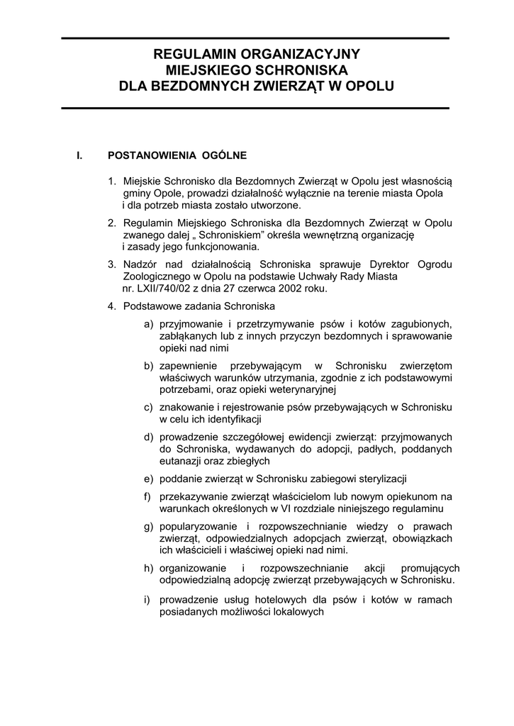 REGULAMIN ORGANIZACYJNY MIEJSKIEGO SCHRONISKA DLA BEZDOMNYCH ZWIERZĄT W OPOLU I. POSTANOWIENIA OGÓLNE 1. Miejskie Schronisko dla Bezdomnych Zwierząt w Opolu jest własnością gminy Opole, prowadzi działalność wyłącznie na terenie miasta Opola i dla potrzeb miasta zostało utworzone. 2. Regulamin Miejskiego Schroniska dla Bezdomnych Zwierząt w Opolu zwanego dalej „ Schroniskiem” określa wewnętrzną organizację i zasady jego funkcjonowania. 3. Nadzór nad działalnością Schroniska sprawuje Dyrektor Ogrodu Zoologicznego w Opolu na podstawie Uchwały Rady Miasta nr. LXII/740/02 z dnia 27 czerwca 2002 roku. 4. Podstawowe zadania Schroniska a) przyjmowanie i przetrzymywanie psów i kotów zagubionych, zabłąkanych lub z innych przyczyn bezdomnych i sprawowanie opieki nad nimi b) zapewnienie przebywającym w Schronisku zwierzętom właściwych warunków utrzymania, zgodnie z ich podstawowymi potrzebami, oraz opieki weterynaryjnej c) znakowanie i rejestrowanie psów przebywających w Schronisku w celu ich identyfikacji d) prowadzenie szczegółowej ewidencji zwierząt: przyjmowanych do Schroniska, wydawanych do adopcji, padłych, poddanych eutanazji oraz zbiegłych e) poddanie zwierząt w Schronisku zabiegowi sterylizacji f) przekazywanie zwierząt właścicielom lub nowym opiekunom na warunkach określonych w VI rozdziale niniejszego regulaminu g) popularyzowanie i rozpowszechnianie wiedzy o prawach zwierząt, odpowiedzialnych adopcjach zwierząt, obowiązkach ich właścicieli i właściwej opieki nad nimi. h) organizowanie i rozpowszechnianie akcji promujących odpowiedzialną adopcję zwierząt przebywających w Schronisku. i) prowadzenie usług hotelowych dla psów i kotów w ramach posiadanych możliwości lokalowych II. PERSONEL SCHRONISKA 1. Personel Schroniska stanowią: Kierownik Schroniska i opiekunowie zwierząt. 2. Kierownik Schroniska kieruje pracą Schroniska i jest odpowiedzialny za jego prawidłowe funkcjonowanie. Do obowiązków, uprawnień i odpowiedzialności kierownika Schroniska należy: a) nadzór nad całokształtem działalności podległego mu Schroniska, b) systematyczne prowadzenie niezbędnej dokumentacji dotyczącej prawidłowości zarówno pod względem hodowlanym jak i księgowym, c) sprawowanie kontroli nad przestrzeganiem obowiązujących w miejscu pracy przepisów BHP, d) nadzór i kontrola prawidłowości pielęgnacji i obsługi weterynaryjnej zwierząt, e) odpowiedzialność za bezpieczeństwo i zdrowie zwierząt przebywających w Schronisku f) odpowiedzialność za prawidłowe sporządzanie karmy dla zwierząt, w porozumieniu z lekarzem weterynarii g) odpowiedzialność za stan techniczny pomieszczeń i urządzeń znajdujących się na terenie miejsca pracy , h) opracowywanie szczegółowych propozycji zakresów czynności i przedkładanie ich do akceptacji, i) opiniowanie wnioskowanie w sprawach kadrowych, płacowych i dyscyplinarnych podległych pracowników. 3. Kierownik Schroniska opracowuje: a) szczegółowe zasady dezynfekcji, deratyzacji i dezynsekcji b) dawki żywieniowe dla zwierząt przebywających w Schronisku, w porozumieniu z lekarzem weterynarii 4. Wszyscy pracownicy Schroniska musza być przeszkoleni w zakresie BHP ze szczególnym uwzględnieniem pracy ze zwierzętami. 5. Każdy pracownik zatrudniony w Schronisku ma określone w zakresie czynności szczegółowe obowiązki. 6. Wszyscy pracownicy Schroniska muszą odznaczać się przyjacielskim stosunkiem do zwierząt i wykazywać zrozumienie dla zwierząt schroniskowych znajdujących się w nowych warunkach i często z tego powodu wystraszonych, rozdrażnionych lub apatycznych. 7. Brutalne obchodzenie się ze zwierzęciem stanowi ciężkie naruszenie podstawowych obowiązków służbowych i może być powodem wypowiedzenia umowy o pracę pracownikowi Schroniska. III. PRZYJMOWANIE ZWIERZĄT DO SCHRONISKA 1. Schronisko obsługuje zainteresowanych we wszystkie dni tygodnia (z wyjątkiem dni świątecznych) w godzinach: a) b) w okresie od 01 IV do 30 IX – od 1100 do 1800 w okresie od 01 X do 31 III – od 1100 do 1600 Informacja o godzinach przyjęć powinna być wywieszona w widocznym miejscu na terenie Schroniska. 2. Osobom nietrzeźwym i będącym pod wpływem środków odurzających wstęp do Schroniska jest zabroniony. 3. Zabrania się osobom przychodzącym do Schroniska: a) zbliżać się do zwierząt i wchodzić do pomieszczeń, w których przebywają zwierzęta, bez asysty personelu Schroniska b) karmić zwierząt – w razie przyniesienia produktów spożywczych dla zwierząt należy je przekazać personelowi Schroniska c) drażnienia zwierząt 4. Do Schroniska mogą zostać przyjęte bezdomne zwierzęta tylko z terenu miasta Opola, lub zwierzęta oddane przez właściciela, który jest zameldowany w Opolu, z wyjątkiem tych, które pogryzły człowieka lub co do których istnieje uzasadnione podejrzenie, że są zarażone wścieklizną. 5. Zwierzęta przyjmowane są przez kierownika wyznaczonego przez niego pracownika. Schroniska lub 6. Każde zwierzę przyjęte do Schroniska zostaje wpisane do rejestru z uwidocznieniem daty przyjęcia, danych osoby doprowadzającej, okoliczności w jakich znaleziono zwierzę i innych uwag (rasa, umaszczenie, wiek, znaki szczególne, oznakowanie) 7. Kierownik Schroniska, a w czasie jego nieobecności pracownik przez niego wyznaczony, dokonuje oględzin doprowadzonego zwierzęcia i w razie potrzeby wzywa lekarza weterynarii, który podejmuje decyzję o dalszym postępowaniu ze zwierzęciem. 8. Zwierzęta przyjmowane do Schroniska, z wyłączeniem zwierząt hotelowanych, szczeniąt i kociąt, poddawane są 14 dniowej kwarantannie, która może zostać przedłużona przez kierownika Schroniska. 9. Zwierzęta w Schronisku podlegają kategoryzacji na: a) b) c) d) e) f) g) h) zwierzęta na kwarantannie zwierzęta chore lub ranne zwierzęta zdrowe dorosłe szczeniaki suki ze szczeniętami suki w okresie cieczki zwierzęta agresywne zwierz