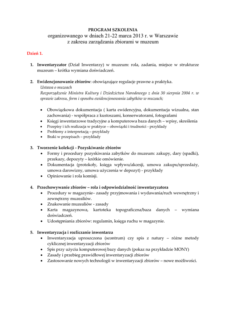 PROGRAM SZKOLENIA organizowanego w dniach 21-22 marca 2013 r. w Warszawie z zakresu zarządzania zbiorami w muzeum Dzień 1. 1. Inwentaryzator (Dział Inwentarzy) w muzeum: rola, zadania, miejsce w strukturze muzeum – krótka wymiana doświadczeń. 2. Ewidencjonowanie zbiorów: obowiązujące regulacje prawne a praktyka. Ustawa o muzeach Rozporządzenie Ministra Kultury i Dziedzictwa Narodowego z dnia 30 sierpnia 2004 r. w sprawie zakresu, form i sposobu ewidencjonowania zabytków w muzeach; Obowiązkowa dokumentacja ( karta ewidencyjna, dokumentacja wizualna, stan zachowania) - współpraca z kustoszami, konserwatorami, fotografami Księgi inwentarzowe tradycyjne a komputerowa baza danych – wpisy, skreślenia Przepisy i ich realizacja w praktyce – obowiązki i trudności - przykłady Problemy z interpretacją – przykłady Braki w przepisach – przykłady 3. Tworzenie kolekcji - Pozyskiwanie zbiorów Formy i procedury pozyskiwania zabytków do muzeum: zakupy, dary (spadki), przekazy, depozyty – krótkie omówienie. Dokumentacja (protokoły, księga wpływu/akcesji, umowa zakupu/sprzedaży, umowa darowizny, umowa użyczenia w depozyt) - przykłady Opiniowanie i rola komisji. 4. Przechowywanie zbiorów – rola i odpowiedzialność inwentaryzatora Procedury w magazynie– zasady przyjmowania i wydawania/ruch wewnętrzny i zewnętrzny muzealiów. Znakowanie muzealiów - zasady Karta magazynowa, kartoteka topograficzna/baza danych – wymiana doświadczeń. Udostępniania zbiorów: regulamin, księga ruchu w magazynie. 5. Inwentaryzacja i rozliczanie inwentarza Inwentaryzacja uproszczona (scontrum) czy spis z natury – różne metody cyklicznej inwentaryzacji zbiorów Spis przy użyciu komputerowej bazy danych (pokaz na przykładzie MONY) Zasady i przebieg prawidłowej inwentaryzacji zbiorów Zastosowanie nowych technologii w inwentaryzacji zbiorów – nowe możliwości. 2 Dzień 2 I. Ruch muzealiów – mobilność kolekcji muzealnej Regulacje prawne: krótkie omówienie obowiązujących ustaw i rozporządzeń. Wypożyczenia zbiorów na wystawy i w depozyt w kraju – umowa, warunki eksponowania Wypożyczenia na wystawy zagranicę – umowa, facility report, ubezpieczeni, immunitet, transport, kurier Umowa użyczenia: omówienie poszczególnych punktów – wspólna praca – wymiana doświadczeń Protokoły zdawczo-odbiorcze. II. Organizacja wystawy – rola inwentaryzatora – inwentaryzator menedżerem projektu 1. Współpraca z komisarzem: korespondencja, lista obiektów 2. Negocjacje umów z instytucjami wypożyczającymi, w tym: Strony umowy, przedmiot umowy Oświadczenia stron Nazwy wystaw/terminy użyczenia Warunki umowy/zasady użyczania Opakowanie/transporty/konwoje/kurierzy – Kurier – konserwator/kustosz czy inwentaryzator – obowiązki kuriera Ubezpieczenia/gwarancje rządowe – wyszukiwanie ubezpieczyciela – wybór ofert Odpowiedzialność i bezpieczeństwo Zalecenia konserwatorskie Informacje o obiektach i publikacje Odnośniki do przepisów prawa, paragrafy końcowe. 3. Transport – wybór/przetarg - zasady bezpiecznego przewozu zabytków/ lista packingowa (duże wystawy) / oznakowanie samochodu i skrzyń 4. Konwoje (załącznik nr 3 Organizacja ochrony w czasie transportu) 5. Omówienie nietypowych sytuacji III. Gry symulacyjne - wykorzystywane w kilku panelach, w zależności od tematu. Mają na celu bliższe zapoznanie się z sytuacjami spotykanymi w codziennej pracy inwentaryzatorów. IV. Inwentaryzatorzy we współpracy międzymuzealnej Informacja o grupie inwentaryzatorów polskich Informacja o międzynarodowych zjazdach inwentaryzatorów muzealnych Opracowanie: Natalia Ładyka – Główny Inwentaryzator Aldona Modrzewska – Asystent w Dziale Głównego Inwentaryzatora Zamek Królewski w Warszawie