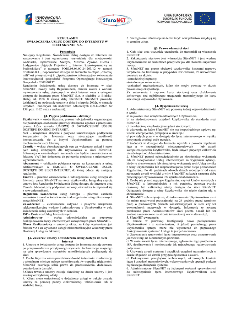REGULAMIN ŚWIADCZENIA USŁUG DOSTĘPU DO INTERNETU W SIECI SferaNET S.A. Preambuła Niniejszy Regulamin Świadczenia Usług dostępu do Internetu ma zastosowanie i jest ograniczony terytorialnie dla miejscowości Godziszka, Rybarzowice, Szczyrk, Meszna, Żywiec, Bierna i Łodygowice objętych Projektem „ Internet Szerokopasmowy na Podbeskidziu” o numerze POIG.08.04.00-24-263/12 w ramach działania 8.4 „ Zapewnienie dostępu do Internetu na etapie „ostatniej mili” osi priorytetowej 8. „Społeczeństwo informacyjne- zwiększanie innowacyjności gospodarki” Programu Operacyjnego Innowacyjna Gospodarka 2007-2013” Regulamin świadczenia usług dostępu do Internetu w sieci SferaNET, zwany dalej Regulaminem, określa zakres i warunki wykonywania usług dostępnych w sieci Internet wraz z usługami dostępu do Internetu przez SferaNET S.A. z siedzibą w BielskuBiałej, ul. PCK 8 zwaną dalej SferaNET. SferaNET prowadzi działalność na podstawie ustawy z dnia 6 sierpnia 2002r. w sprawie urządzeń radiowych lub nadawczo odbiorczych (Dz.U.2002r. Nr 138, poz. 1162 wraz z aneksami). §1. Pojęcia podstawowe - definicje Użytkownik – osoba fizyczna, prawna lub jednostka organizacyjna nie posiadająca osobowości prawnej utworzona zgodnie z przepisami prawa, która zawarła UMOWĘ O ŚWIADCZENIE USŁUG DOSTĘPU DO SIECI INTERNET. Sieć – urządzenia aktywne i pasywne umożliwiające podłączenie komputerów do Internetu oraz stwarzające możliwość komunikowania się z innymi Użytkownikami za pomocą mechanizmów sieci lokalnej. Cennik – wykaz obowiązujących cen za wykonane usługi i nazw tych usług dostępnych dla użytkownika w sieci SferaNET. Informacja o ewentualnych zmianach cen będzie zamieszczana na fakturze VAT lub dołączona do polecenia przelewu z miesięcznym wyprzedzeniem. Abonament – cyklicznie pobierana opłata za korzystanie z usług zdefiniowanych w UMOWIE O ŚWIADCZENIE USŁUG DOSTĘPU DO SIECI INTERNET, do której odnosi się niniejszy regulamin. Umowa – pisemne oświadczenie o udostępnianiu usług dostępu do Internetu przez SferaNET na rzecz użytkownika. Integralną częścią umowy jest Regulamin Świadczenia Usług dostępu do Internetu oraz Cennik. Abonent przy podpisaniu umowy, oświadcza że zapoznał się z w/w załącznikami. Regulamin świadczenia usług dostępu – pisemne ustalenie warunków i zasad o świadczeniu i udostępnianiu usług oferowanych przez SferaNET. Zakończenie – elektroniczne aktywne i pasywne urządzenie telekomunikacyjne wydane i zainstalowane u Użytkownika w celu świadczenia usług określonych w cenniku. ISP – Dostawca Usług Internetowych Administrator – osoba odpowiedzialna za poprawne funkcjonowanie łączy internetowych zarządzanych przez SferaNET. Okres Rozliczeniowy – umowny okres, za który wystawiana jest faktura VAT za wykonane usługi telekomunikacyjne wskazany przez Dostawcę Usług na fakturze; §2. Zawarcie Umowy o świadczenie usług dostępu do sieci Internet 1. Umowa o świadczenie usług dostępu do Internetu zostaje zawarta po przeprowadzeniu pozytywnego wywiadu technicznego mającego na celu sprawdzenie warunków umożliwiających podłączenie do sieci 2. Osoba fizyczna winna przedstawić dowód tożsamości z informacją o aktualnym miejscu stałego zameldowania /w wypadku niejasności, SferaNET zastrzega sobie prawo do przedstawienia, dodatkowo, potwierdzenia danych/. 3.Okres trwania umowy zostaje określony na druku umowy i jest zależny od wybranej oferty. 4. Klient może wnioskować o dodatkowe usługi w trakcie trwania umowy za pomocą poczty elektronicznej, telefonicznie lub w siedzibie firmy. 5. Szczegółowe informacje na temat taryf oraz pakietów znajdują się w cenniku usług. §3. Prawo własności sieci 1. Cała sieć oraz wszystkie urządzenia do transmisji są własnością SferaNET. 2. Zakończenie sieciowe jest własnością SferaNET i jest wydane Użytkownikowi na warunkach przepisów jak dla stosunku użyczenia rzeczy. 3. SferaNET ma prawo obciążyć użytkownika kosztami naprawy urządzenia do transmisji w przypadku stwierdzenia, że uszkodzenie powstało na skutek: -samodzielnej naprawy, -świadomego zniszczenia, -uszkodzeń mechanicznych, które nie mogły powstać w skutek prawidłowej eksploatacji. Za zniszczenia i naprawę karty sieciowej oraz okablowania końcowego (od najbliższego urządzenia transmisyjnego do karty sieciowej) odpowiada Użytkownik. §4. Dysponowanie siecią 1. Administratorzy SferaNET nie ponoszą żadnej odpowiedzialności z tytułu: a/ za jakość i stan urządzeń odbiorczych Użytkownika; b/ za niedostosowanie urządzeń Użytkownika do standardu sieci SferaNET; c/ niewłaściwej eksploatacji urządzeń sieciowych; d/ zdarzenia, na które SferaNET nie ma bezpośredniego wpływu np. usterki energetyczne, przepięcia w sieci itp.; e/ powstałych przerw w dostępie do łącza internetowego w wyniku korzystania z usługi osób trzecich. f/ trudności w dostępie do Internetu wynikłe z powodu zapchania łącz a w szczególności międzynarodowych lub awarii komputera/systemu Użytkownika, bądź innych przyczyn całkowicie niezależnych od Administratorów. 2. SferaNET ponosi odpowiedzialność za niewłaściwe wykonanie lub za niewykonanie Usług internetowych za wyjątkiem sytuacji, kiedy to niewykonanie lub nienależyte wykonanie tych Usług wynika z winy Użytkownika lub nieprzestrzegania przez niego postanowień Regulaminu. Po 48 godzinach /dwóch dniach roboczych/ od czasu zgłoszenia awarii wynikłej z winy SferaNET za każdą następną dobę przysługuje Użytkownikowi 3% upustu od abonamentu. 3. Osoby nie przestrzegające Regulaminu czy też Umów zawartych z SferaNET, w którymkolwiek z ich punktów, ponoszą ryzyko czasowej lub całkowitej utraty dostępu do sieci SferaNET. Odłączenie dostępu z winy Użytkownika nie niesie skutku ulg w abonamencie. 4. SferaNET zobowiązuje się do informowania Użytkowników sieci (