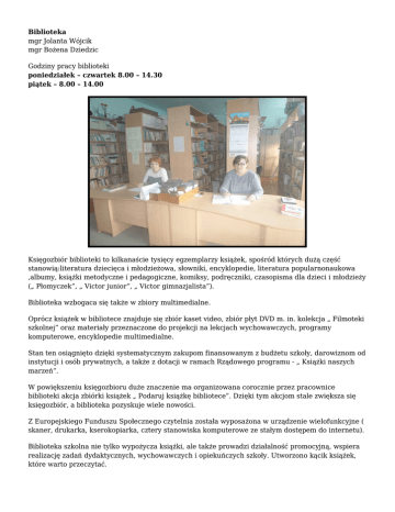 Biblioteka mgr Jolanta Wójcik mgr Bożena Dziedzic Godziny pracy biblioteki poniedziałek – czwartek 8.00 – 14.30 piątek – 8.00 – 14.00 Księgozbiór biblioteki to kilkanaście tysięcy egzemplarzy książek, spośród których dużą część stanowią:literatura dziecięca i młodzieżowa, słowniki, encyklopedie, literatura popularnonaukowa ,albumy, książki metodyczne i pedagogiczne, komiksy, podręczniki, czasopisma dla dzieci i młodzieży („ Płomyczek”, „ Victor junior”, „ Victor gimnazjalista”). Biblioteka wzbogaca się także w zbiory multimedialne. Oprócz książek w bibliotece znajduje się zbiór kaset video, zbiór płyt DVD m. in. kolekcja „ Filmoteki szkolnej” oraz materiały przeznaczone do projekcji na lekcjach wychowawczych, programy komputerowe, encyklopedie multimedialne. Stan ten osiągnięto dzięki systematycznym zakupom finansowanym z budżetu szkoły, darowiznom od instytucji i osób prywatnych, a także z dotacji w ramach Rządowego programu - „ Książki naszych marzeń”. W powiększeniu księgozbioru duże znaczenie ma organizowana corocznie przez pracownice biblioteki akcja zbiórki książek „ Podaruj książkę bibliotece”. Dzięki tym akcjom stale zwiększa się księgozbiór, a biblioteka pozyskuje wiele nowości. Z Europejskiego Funduszu Społecznego czytelnia została wyposażona w urządzenie wielofunkcyjne ( skaner, drukarka, kserokopiarka, cztery stanowiska komputerowe ze stałym dostępem do internetu). Biblioteka szkolna nie tylko wypożycza książki, ale także prowadzi działalność promocyjną, wspiera realizację zadań dydaktycznych, wychowawczych i opiekuńczych szkoły. Utworzono kącik książek, które warto przeczytać. Na holu szkoły organizowane są wystawy oraz gazetki rocznicowe. Każdego roku szkolnego organizowane są konkursy czytelnicze: „ Najlepszy czytelnik”, „ Najlepiej czytająca klasa”. Informacje o działalności biblioteki szkolnej umieszczane są na stronie internetowej szkoły. Umieszczane są tam informacje o akcjach podejmowanych w bibliotece, rocznicach literackich, informacjach o konkursach, ich regulaminach, rozstrzygnięciu i przyznaniu nagród, statystyki czytelnicze itp. Oprac.: mgr Bożena Dziedzic i mgr Jolanta Wójcik -----------------------------REGULAMINY * Regulamin Biblioteki Szkolnej >>> * Wykaz lektur dla uczniów szkoły podstawowej >>> * Wykaz lektur dla uczniów gimnazjum >>> * Kanon książek dla dzieci i młodzieży ogłoszony przez Bibliotekę Narodową >>> Wykaz kaset video i płyt DVD znajdujących się w bibliotece szkolnej- Gimnazjum Dziura w niebie Człowiek istota płciowa Człowiek od poczęcia Do progu dojrzewania Polskie drogi do niepodległości Pasowanie na ucznia w Gimnazjum nr 2 Ślubowanie uczniów w Gimnazjum nr 2 Talent, młodość, tradycja. Gimnazjada 2000 Malowane słowem, muzyką, tańcem… Dzieci Afryki Komers gimnazjalistów- 9 lutego 2002r. Płytoteka do „ Zeszytów muzycznych” Płytoteka do „ Zeszytów muzycznych” III gimnazjum Z piosenką przez życie. 15 piosenek dla gimnazjum 12 piosenek obowiązkowych, 7 piosenek młodzieżowych Dostałem krew- żyję Komers gimnazjalistów: luty 2004 r. Zawodowy list gończy. Dozwolone od lat 16 Zawodowy list gończy. Bez ograniczeń Komers: rok szkolny 2004/2005 Komers gimnazjalistów: rok szkolny 2005/2006 Atlas środowiska Polski – elektroniczny Zawodowy list gończy Łapówka Kolegiata w Opatowie Bałtów i okolice Wiślica Bazylika Katedralna w Kielcach Lekcje wychowawcze na DVD: Stop agresji Lekcje wychowawcze na DVD: Szkoła bez dilera Lekcje wychowawcze na DVD: Fala, czyli pierwsze dni w szkole Lekcje wychowawcze na DVD: Alkohol, uzależnieni i uzależnienia Lekcje wychowawcze na DVD: Akceptacja w grupie rówieśników Lekcje wychowawcze na DVD: Moja tolerancja wobec odmienności Lekcje wychowawcze na DVD: Bezpieczne wyjazdy i wyjścia klasowe Lekcje wychowawcze na DVD: Stop agresji fizycznej Film dydaktyczny na DVD: Pierwsza pomoc przedmedyczna Poznaj świat techniki Lekcje wychowawcze na DVD: Ucieczki z domu Lekcje wychowawcze na DVD: Stres w szkole Lekcje wychowawcze na DVD: Zagrożenia na imprezach Lekcje wychowawcze na DVD: Ochrona przed sektą Lekcje wychowawcze na DVD: Zdrowy wygląd bez sterydów Lekcje wychowawcze na DVD: Walka z depresją Lekcje wychowawcze na DVD: Zagrożenia w Internecie Lekcje wychowawcze na DVD: Moje prawa kończą się tam, gdzie zaczynają się prawa drugiego człowieka Świat salamandry. Opowieść o Gorczańskim Parku Narodowym Ekologia w gimnazjum cz. 1 Ekologia w gimnazjum cz. 2 Ekologia w gimnazjum cz. 3 Ekologia w gimnazjum cz. 4 Ekologia w gimnazjum cz. 5 Ekologia w gimnazjum cz. 6 Ekologia w gimnazjum cz. 7 Zajęcia edukacyjne: stop cyberprzemocy Filmoteka szkolna- Kino myśli. Struktura kryształu. Tango. Filmoteka szkolna- Moralność kamery. Z punku widzenia nocnego portiera. Nienormalni. Filmoteka szkolna- Obserwacja codzienności. Cześć Tereska. Rodzina człowiecza. Filmoteka szkolna- Kadry pamięci. Jak być kochaną. Portret własny. Filmoteka szkolna- Obrazy magiczne. Historia kina w Popielawach. Oczy urocze. Filmoteka szkolna- Filmowe przypowieści. Żywot Mateusza. Schody. Filmoteka szkolna- Siła symbolu. Popiół i diament. Krótka historia jednej tablicy. Chleb. Filmoteka szkolna- Metafory prawdy. Wszystko może się przytrafić. Szczurołap. Siedem kobiet w różnym wieku. Filmoteka szkolna- Mówić nie wprost. Rejs. Urząd. Filmoteka szkolna- Bez komentarza? Defilada. Egzamin dojrzałości. Filmoteka szkolna- Rozdroża historii. Człowiek z marmuru. Dokąd. Filmoteka szkolna- Zapisy przeszłości. Fotoamator. Usłyszcie mój krzyk. Filmoteka szkolna- Wokół nagromadzonych stereotypów. Eroica. Ostry film zaangażowany. Filmoteka szkolna- Gorzki śmiech. Zezowate szczęście. Fotel. Filmoteka szkolna- W krzywym zwierciadle. Hydrozagadka. Polska kronika. Filmoteka szkolna- Współczesne lęki. Dług. Nasza ulica. Fi