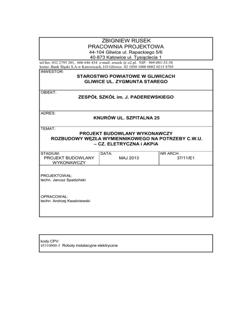 ZBIGNIEW RUSEK PRACOWNIA PROJEKTOWA 44-104 Gliwice ul. Rapackiego 5/6 40-873 Katowice ul. Tysiąclecia 1 tel/fax: 032 2795 201, 606 646 434 e-mail: zrusek @ o2.pl. NIP: 969-001-52-30 konto: Bank Śląski S.A.w Katowicach, I/O Gliwice 02 1050 1000 0002 0215 8705 INWESTOR: STAROSTWO POWIATOWE W GLIWICACH GLIWICE UL. ZYGMUNTA STAREGO OBIEKT: ZESPÓŁ SZKÓŁ im. J. PADEREWSKIEGO ADRES: KNURÓW UL. SZPITALNA 25 TEMAT: PROJEKT BUDOWLANY WYKONAWCZY ROZBUDOWY WĘZŁA WYMIENNIKOWEGO NA POTRZEBY C.W.U. – CZ. ELETRYCZNA i AKPiA STADIUM: DATA: PROJEKT BUDOWLANY WYKONAWCZY PROJEKTOWAŁ: techn. Janusz Spadziński OPRACOWAŁ: techn. Andrzej Kwaśniewski kody CPV: 45310000-3 Roboty instalacyjne elektryczne NR ARCH. MAJ 2013 37/11/E1 SPIS ZAWARTOŚCI Strona tytułowa Spis zawartości Spis rysunków Opis techniczny Rysunki według spisu SPIS RYSUNKÓW Schemat strukturalny sterowania Schemat ideowo montażowy: część 1 Schemat ideowo montażowy: część 2 Rozdzielnia RK – pogląd zestawienia Rzut wymiennikowni – plan tras kablowych 01 02 03 04 05 OPIS TECHNICZNY 1.Podstawa opracowania a zlecenie Inwestora b. wytyczne i normy branżowe c. projekt branży technologicznej d. normy i wytyczne branżowe 2. Przedmiot i zakres opracowania Przedmiotem niniejszego opracowania jest projekt elektryczny i AKPiA rozbudowy węzła wymiennikowego ze wspomaganiem solarnym zapewniającego pokrycie zapotrzebowania ciepła na c.w.u. w Zespole Szkół w Knurowie przy ul. Szpitalnej 25. Niniejsze opracowanie zawiera schematy ideowo – montażowe układów zasilania i sterowania urządzeniami węzła c.w.u. Projekt należy rozpatrywać łącznie z projektem stacji solarnej . 3. Dane energetyczne Napięcie zasilania węzła Układ sieci Moc zainstalowana w węźle Moc szczytowa węzła Uz= 230V 50Hz TN-S Pi= 0,6 kW Ps= 0,6 kW 4. Rozdzielnia sterownicza RK Rozdzielnia sterownicza RK zasilana będzie przewodem YDY 3x2,5 mm2 z istniejącej rozdzielni c.o. w pomieszczeniu węzła. W rozdzielni RK, którą stanowi obudowa plastikowa RN55/3x12 przewiduje się zabudowę regulatora ECL200 i wszystkich niezbędnych aparatów wg zestawienia materiałów. W rozdzielni RK zaprojektowano zabezpieczenie dla stacji solarnej, której projekt stanowi oddzielny zeszyt. 5. Instalacje elektryczne W istniejącej szafie sterowniczej węzła c.o. zabudować zabezpieczenie główne FG dla rozdzielni RK. Nie przewiduje się modernizacji instalacji oświetleniowej i gniazd wtyczkowych. W ramach nowej instalacji należy wykonać połączenia urządzeń zgodnie ze schematami ideowo – montażowymi. (rys 02 i 03) Rozdzielnię sterowniczą RK zabudować na ścianie w okolicy istniejącej szafy sterowniczej węzła c.o. na wysokości umożliwiającej swobodny dostęp i obsługę. 6. Rozwiązania projektowe – automatyka i sygnalizacja Na podstawie założeń projektu technologicznego zaprojektowano zasilanie urządzeń technologicznych i układu regulacyjnego węzła c.w.u. Dla potrzeb regulacji układu przygotowania ciepłej wody, wstępnie podgrzanej w układzie kolektorów słonecznych, zaprojektowano jednoobwodowy regulator ECL200 z kartą P16 firmy Danfoss wraz z kompletem czujników temperatury (wg specyfikacji części technologicznej). Stacja solarna jest sterowana własnym autonomicznym regulatorem. (ujęte w oddzielnym projekcie). Sposób podłączenia sygnałów wejściowych i wyjściowych do regulatora przedstawiono na rys. 02, a sposób programowania wg założeń projektu technologicznego przedstawiono w pkt. 7. Układ zasilania pompy PC jest wyposażony w możliwość wyboru trybu pracy auto/0/ręczne. Za pośrednictwem presostatu P1 realizowana jest ochrona pompy PC przed suchobieiem. Sygnalizacja suchobiegu (brak ciśnienia) jest zrealizowana za pośrednictwem lampki sygnalizacyjnej w rozdzielni RK. 7. Parametry pracy układów regulacji wg założeń technologii 7.1. Sterowanie napędem zaworu regulacyjnego c.w.u. – ZR Sterownie zaworem odbywa się z regulatora ECL. Sygnały sterujące to: - temperatura c.w.u. za wymiennikiem – czujnik T2, nastawa 55oC Algorytm sterowania: - utrzymuj zadaną temperaturę T2 - zamykaj zawór przy wzroście temperatury c.w.u. powyżej 55oC – sygnał z T2 - zamknij zawór jeżeli zadziała STB (t > 60oC) - zamknij zawór przy zaniku zasilania elektrycznego 7.2. Sterowanie napędem zaworu elektromagnetycznego – ZE Sterownie zaworem odbywa się za pomocą czujnika STB. Sygnały sterujące to: - temperatura c.w.u. za stabilizatorem – czujnik STB, Algorytm sterowania: - zamknij zawór jeżeli t > 60oC - otwarcie zaworu po ręcznym skasowaniu czujnika STB 7.3. Sterowanie pompą – PC Sterownie pompą odbywa się regulatora ECL Sygnały sterujące to: - ciśnienie wody w instalacji – czujnik P1 (sygnał nadrzędny) - temperatura wody za wymiennikiem c.w.u. – czujnik STB (sygnał nadrzędny) - program czasowy ustawiony w regulatorze Algorytm sterowania: - zablokuj pompę dla P1 < 0,10 MPa - odblokuj pompę dla P1 > 0,15 MPa - zablokuj pompę od sygnału STB (t > 60oC) - odblokowanie pompy po ręcznym skasowaniu czujnika STB 8. Instalacje elektryczne - montaż Wszystkie urządzenia należy podłączyć zgodnie ze schematami ideowo – montażowymi. Przewody elektryczne układać w listwach elektroinstalacyjnych lub rurkach instalacyjnych. Rozmieszczenie urządzeń w rozdzielni RK pokazano na rysunku nr 04. 9. Ochrona od porażeń i połączenia wyrównawcze Ochrona przeciwporażeniowa zapewniona jest przez zastosowanie ochrony podstawowej (zapobieganie niebezpiecznym skutkom dotknięcia części czynnej), przez zastosowanie izolacji roboczej oraz zastosowanie środków dodatkowej ochrony: samoczynne odłączenie zasilania, oraz wyłączniki różnicowo-prądowe o znamionowym prądzie różnicowym 30 mA dla urządzeń zabudowanych w pomieszczeniu wymiennikowni. W związku z tym projektowana instalację należy wykonać z niezależną żyłą PE, której nie wolno łączyć z żyłą „N” z