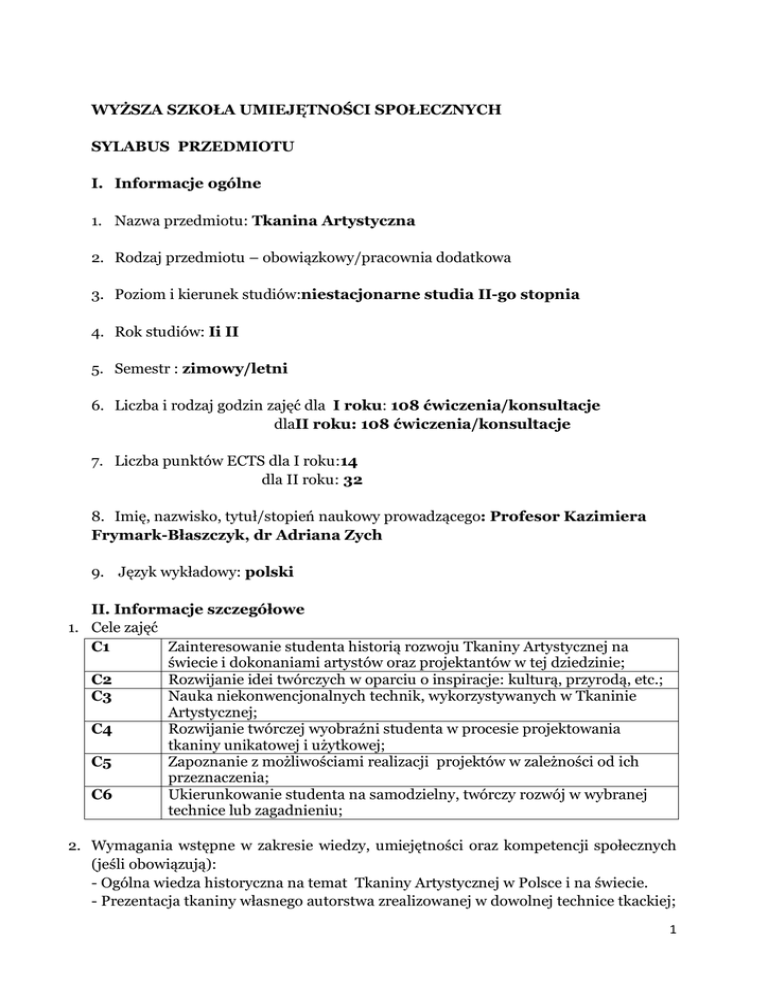 WYŻSZA SZKOŁA UMIEJĘTNOŚCI SPOŁECZNYCH SYLABUS PRZEDMIOTU I. Informacje ogólne 1. Nazwa przedmiotu: Tkanina Artystyczna 2. Rodzaj przedmiotu – obowiązkowy/pracownia dodatkowa 3. Poziom i kierunek studiów:niestacjonarne studia II-go stopnia 4. Rok studiów: Ii II 5. Semestr : zimowy/letni 6. Liczba i rodzaj godzin zajęć dla I roku: 108 ćwiczenia/konsultacje dlaII roku: 108 ćwiczenia/konsultacje 7. Liczba punktów ECTS dla I roku:14 dla II roku: 32 8. Imię, nazwisko, tytuł/stopień naukowy prowadzącego: Profesor Kazimiera Frymark-Błaszczyk, dr Adriana Zych 9. Język wykładowy: polski II. Informacje szczegółowe 1. Cele zajęć C1 Zainteresowanie studenta historią rozwoju Tkaniny Artystycznej na świecie i dokonaniami artystów oraz projektantów w tej dziedzinie; C2 Rozwijanie idei twórczych w oparciu o inspiracje: kulturą, przyrodą, etc.; C3 Nauka niekonwencjonalnych technik, wykorzystywanych w Tkaninie Artystycznej; C4 Rozwijanie twórczej wyobraźni studenta w procesie projektowania tkaniny unikatowej i użytkowej; C5 Zapoznanie z możliwościami realizacji projektów w zależności od ich przeznaczenia; C6 Ukierunkowanie studenta na samodzielny, twórczy rozwój w wybranej technice lub zagadnieniu; 2. Wymagania wstępne w zakresie wiedzy, umiejętności oraz kompetencji społecznych (jeśli obowiązują): - Ogólna wiedza historyczna na temat Tkaniny Artystycznej w Polsce i na świecie. - Prezentacja tkaniny własnego autorstwa zrealizowanej w dowolnej technice tkackiej; 1 3. Efekty kształcenia w zakresie wiedzy, umiejętności oraz kompetencji społecznych Efekty kształcenia w odniesieniu do wiedzy Symbol Opis efektów kształcenia efektu kształcenia EK1 Student zna historię rozwoju tkaniny użytkowej i artystycznej w Polsce i na świecie, rozumie procesy kształtujące ją; EK2 EK3 Samodzielnie i krytycznie ocenia twórczość artystów reprezentujących tę dziedzinę sztuki; Posiada rozeznanie dotyczące możliwości projektowych oraz realizacyjnych tkaniny unikatowej i użytkowej; EK4 Zna właściwości materiałów używanych do realizacji tkanin; EK5 Posiada podstawową wiedzę o funkcji tkaniny w przestrzeni i we wnętrzu oraz jej oddziaływaniu na człowieka; Efekty kształcenia w odniesieniu do umiejętności Symbol Opis efektów kształcenia efektu kształcenia Przygotowuje projekty plastyczne tkanin o konkretnym EK6 przeznaczeniu; Samodzielnie wybiera i przygotowuje materiały do realizacji EK7 swoich projektów; Realizuje własne projekty plastyczne samodzielnie lub zleca ich EK8 produkcję; Posługuje się terminologią plastyczną i techniczną, pozwalającą EK9 na dokładny opis projektu, jego inspiracji, kompozycji i realizacji; Przygotowuje wizualizacje i prezentacje projektu; EK10 Efekty kształcenia w odniesieniu do kompetencji społecznych Symbol efektu kształcenia EK11 Opis efektów kształcenia Analizuje zainteresowania, modę i potrzeby społeczne w zakresie projektowania tkanin iodpowiada na nie swoimi projektami. Wykazuje się samodzielnością w poszukiwaniu nowych inspiracji i możliwości realizacji projektów. 2 4. Treści programowe Symbol treści programowych Opis treści programowych dla studentów I roku studiów II-go stopnia Odniesienie do efektów kształcenia dla przedmiotu (symbol efektów) EK1, EK2, EK5, EK11 TP4 Zarys historii rozwoju tkaniny w różnych częściach świata na przestrzeni wieków:wzornictwo, materiały i zastosowanie; Wzornictwo i barwa w sztuce ludowej wybranych kultur - prezentacje studentów; Indywidualne projektowanie tkanin na podstawie inspiracji wybranym regionem lub elementem zaczerpniętym ze sztuki ludowej; Wybór i realizacja najciekawszych projektów; TP5 Realizacja projektów; EK6, EK7, EK8, EK11 EK7, EK8, EK9 TP6 Realizacja projektów – kontynuacja; EK7, EK8, EK9, TP7 Realizacja projektów, przygotowanie prezentacji projektów i realizacji; EK7, EK8, EK9, EK10, TP8 EK2, EK5, EK9 TP12 Miejsce i funkcja tkaniny we wnętrzu mieszkalnym lub publicznym – omówienie tematu projektowego; Przygotowanie projektów na tkaninę użytkową lub artystyczną w oparciu o analizę potrzeb człowieka przebywającego w tym wnętrzu; Prezentacja projektów i ich wizualizacji w wybranych wnętrzach, omówienie i wybór projektów do samodzielnej realizacji; Nauka nowych, niekonwencjonalnych możliwości tkackich, technicznych w obszarze Tkaniny Artystycznej; Realizacja wybranych projektów; TP13 Realizacja wybranych projektów - kontynuacja; TP14 Realizacja wybranych projektów - kontynuacja; TP15 Przygotowanie prezentacji końcowej, uwzględniającej historię powstawania projektu i jego realizacji; EK3, EK4, EK7, EK8 EK3, EK4, EK7, EK8 EK9, EK10, EK11, TP1 TP2 TP3 TP9 TP10 TP11 EK1, EK2, EK5, EK9 EK4, EK5, EK6, EK9, EK11 EK3, EK4, EK5, EK6, EK11 EK5, EK6, EK9, EK10, EK11, EK3, EK4, EK7, EK9 EK3, EK4, EK6, EK7, EK8, EK9 3 Treści programowe Symbol treści programowych TP1 TP2 TP3 TP4 TP5 TP6 TP7 TP8 TP9 Opis treści programowych dla studentów II roku studiów II-go stopnia Śledzenie i omawianie aktualnych wystaw, katalogów, wydarzeń związanych z Tkaniną Artystyczną; Chaos i porządek w małej formie plastycznej; Zbieranie materiałów do realizacji miniatury tkackiej. Realizacja miniatur tkackich potraktowanych jako notatnik – wizualny i sensoryczny dziennik; Realizacja miniatur tkackich – kontynuacja; Projektowanie tkaniny, która będzie kontynuacją myśli twórczej ulubionego artysty, wybranego okresu historii sztuki lub rozwinięciem własnej idei projektowej (dla osób realizujących dyplom); Prezentacja projektów, omówienie wybranego stylu, jego walorów i możliwości rozwoju; Wybór najciekawszych projektów; Realizacja projektów w dowolnie wybranej technice; Realizacja projektów – kontynuacja; Odniesienie do efektów kształcenia dla przedmiotu (symbol efektów) EK1, EK2, EK9 EK1, EK2, EK4, EK5 EK4, EK5, EK6, EK7, EK8, EK9 EK4, EK5, EK6, EK7, EK8, EK9 EK1, EK2, EK3 EK1, EK2