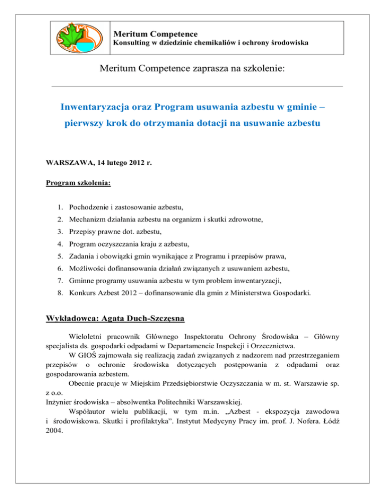 Meritum Competence Konsulting w dziedzinie chemikaliów i ochrony środowiska Meritum Competence zaprasza na szkolenie: Inwentaryzacja oraz Program usuwania azbestu w gminie – pierwszy krok do otrzymania dotacji na usuwanie azbestu WARSZAWA, 14 lutego 2012 r. Program szkolenia: 1. Pochodzenie i zastosowanie azbestu, 2. Mechanizm działania azbestu na organizm i skutki zdrowotne, 3. Przepisy prawne dot. azbestu, 4. Program oczyszczania kraju z azbestu, 5. Zadania i obowiązki gmin wynikające z Programu i przepisów prawa, 6. Możliwości dofinansowania działań związanych z usuwaniem azbestu, 7. Gminne programy usuwania azbestu w tym problem inwentaryzacji, 8. Konkurs Azbest 2012 – dofinansowanie dla gmin z Ministerstwa Gospodarki. Wykładowca: Agata Duch-Szczęsna Wieloletni pracownik Głównego Inspektoratu Ochrony Środowiska – Główny specjalista ds. gospodarki odpadami w Departamencie Inspekcji i Orzecznictwa. W GIOŚ zajmowała się realizacją zadań związanych z nadzorem nad przestrzeganiem przepisów o ochronie środowiska dotyczących postępowania z odpadami oraz gospodarowania azbestem. Obecnie pracuje w Miejskim Przedsiębiorstwie Oczyszczania w m. st. Warszawie sp. z o.o. Inżynier środowiska – absolwentka Politechniki Warszawskiej. Współautor wielu publikacji, w tym m.in. „Azbest - ekspozycja zawodowa i środowiskowa. Skutki i profilaktyka”. Instytut Medycyny Pracy im. prof. J. Nofera. Łódź 2004. Meritum Competence Konsulting w dziedzinie chemikaliów i ochrony środowiska Lokalizacja: Warszawa, sala w dogodnej lokalizacji (szczegółowe informacje o miejscu szkolenia otrzymają Państwo kilka dni przed szkoleniem), Termin: 14 lutego 2012 r., zajęcia odbywają się w godzinach 10.00 – 14.00 Koszt za osobę: szkolenie bezpłatne! Kontakt: [email protected] [email protected] tel. 0 728 956 434 fax. 0 22 631 07 19 Strona internetowa: www.szkolenia.meritumnet.pl