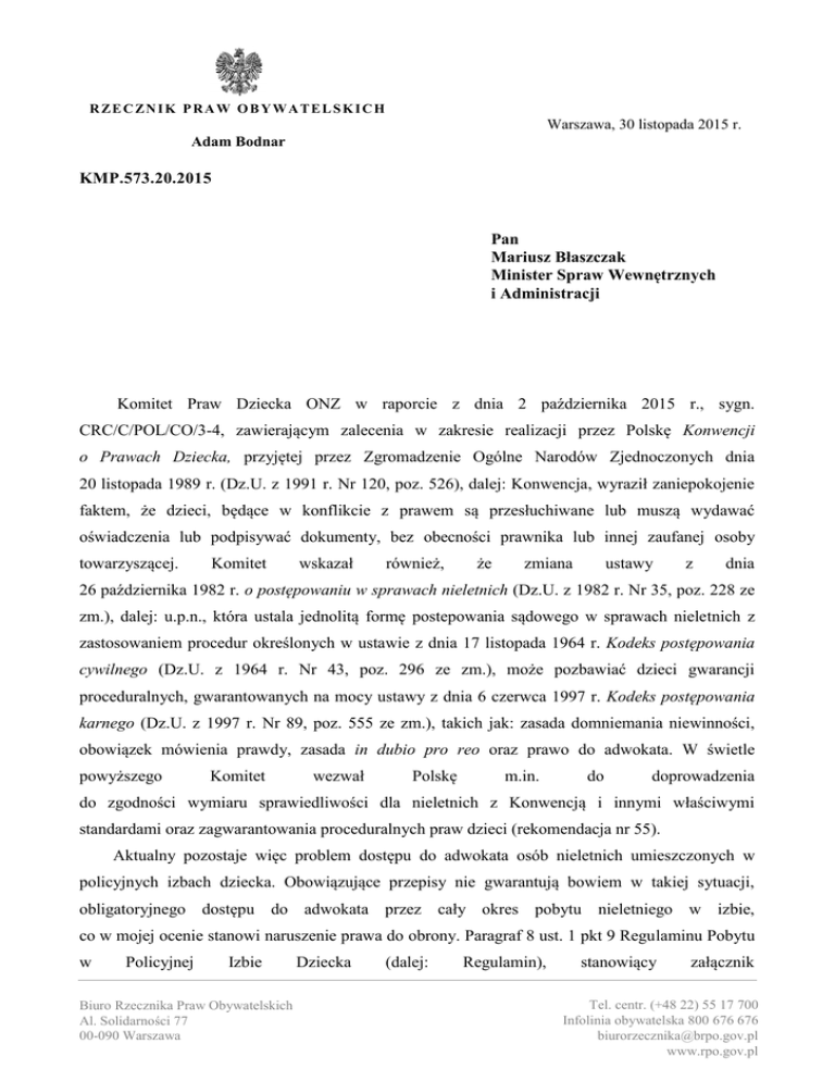 RZECZNIK PRAW OBYWATELSKICH Warszawa, 30 listopada 2015 r. Adam Bodnar KMP.573.20.2015 Pan Mariusz Błaszczak Minister Spraw Wewnętrznych i Administracji Komitet Praw Dziecka ONZ w raporcie z dnia 2 października 2015 r., sygn. CRC/C/POL/CO/3-4, zawierającym zalecenia w zakresie realizacji przez Polskę Konwencji o Prawach Dziecka, przyjętej przez Zgromadzenie Ogólne Narodów Zjednoczonych dnia 20 listopada 1989 r. (Dz.U. z 1991 r. Nr 120, poz. 526), dalej: Konwencja, wyraził zaniepokojenie faktem, że dzieci, będące w konflikcie z prawem są przesłuchiwane lub muszą wydawać oświadczenia lub podpisywać dokumenty, bez obecności prawnika lub innej zaufanej osoby towarzyszącej. Komitet wskazał również, że zmiana ustawy z dnia 26 października 1982 r. o postępowaniu w sprawach nieletnich (Dz.U. z 1982 r. Nr 35, poz. 228 ze zm.), dalej: u.p.n., która ustala jednolitą formę postepowania sądowego w sprawach nieletnich z zastosowaniem procedur określonych w ustawie z dnia 17 listopada 1964 r. Kodeks postępowania cywilnego (Dz.U. z 1964 r. Nr 43, poz. 296 ze zm.), może pozbawiać dzieci gwarancji proceduralnych, gwarantowanych na mocy ustawy z dnia 6 czerwca 1997 r. Kodeks postępowania karnego (Dz.U. z 1997 r. Nr 89, poz. 555 ze zm.), takich jak: zasada domniemania niewinności, obowiązek mówienia prawdy, zasada in dubio pro reo oraz prawo do adwokata. W świetle powyższego Komitet wezwał Polskę m.in. do doprowadzenia do zgodności wymiaru sprawiedliwości dla nieletnich z Konwencją i innymi właściwymi standardami oraz zagwarantowania proceduralnych praw dzieci (rekomendacja nr 55). Aktualny pozostaje więc problem dostępu do adwokata osób nieletnich umieszczonych w policyjnych izbach dziecka. Obowiązujące przepisy nie gwarantują bowiem w takiej sytuacji, obligatoryjnego dostępu do adwokata przez cały okres pobytu nieletniego w izbie, co w mojej ocenie stanowi naruszenie prawa do obrony. Paragraf 8 ust. 1 pkt 9 Regulaminu Pobytu w Policyjnej Izbie Biuro Rzecznika Praw Obywatelskich Al. Solidarności 77 00-090 Warszawa Dziecka (dalej: Regulamin), stanowiący załącznik Tel. centr. (+48 22) 55 17 700 Infolinia obywatelska 800 676 676 [email protected] www.rpo.gov.pl do rozporządzenia Ministra Spraw Wewnętrznych z dnia 4 czerwca 2012 r. w sprawie pomieszczeń przeznaczonych dla osób zatrzymanych lub doprowadzonych w celu wytrzeźwienia, pokoi przejściowych, tymczasowych pomieszczeń przejściowych i policyjnych izb dziecka, regulaminu pobytu w tych pomieszczeniach, pokojach i izbach oraz sposobu postępowania z zapisami obrazu z tych pomieszczeń, pokoi i izb, dalej: rozporządzenie, przewiduje możliwość odwiedzin rodziców, obrońcy lub opiekuna, ale wyłącznie za zgodą sądu, kierownika izby lub policjanta prowadzącego sprawę. Dostęp do adwokata jest więc uzależniony nie od woli zatrzymanego, a od innych osób, co pozostaje w sprzeczności zarówno z ustawą zasadniczą, ustawą o postępowaniu w sprawach nieletnich oraz standardami międzynarodowymi. Należy wskazać, że zgodnie z zapisami ustawy o postępowaniu w sprawach nieletnich można zatrzymać, a następnie umieścić w policyjnej izbie dziecka nieletniego, co do którego istnieje uzasadnione podejrzenie, że popełnił czyn karalny, jest to konieczne ze względu na okoliczności sprawy i zachodzi uzasadniona obawa ukrycia się nieletniego, zatarcia śladów popełnionego czynu, albo gdy nie można ustalić jego tożsamości (art. 32g § 1 u.p.n.). Zatrzymanego nieletniego informuje się o przyczynach zatrzymania, przysługujących mu prawach (w tym o prawie do skorzystania z pomocy adwokata, prawie do odmowy składania wyjaśnień lub odpowiedzi na poszczególne pytania i prawie złożenia zażalenia na czynności naruszające jego prawa), a także – na jego żądanie – umożliwia się nawiązanie kontaktu z rodzicem, opiekunem lub adwokatem (art. 32g § 3 u.p.n.). Prawo nieletniego do korzystania z pomocy obrońcy wynika wprost z art. 18a pkt 1 u.p.n. Należy w tym miejscu zaznaczyć, że prawo do obrony chronione jest przez Konstytucję RP (art. 42 ust. 2), Konwencję o Ochronie Praw Człowieka i Podstawowych Wolności sporządzoną w Rzymie dnia 4 listopada 1950 r. (art. 6 ust. 3) oraz Międzynarodowy Pakt Praw Obywatelskich i Politycznych otwarty do podpisu w Nowym Jorku dnia 19 grudnia 1966 r. (art. 14 ust. 3). Warto w tym miejscu odnieść się także do orzecznictwa Europejskiego Trybunału Praw Człowieka w Strasburgu, który wskazywał, że dostęp osoby zatrzymanej do obrońcy, w tym umożliwienie się do jej przygotowania i realizowania w toku postepowania jest niezwykle istotny z punktu widzenia rzetelności procesu sądowego i powinien być zagwarantowany od początku zatrzymania, zaś nawet gdy wyjątkowe okoliczności sprawy uzasadniają odmowę dostępu do adwokata, ograniczenie w korzystaniu z jego pomocy nie może zniweczyć praw zagwarantowanych w art. 6 Konwencji o Ochronie Praw Człowieka i Podstawowych Wolności (Dayanan przeciwko Turcji, skarga nr 7377/03; Krombach przeciwko Francji, skarga nr 29731/96; John Murray przeciwko Wielkiej Brytanii, skarga nr 18731/91; Płonka przeciwko Polsce, skarga nr 20310/02; Salduz przeciwko Turcji, skarga nr 36391/02;Yurttas przeciwko Turcji, skarga nr 25143/94). -2- Warto również przywołać opinię Europejskiego Komitetu ds. Zapobiegania Torturom oraz Nieludzkiemu lub Poniżającemu Traktowaniu albo Karaniu (CPT) wyrażoną w Dwudziestym Pierwszym Sprawozdaniu Ogólnym [CPT/Inf (2011) 28], zgodnie z którą umożliwienie osobom zatrzymanym przez policję dostępu do adwokata jest podstawowym zabezpieczeniem przed złym traktowaniem. Istnienie tej możliwości ma zniechęcający wpływ na tych, którzy są skłonni do złego traktowania zatrzymanych osób. Ponadto prawnik jest w znakomitej pozycji, by podejmować odpowiednie działania jeśli złe traktowanie faktycznie ma miejsce. W ocenie CPT dostęp do adwokata po