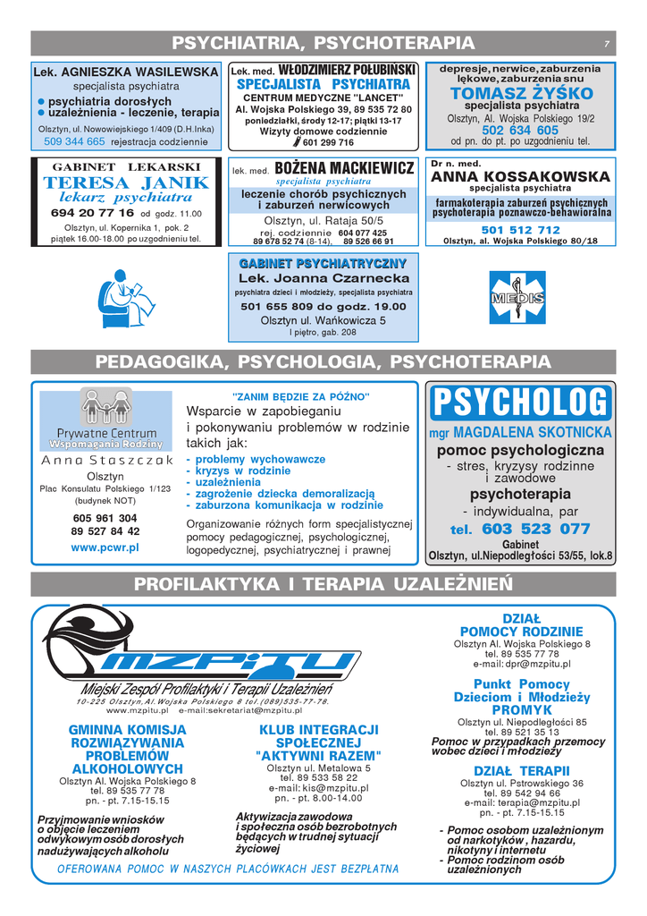 PSYCHIATRIA, PSYCHOTERAPIA Lek. AGNIESZKA WASILEWSKA specjalista psychiatra W£ODZIMIERZ PO£UBIÑSKI SPECJALISTA PSYCHIATRA Lek. med. l psychiatria doros³ych l uzale¿nienia - leczenie, terapia CENTRUM MEDYCZNE "LANCET" Al. Wojska Polskiego 39, 89 535 72 80 Olsztyn, ul. Nowowiejskiego 1/409 (D.H.Inka) Wizyty domowe codziennie 509 344 665 rejestracja codziennie GABINET LEKARSKI TERESA JANIK lekarz psychiatra 694 20 77 16 od godz. 11.00 Olsztyn, ul. Kopernika 1, pok. 2 pi¹tek 16.00-18.00 po uzgodnieniu tel. poniedzia³ki, rody 12-17; pi¹tki 13-17 601 299 716 lek. med. BO¯ENA MACKIEWICZ specjalista psychiatra leczenie chorób psychicznych i zaburzeñ nerwicowych Olsztyn, ul. Rataja 50/5 rej. codziennie 604 077 425 89 678 52 74 (8-14), 89 526 66 91 7 depresje, nerwice, zaburzenia lêkowe, zaburzenia snu TOMASZ ¯YKO specjalista psychiatra Olsztyn, Al. Wojska Polskiego 19/2 502 634 605 od pn. do pt. po uzgodnieniu tel. Dr n. med. ANNA KOSSAKOWSKA specjalista psychiatra farmakoterapia zaburzeñ psychicznych psychoterapia poznawczo-behawioralna 501 512 712 Olsztyn, al. Wojska Polskiego 80/18 GABINET PSYCHIATRYCZNY Lek. Joanna Czarnecka psychiatra dzieci i m³odzie¿y, specjalista psychiatra 501 655 809 do godz. 19.00 Olsztyn ul. Wañkowicza 5 I piêtro, gab. 208 PEDAGOGIKA, PSYCHOLOGIA, PSYCHOTERAPIA "ZANIM BÊDZIE ZA PÓNO" Wsparcie w zapobieganiu i pokonywaniu problemów w rodzinie takich jak: - Olsztyn Plac Konsulatu Polskiego 1/123 (budynek NOT) 605 961 304 89 527 84 42 www.pcwr.pl problemy wychowawcze kryzys w rodzinie uzale¿nienia zagro¿enie dziecka demoralizacj¹ zaburzona komunikacja w rodzinie Organizowanie ró¿nych form specjalistycznej pomocy pedagogicznej, psychologicznej, logopedycznej, psychiatrycznej i prawnej PSYCHOLOG mgr MAGDALENA SKOTNICKA pomoc psychologiczna - stres, kryzysy rodzinne i zawodowe psychoterapia - indywidualna, par tel. 603 523 077 Gabinet Olsztyn, ul.Niepodleg³oci 53/55, lok.8 PROFILAKTYKA I TERAPIA UZALE¯NIEÑ DZIA£ POMOCY RODZINIE Olsztyn Al. Wojska Polskiego 8 tel. 89 535 77 78 e-mail: [email protected] www.mzpitu.pl e-mail:[email protected] GMINNA KOMISJA ROZWI¥ZYWANIA PROBLEMÓW ALKOHOLOWYCH Olsztyn Al. Wojska Polskiego 8 tel. 89 535 77 78 pn. - pt. 7.15-15.15 Przyjmowanie wniosków o objêcie leczeniem odwykowym osób doros³ych nadu¿ywaj¹cych alkoholu KLUB INTEGRACJI SPO£ECZNEJ "AKTYWNI RAZEM" Olsztyn ul. Metalowa 5 tel. 89 533 58 22 e-mail: [email protected] pn. - pt. 8.00-14.00 Aktywizacja zawodowa i spo³eczna osób bezrobotnych bêd¹cych w trudnej sytuacji ¿yciowej OFEROWANA POMOC W NASZYCH PLACÓWKACH JEST BEZP£ATNA Punkt Pomocy Dzieciom i M³odzie¿y PROMYK Olsztyn ul. Niepodleg³oci 85 tel. 89 521 35 13 Pomoc w przypadkach przemocy wobec dzieci i m³odzie¿y DZIA£ TERAPII Olsztyn ul. Pstrowskiego 36 tel. 89 542 94 66 e-mail: [email protected] pn. - pt. 7.15-15.15 - Pomoc osobom uzale¿nionym od narkotyków , hazardu, nikotyny i internetu - Pomoc rodzinom osób uzale¿nionych