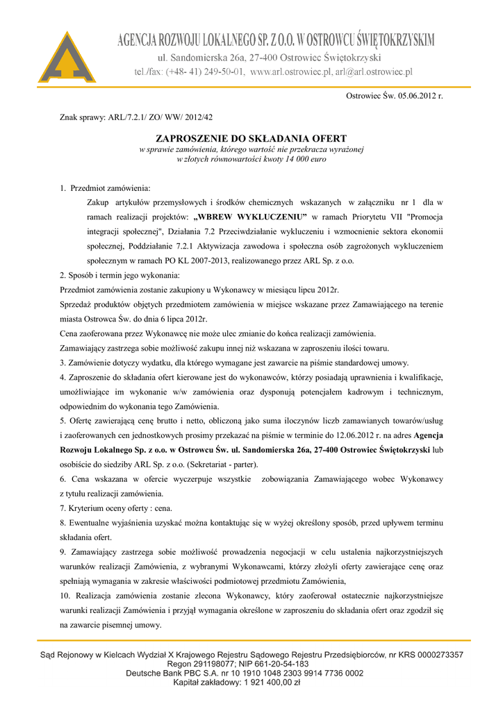 Ostrowiec Św. 05.06.2012 r. Znak sprawy: ARL/7.2.1/ ZO/ WW/ 2012/42 ZAPROSZENIE DO SKŁADANIA OFERT w sprawie zamówienia, którego wartość nie przekracza wyrażonej w złotych równowartości kwoty 14 000 euro 1. Przedmiot zamówienia: Zakup artykułów przemysłowych i środków chemicznych wskazanych w załączniku nr 1 dla w ramach realizacji projektów: „WBREW WYKLUCZENIU” w ramach Priorytetu VII "Promocja integracji społecznej", Działania 7.2 Przeciwdziałanie wykluczeniu i wzmocnienie sektora ekonomii społecznej, Poddziałanie 7.2.1 Aktywizacja zawodowa i społeczna osób zagrożonych wykluczeniem społecznym w ramach PO KL 2007-2013, realizowanego przez ARL Sp. z o.o. 2. Sposób i termin jego wykonania: Przedmiot zamówienia zostanie zakupiony u Wykonawcy w miesiącu lipcu 2012r. Sprzedaż produktów objętych przedmiotem zamówienia w miejsce wskazane przez Zamawiającego na terenie miasta Ostrowca Św. do dnia 6 lipca 2012r. Cena zaoferowana przez Wykonawcę nie może ulec zmianie do końca realizacji zamówienia. Zamawiający zastrzega sobie możliwość zakupu innej niż wskazana w zaproszeniu ilości towaru. 3. Zamówienie dotyczy wydatku, dla którego wymagane jest zawarcie na piśmie standardowej umowy. 4. Zaproszenie do składania ofert kierowane jest do wykonawców, którzy posiadają uprawnienia i kwalifikacje, umożliwiające im wykonanie w/w zamówienia oraz dysponują potencjałem kadrowym i technicznym, odpowiednim do wykonania tego Zamówienia. 5. Ofertę zawierającą cenę brutto i netto, obliczoną jako suma iloczynów liczb zamawianych towarów/usług i zaoferowanych cen jednostkowych prosimy przekazać na piśmie w terminie do 12.06.2012 r. na adres Agencja Rozwoju Lokalnego Sp. z o.o. w Ostrowcu Św. ul. Sandomierska 26a, 27-400 Ostrowiec Świętokrzyski lub osobiście do siedziby ARL Sp. z o.o. (Sekretariat - parter). 6. Cena wskazana w ofercie wyczerpuje wszystkie zobowiązania Zamawiającego wobec Wykonawcy z tytułu realizacji zamówienia. 7. Kryterium oceny oferty : cena. 8. Ewentualne wyjaśnienia uzyskać można kontaktując się w wyżej określony sposób, przed upływem terminu składania ofert. 9. Zamawiający zastrzega sobie możliwość prowadzenia negocjacji w celu ustalenia najkorzystniejszych warunków realizacji Zamówienia, z wybranymi Wykonawcami, którzy złożyli oferty zawierające cenę oraz spełniają wymagania w zakresie właściwości podmiotowej przedmiotu Zamówienia, 10. Realizacja zamówienia zostanie zlecona Wykonawcy, który zaoferował ostatecznie najkorzystniejsze warunki realizacji Zamówienia i przyjął wymagania określone w zaproszeniu do składania ofert oraz zgodził się na zawarcie pisemnej umowy. 11. Zamawiający zastrzega możliwość udzielenia kolejnego zamówienia do wysokości 50% wartości zamówienia określonego w umowie z Wykonawcą w tym samym roku kalendarzowym, jeżeli zachodzi konieczność udzielenia zamówienia tożsamego z uprzednio udzielonym zamówieniem, a udzielenie zamówienia w ten sposób jest z korzyścią dla Zamawiającego. . Prezes ARL sp. z o.o. Magdalena Salwerowicz Załącznik nr 1. Lp. Preferowana jednostka miary sztuka Szacunkowa ilość 48 Opakowanie 5 5l 6 5l 3 5l 4 500 ml 6 1250 ml 6 1L 7 500ml 5 9 Płyn do naczyń FAIRY Środek do łazienki VOIGT HS VC-540 Ścierka z mikrofibry 35/35 sztuka 9 10 Ścierka z mikrofibry XXL Środek VC- 120 Pikasat Płyn wybielający ACE Euro mop szenilowy (Feniks) –(kij+ mop) Pronto aerozol p/kurz sztuka 6 1L 6 Stelaż do mopa 40 cm kilps Mop 40 x 14 kilps sztuka 1 2 3 4 5 6 Nawa towaru Papier toaletowy Big Rola /J4NBOI Ręcznik papierowy składany ZZ CLIVER ECO Płyn uniwersalny FLOR (Antybakteryjny) Płyn Fp-2 do silnych zabrudzeni Mydło w płynie SOLAR GLICERYNA Płyn do mycia szyb CLIN Płyn DOMESTOS 7 8 Niebieska 3 szt. Czerwona 3 szt. Zielona 3 szt. 11 12 13 14 15 16 17 1L sztuka 250ml sztuka Cena netto Cena brutto 18 19 Gąbka zmywak A-10 sztuka średnia Ręcznik sztuka jednorazowy CLIVER w rolce biały (65) Rękawice gumowe opakowanie 20 Wiadro plastikowe Sztuka 8L 21 22 23 24 25 26 27 28 29 30 Szczotka do zamiatania długa z kijem Miotła+łopatka (Leniuszek) komplet Miotła Carla Kij do szczotki Exclusive Kij aluminiowy Worki na śmieci Id 70/110/120L/A/10 P.T.S./MOCNE/ Worki na śmieci ld 60l a/10/lux mocne Worki na śmieci ld 35l a/15 lux mocne Uniwersalny środek do podłóg BUZIL KS-20 sztuka sztuka sztuka Sztuka 120L Sztuka 60L Sztuka 35L 10 L Oferowana cena łączna ( suma cen jednostkowych ) ww. produktów: Cena netto …………………………………………… Cena brutto ……………………………………………