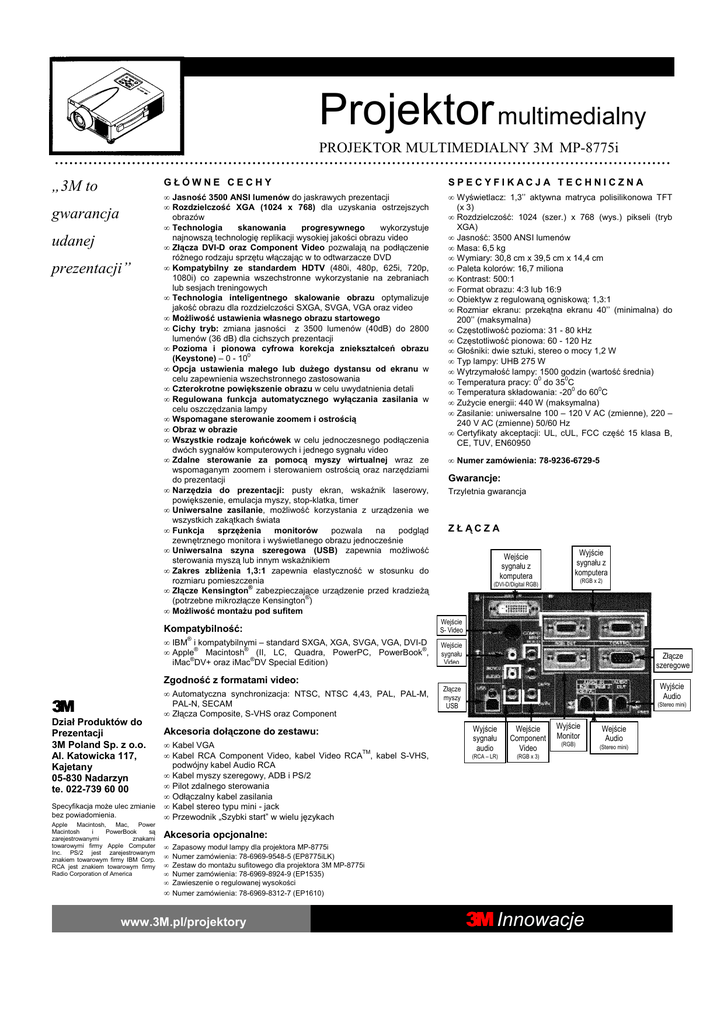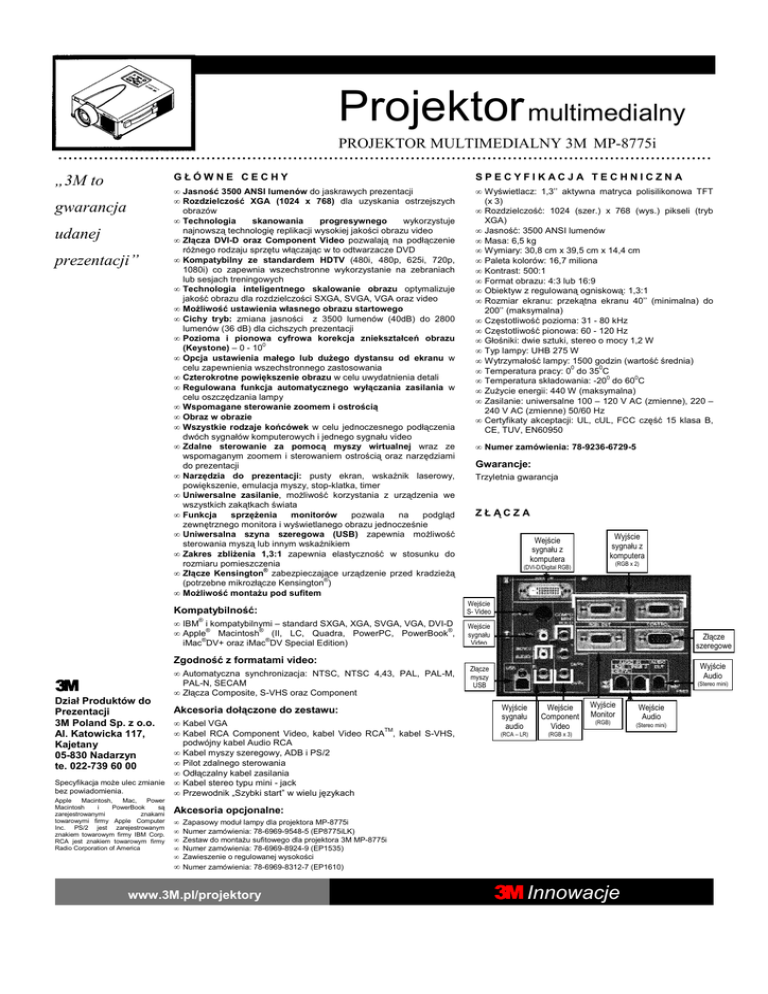 Projektor multimedialny PROJEKTOR MULTIMEDIALNY 3M MP-8775i ................................................................................................................................ „3M to gwarancja udanej prezentacji” GŁÓWNE CECHY SPECYFIKACJ A TECHNICZNA • Jasność 3500 ANSI lumenów do jaskrawych prezentacji • Rozdzielczość XGA (1024 x 768) dla uzyskania ostrzejszych obrazów • Technologia skanowania progresywnego wykorzystuje najnowszą technologię replikacji wysokiej jakości obrazu video • Złącza DVI-D oraz Component Video pozwalają na podłączenie różnego rodzaju sprzętu włączając w to odtwarzacze DVD • Kompatybilny ze standardem HDTV (480i, 480p, 625i, 720p, 1080i) co zapewnia wszechstronne wykorzystanie na zebraniach lub sesjach treningowych • Technologia inteligentnego skalowanie obrazu optymalizuje jakość obrazu dla rozdzielczości SXGA, SVGA, VGA oraz video • Możliwość ustawienia własnego obrazu startowego • Cichy tryb: zmiana jasności z 3500 lumenów (40dB) do 2800 lumenów (36 dB) dla cichszych prezentacji • Pozioma i pionowa cyfrowa korekcja zniekształceń obrazu (Keystone) – 0 - 100 • Opcja ustawienia małego lub dużego dystansu od ekranu w celu zapewnienia wszechstronnego zastosowania • Czterokrotne powiększenie obrazu w celu uwydatnienia detali • Regulowana funkcja automatycznego wyłączania zasilania w celu oszczędzania lampy • Wspomagane sterowanie zoomem i ostrością • Obraz w obrazie • Wszystkie rodzaje końcówek w celu jednoczesnego podłączenia dwóch sygnałów komputerowych i jednego sygnału video • Zdalne sterowanie za pomocą myszy wirtualnej wraz ze wspomaganym zoomem i sterowaniem ostrością oraz narzędziami do prezentacji • Narzędzia do prezentacji: pusty ekran, wskaźnik laserowy, powiększenie, emulacja myszy, stop-klatka, timer • Uniwersalne zasilanie, możliwość korzystania z urządzenia we wszystkich zakątkach świata • Funkcja sprzężenia monitorów pozwala na podgląd zewnętrznego monitora i wyświetlanego obrazu jednocześnie • Uniwersalna szyna szeregowa (USB) zapewnia możliwość sterowania myszą lub innym wskaźnikiem • Zakres zbliżenia 1,3:1 zapewnia elastyczność w stosunku do rozmiaru pomieszczenia • Złącze Kensington® zabezpieczające urządzenie przed kradzieżą ® (potrzebne mikrozłącze Kensington ) • Możliwość montażu pod sufitem • Wyświetlacz: 1,3’’ aktywna matryca polisilikonowa TFT (x 3) • Rozdzielczość: 1024 (szer.) x 768 (wys.) pikseli (tryb XGA) • Jasność: 3500 ANSI lumenów • Masa: 6,5 kg • Wymiary: 30,8 cm x 39,5 cm x 14,4 cm • Paleta kolorów: 16,7 miliona • Kontrast: 500:1 • Format obrazu: 4:3 lub 16:9 • Obiektyw z regulowaną ogniskową: 1,3:1 • Rozmiar ekranu: przekątna ekranu 40’’ (minimalna) do 200’’ (maksymalna) • Częstotliwość pozioma: 31 - 80 kHz • Częstotliwość pionowa: 60 - 120 Hz • Głośniki: dwie sztuki, stereo o mocy 1,2 W • Typ lampy: UHB 275 W • Wytrzymałość lampy: 1500 godzin (wartość średnia) • Temperatura pracy: 00 do 350C • Temperatura składowania: -200 do 600C • Zużycie energii: 440 W (maksymalna) • Zasilanie: uniwersalne 100 – 120 V AC (zmienne), 220 – 240 V AC (zmienne) 50/60 Hz • Certyfikaty akceptacji: UL, cUL, FCC część 15 klasa B, CE, TUV, EN60950 Kompatybilność: ® • IBM i kompatybilnymi – standard SXGA, XGA, SVGA, VGA, DVI-D • Apple® Macintosh® (II, LC, Quadra, PowerPC, PowerBook®, ® ® iMac DV+ oraz iMac DV Special Edition) Zgodność z formatami video: 3M Dział Produktów do Prezentacji 3M Poland Sp. z o.o. Al. Katowicka 117, Kajetany 05-830 Nadarzyn te. 022-739 60 00 • Automatyczna synchronizacja: NTSC, NTSC 4,43, PAL, PAL-M, PAL-N, SECAM • Złącza Composite, S-VHS oraz Component Akcesoria dołączone do zestawu: • Kabel VGA • Kabel RCA Component Video, kabel Video RCATM, kabel S-VHS, podwójny kabel Audio RCA • Kabel myszy szeregowy, ADB i PS/2 • Pilot zdalnego sterowania • Odłączalny kabel zasilania Specyfikacja może ulec zmianie • Kabel stereo typu mini - jack bez powiadomienia. • Przewodnik „Szybki start” w wielu językach Apple Macintosh, Mac, Power Macintosh i PowerBook są zarejestrowanymi znakami towarowymi firmy Apple Computer Inc. PS/2 jest zarejestrowanym znakiem towarowym firmy IBM Corp. RCA jest znakiem towarowym firmy Radio Corporation of America • Numer zamówienia: 78-9236-6729-5 Gwarancje: Trzyletnia gwarancja ZŁ ĄCZ A Wejście sygnału z komputera Wyjście sygnału z komputera (RGB x 2) (DVI-D/Digital RGB) Wejście S- Video Wejście sygnału Video Złącze szeregowe Wyjście Audio Złącze myszy USB (Stereo mini) Wyjście sygnału audio (RCA – LR) Wejście Component Video Wyjście Monitor (RGB) (RGB x 3) Akcesoria opcjonalne: • • • • • Zapasowy moduł lampy dla projektora MP-8775i Numer zamówienia: 78-6969-9548-5 (EP8775iLK) Zestaw do montażu sufitowego dla projektora 3M MP-8775i Numer zamówienia: 78-6969-8924-9 (EP1535) Zawieszenie o regulowanej wysokości • Numer zamówienia: 78-6969-8312-7 (EP1610) www.3M.pl/projektory 3M Innowacje Wejście Audio (Stereo mini)