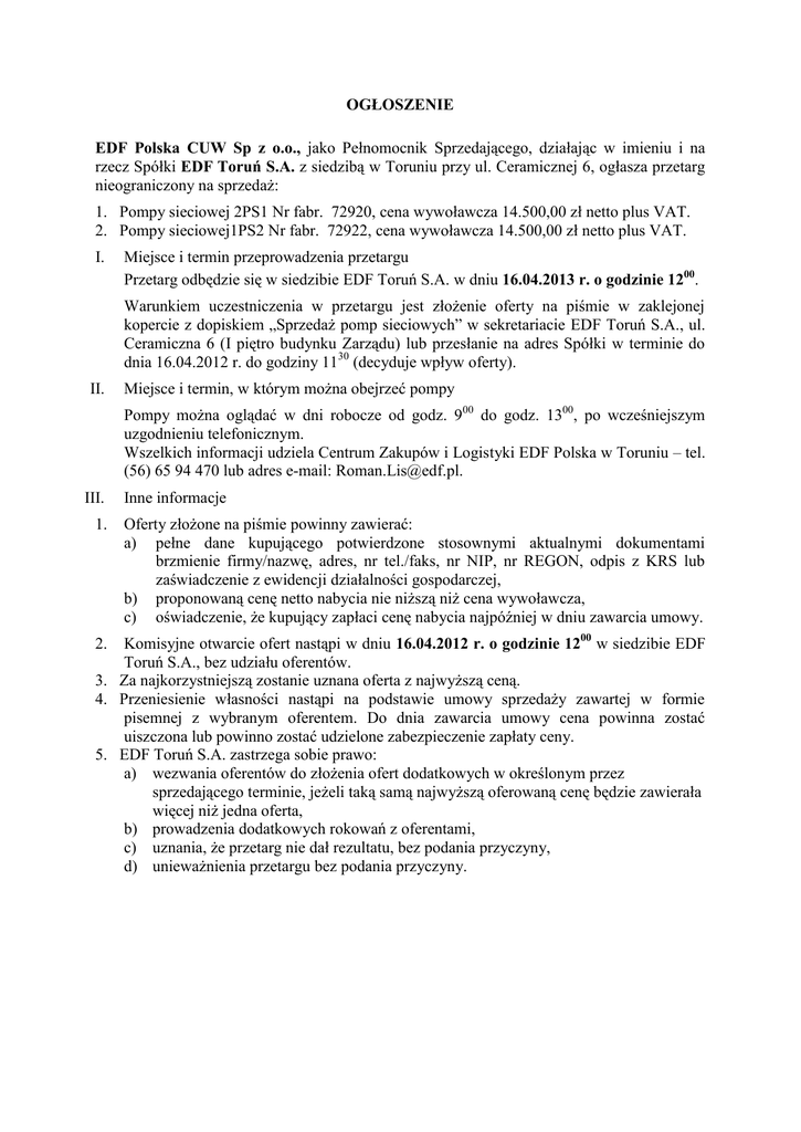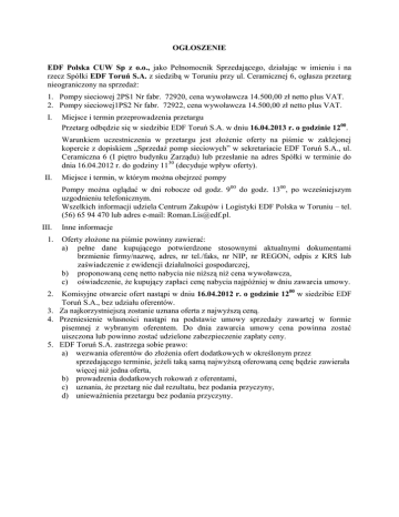 OGŁOSZENIE EDF Polska CUW Sp z o.o., jako Pełnomocnik Sprzedającego, działając w imieniu i na rzecz Spółki EDF Toruń S.A. z siedzibą w Toruniu przy ul. Ceramicznej 6, ogłasza przetarg nieograniczony na sprzedaż: 1. Pompy sieciowej 2PS1 Nr fabr. 72920, cena wywoławcza 14.500,00 zł netto plus VAT. 2. Pompy sieciowej1PS2 Nr fabr. 72922, cena wywoławcza 14.500,00 zł netto plus VAT. I. Miejsce i termin przeprowadzenia przetargu Przetarg odbędzie się w siedzibie EDF Toruń S.A. w dniu 16.04.2013 r. o godzinie 1200. Warunkiem uczestniczenia w przetargu jest złożenie oferty na piśmie w zaklejonej kopercie z dopiskiem „Sprzedaż pomp sieciowych” w sekretariacie EDF Toruń S.A., ul. Ceramiczna 6 (I piętro budynku Zarządu) lub przesłanie na adres Spółki w terminie do dnia 16.04.2012 r. do godziny 1130 (decyduje wpływ oferty). II. Miejsce i termin, w którym można obejrzeć pompy Pompy można oglądać w dni robocze od godz. 900 do godz. 1300, po wcześniejszym uzgodnieniu telefonicznym. Wszelkich informacji udziela Centrum Zakupów i Logistyki EDF Polska w Toruniu – tel. (56) 65 94 470 lub adres e-mail: [email protected]. III. 1. Inne informacje Oferty złożone na piśmie powinny zawierać: a) pełne dane kupującego potwierdzone stosownymi aktualnymi dokumentami brzmienie firmy/nazwę, adres, nr tel./faks, nr NIP, nr REGON, odpis z KRS lub zaświadczenie z ewidencji działalności gospodarczej, b) proponowaną cenę netto nabycia nie niższą niż cena wywoławcza, c) oświadczenie, że kupujący zapłaci cenę nabycia najpóźniej w dniu zawarcia umowy. Komisyjne otwarcie ofert nastąpi w dniu 16.04.2012 r. o godzinie 1200 w siedzibie EDF Toruń S.A., bez udziału oferentów. 3. Za najkorzystniejszą zostanie uznana oferta z najwyższą ceną. 4. Przeniesienie własności nastąpi na podstawie umowy sprzedaży zawartej w formie pisemnej z wybranym oferentem. Do dnia zawarcia umowy cena powinna zostać uiszczona lub powinno zostać udzielone zabezpieczenie zapłaty ceny. 5. EDF Toruń S.A. zastrzega sobie prawo: a) wezwania oferentów do złożenia ofert dodatkowych w określonym przez sprzedającego terminie, jeżeli taką samą najwyższą oferowaną cenę będzie zawierała więcej niż jedna oferta, b) prowadzenia dodatkowych rokowań z oferentami, c) uznania, że przetarg nie dał rezultatu, bez podania przyczyny, d) unieważnienia przetargu bez podania przyczyny. 2. Podstawowe parametry agregatów pompowych Pompa wody sieciowej typu 35W50m-2 Dane techniczne: wydajność nominalna Q: 1400 m3/h, wydajność maksymalna Qmax.: 1600 m3/h, wydajność minimalna Qmin.: 700 m3/h,(napęd zmienno-obrotowy) wysokość podnoszenia nominalna H: 150 m, max. temperatura pompowanej wody: 150 °C. nr fabryczny 72922 rok budowy 1982 Silnik indukcyjny 3-fazowy typ silnika SCU dm 134 S-E (pierścieniowy) napięcie zasilania 6kV moc silnika 800 kW obroty silnika nominalne: 1485 obr./min. nr fabryczny 141751 rok budowy 1997 Rys. 3 – Przekrój pompy sieciowej typu 35W50 1. Korpus ssawny 8. Wirnik 2. Korpus tłoczny 9. Sprzęgło 3. 4. 5. 6. 7. Człon Pierścień oporowy I Pierścień oporowy II Tarcza odciążająca Kierownica 10. 11. 12. 13. 14. Korpus dławicy Korpus łożyskowy Pierścienie uszczelniające Dławik Przekładka 15. Wał Pierścień 16. smarujący 17. Śruba ściągowa 18. Panewka górna 19. Panewka dolna 20. Tuleja ochronna H (m) Nz /10 (kW) teta (%) 20 0 H=f(Q) 18 0 Qmin 16 0 Qmax 14 0 12 0 10 0 80 60 40 20 0 0 50 0 10 00 15 00 Q(m3/h) Wykres 12 – Charakterystyka pompy 35W50 20 00