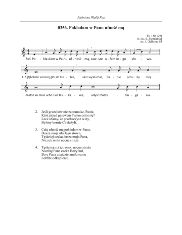 Pieśni na Wielki Post 0356. Pokładam w Panu ufność mą Ps. 130(129) tł.: ks. S. Ziemiański m.: J. Gelineau SJ Ref. Po - kła-dam w Pa-nu uf - ność mą, zaw- sze u - fam Je - go 1. Z głębokości wznoszę głos do Cie - bie, nakłoń ku mnie ucho Twe łas - ka - racz wysłuchać, wie, Pa - nie usłysz modły 2. Jeśli grzechów nie zapomnisz, Panie, Któż przed gniewem Twym ostoi się? Lecz ufamy, że przebaczysz winy, Byśmy kornie Ci służyli. 3. Całą ufność mą pokładam w Panu, Dusza moja ufa Jego słowu, Tęskniej czeka dusza moja Pana, Niż jutrzenki nocne straże. 4. Tęskniej niż jutrzenki nocne straże Niechaj Pana czeka Boży lud, Bo u Pana znajdzie zmiłowanie I obfite odkupienie. i sło - wu. proś - by mej. bła - ga - nia.