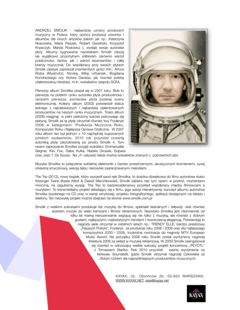 ANDRZEJ SMOLIK - najbardziej uznany producent muzyczny w Polsce, który oprócz produkcji utworów i albumów dla innych artystów (takich jak np.: Katarzyna Nosowska, Maria Peszek, Robert Gawliński, Krzysztof Krawczyk, Maryla Rodowicz ), wydaje swoje autorskie płyty. Albumy sygnowane nazwiskiem Smolik cieszą się wyjątkowo przychylnym odbiorem zarówno wśród publiczności, fanów, jak i wśród recenzentów i całej branży muzycznej. Do współpracy przy swoich płytach Smolik zawsze zapraszał znamienitych gości min.: Artura Rojka (Myslovitz), Novikę, Mikę Urbaniak, Bogdana Kondrackiego czy Victora Daviesa, jak również polską utalentowaną młodzież, m.in. wokalistów zespołu SOFA. Pierwszy album Smolika ukazał się w 2001 roku. Była to pierwsza na polskim rynku autorska płyta producencka i zarazem pierwsza, pionierska płyta polskiej sceny elektronicznej. Kolejny album (2003) potwierdził status jednego z najciekawszych i najbardziej utalentowanych producentów na naszym rynku muzycznym. Trzeci album (2006) osiągnął w pełni zasłużony sukces pokrywając się platyną. Smolik za tę płytę otrzymał również trzy Fryderyki 2006 w kategoriach: Produkcja Muzyczna Roku, Kompozytor Roku i Najlepsza Oprawa Graficzna. W 2007 roku album ten był jednym z 10 najchętniej kupowanych polskich wydawnictw. 2010 rok przyniósł czwartą autorską płytę zatytułowaną po prostu Smolik 4. Tym razem zaproszenie Smolika przyjęli wokaliści: Emmanuelle Seigner, Kev Fox, Gaba Kulka, Natalia Grosiak, Sqbass oraz Joao T. De Sousa. Na „4“ usłyszeć także można wokalistów znanych z poprzednich płyt. Muzyka Smolika to połączenie subtelnej elektroniki z bardzo przestrzennymi, akustycznymi brzmieniami, żywą orkiestrą smyczkową, sekcją dętą i niezwykle zaaranżowanymi melodiami. The Trip (2012), nowy krążek, który wyszedł spod ręki Smolika, to ścieżka dźwiękowa do filmu autorstwa duetu Kissinger Twins (Kasia Kifert & Dawid Marcinkowski). Smolik zabiera nas tym razem w podróż, momentami mroczną, na zagubioną wyspę. The Trip to bezprecedensowy przykład współpracy między filmowcami a muzykiem. To transmedialny projekt składający się z filmu, jego wersji interaktywnej, koncept albumu autorstwa Smolika (wydanego na CD oraz w wersji winylowej), projektu fotograficznego, aplikacji dostępnych na tablety i telefony. Ten niezwykły projekt można obejrzeć na stronie www.smolik.com.pl Smolik z wielkimi sukcesami produkuje też muzykę do filmów, spektakli teatralnych i telewizji. Jest również autorem muzyki do wielu kampanii i filmów reklamowych. Nazwisko Smolika jest niezmiennie od kilku lat marką nierozerwalnie wiążącą się nie tylko z muzyką, ale również z dobrym gustem, najlepszymi i najświeższymi trendami i nowoczesną elegancją. Potwierdzją to nagrody jakie otrzymał w ostatnich latach np.: TRENDY ELLE, bardzo prestiżowy „Paszport Polityki“, Fryderyk za produkcje roku 2006 i 2009 oraz dla najlepszego kompozytora 2003 i 2006, trzykrotna nominacja do nagrody MTV European Music Aword. Na początku 2008 roku Smolik został wyróżniony nagrodą Kreatura 2008 za wkład w muzykę reklamową. W 2009 Smolik zaangażował się również w odnoszący wielkie sukcesy projekt koncertowy „PEYOTL“ z Tomaszem Stańko. Rok 2010 przyniósł ważne wyróżnienie na festiwalu Soundedit, gdzie Smolik otrzymał nagrodę Człowieka ze Złotym Uchem dla najwybitniejszych producentów muzycznych. KAYAX, UL. Obrońców 2b, 03-933 WARSZAWA, WWW.KAYAX.NET, [email protected]