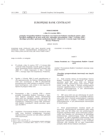 18.11.2004 PL Dziennik Urzędowy Unii Europejskiej C 281/3 EUROPEJSKI BANK CENTRALNY POROZUMIENIE z dnia 16 września 2004 r. pomiędzy Europejskim Bankiem Centralnym oraz krajowymi bankami centralnymi państw członkowskich znajdujących się poza strefą euro, zmieniające porozumienie z dnia 1 września 1998 r. określające procedury operacyjne mechanizmu kursów walutowych w trzecim etapie Unii Gospodarczej i Walutowej (2004/C 281/03) EUROPEJSKI BANK CENTRALNY (EBC) ORAZ KRAJOWE BANKI CENTRALNE PAŃSTW CZŁONKOWSKICH ZNAJDUJĄCYCH SIĘ POZA STREFĄ EURO (ZWANE DALEJ „KBC SPOZA STREFY EURO”), UZGODNIŁY, CO NASTĘPUJE: Artykuł 1 mając na uwadze, co następuje: Zmiana brzmienia art. 5 Porozumienia Banków Centralnych (1) W uchwale z dnia 16 czerwca 1997 r. (1) (zwanej dalej „Uchwałą”) Rada Europejska wyraziła zgodę na wprowadzenie mechanizmu kursów walutowych (zwanego dalej „ERM II”) z chwilą rozpoczęcia w dniu 1 stycznia 1999 r. trzeciego etapu Unii Gospodarczej i Walutowej. Artykuł 5 Porozumienia Banków Centralnych otrzymuje następujące brzmienie: „Procedury przeprowadzania interwencji oraz innych transakcji (2) Zgodnie z Uchwałą, ERM II został zaprojektowany w celu zagwarantowania, aby Państwa Członkowskie spoza strefy euro uczestniczące w ERM II ukierunkowały prowadzoną przez siebie politykę na stabilność i wzmacnianie konwergencji, a tym samym w celu wsparcia ich dążenia do przyjęcia waluty euro. (3) Porozumienie z dnia 1 września 1998 r. zawarte pomiędzy Europejskim Bankiem Centralnym a krajowymi bankami centralnymi Państw Członkowskich spoza strefy euro określające procedury operacyjne dla mechanizmu kursów walutowych w trzecim etapie Unii Gospodarczej i Walutowej (2) (zwane dalej „Porozumieniem Banków Centralnych”) określa procedury operacyjne dla ERM II. (4) Artykułowi 5 Porozumienia Banków Centralnych należy nadać nowe brzmienie uwzględniające wzrastające międzynarodowe znaczenie euro jako jednej z głównych walut rezerwowych, (1) Dz.U. C 236 z 2.8.1997, str. 5. (2) Dz.U. C 345 z 13.11.1998, str. 6. Porozumienie ostatnio zmienione porozumieniem z 29 kwietnia 2004 r. (Dz.U. C 135 z 13.5.2004, str. 3). 5.1 Bank centralny należący do Europejskiego Systemu Banków Centralnych jest zobowiązany do uzyskania uprzedniej zgody KBC spoza strefy euro będącego emitentem waluty interwencyjnej, jeżeli zamierza wykorzystać walutę tego banku w ilościach przekraczających wzajemnie uzgodnione limity w związku z wszelkimi interwencjami nieobowiązkowymi, w tym jednostronnymi interwencjami w ramach pasma. 5.2 KBC spoza strefy euro jest zobowiązany do natychmiastowego poinformowania EBC w przypadku wykorzystania waluty euro w ilościach przekraczających wzajemnie uzgodnione limity w związku z wszelkimi interwencjami nieobowiązkowymi, w tym jednostronnymi interwencjami w ramach pasma. 5.3 Przed przeprowadzeniem transakcji innych niż interwencje, wykorzystujących przynajmniej jedną walutę spoza strefy euro lub walutę euro oraz przekraczających wzajemnie uzgodnione limity, strona zamierzająca przeprowadzić takie transakcje jest zobowiązana do uprzedniego poinformowania zainteresowanego banku lub banków centralnych. W takich przypadkach zainteresowane banki centralne uzgadniają sposób postępowania pozwalający na ograniczenie potencjalnych trudności, w tym ewentualne rozliczenie całej transakcji lub jej części bezpośrednio pomiędzy takimi dwoma bankami centralnymi.”. C 281/4 Dziennik Urzędowy Unii Europejskiej PL 18.11.2004 Artykuł 2 Postanowienia końcowe 1. Niniejsze porozumienie wchodzi w życie dnia 1 października 2004 r. 2. Niniejsze porozumienie zostało sporządzone w języku angielskim, francuskim i niemieckim oraz należycie podpisane przez strony. EBC, którego obowiązkiem jest zachowanie autentycznych dokumentów porozumienia, przesyła poświadczone kopie każdego z autentycznych dokumentów porozumienia w języku, angielskim, francuskim i niemieckim do każdego KBC strefy euro oraz spoza strefy euro. Sporządzono we Frankfurcie nad Menem, dnia 16 września 2004 r. W imieniu W imieniu Europejskiego Banku Centralnego Magyar Nemzeti Bank W imieniu W imieniu Česká národní banka Bank Ċentrali ta' Malta/ Central Bank of Malta W imieniu W imieniu Danmarks Nationalbank Narodowego Banku Polskiego W imieniu W imieniu Eesti Pank Banka Slovenije W imieniu W imieniu Central Bank of Cyprus Národná banka Slovenska W imieniu W imieniu Latvijas Banka Sveriges Riksbank W imieniu W imieniu Lietuvos bankas Bank of England