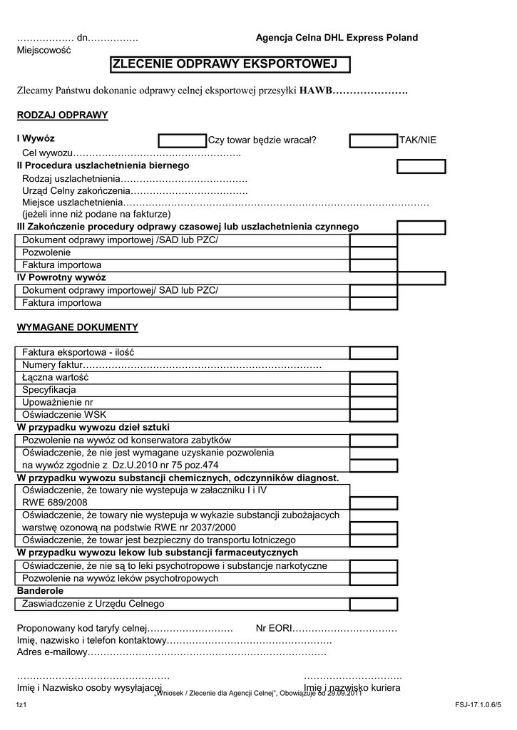 ……………… dn……………. Miejscowość Agencja Celna DHL Express Poland ZLECENIE ODPRAWY EKSPORTOWEJ Zlecamy Państwu dokonanie odprawy celnej eksportowej przesyłki HAWB…………………. RODZAJ ODPRAWY I Wywóz Czy towar będzie wracał? TAK/NIE Cel wywozu…………………………………………….. II Procedura uszlachetnienia biernego Rodzaj uszlachetnienia…………………………………. Urząd Celny zakończenia………………………………. Miejsce uszlachetnienia…………………………………………………………………………………… (jeżeli inne niż podane na fakturze) III Zakończenie procedury odprawy czasowej lub uszlachetnienia czynnego Dokument odprawy importowej /SAD lub PZC/ Pozwolenie Faktura importowa IV Powrotny wywóz Dokument odprawy importowej/ SAD lub PZC/ Faktura importowa WYMAGANE DOKUMENTY Faktura eksportowa - ilość Numery faktur………………………………………………………………… Łączna wartość Specyfikacja Upoważnienie nr Oświadczenie WSK W przypadku wywozu dzieł sztuki Pozwolenie na wywóz od konserwatora zabytków Oświadczenie, że nie jest wymagane uzyskanie pozwolenia na wywóz zgodnie z Dz.U.2010 nr 75 poz.474 W przypadku wywozu substancji chemicznych, odczynników diagnost. Oświadczenie, że towary nie wystepuja w załaczniku I i IV RWE 689/2008 Oświadczenie, że towary nie wystepuja w wykazie substancji zubożajacych warstwę ozonową na podstwie RWE nr 2037/2000 Oświadczenie, że towar jest bezpieczny do transportu lotniczego W przypadku wywozu lekow lub substancji farmaceutycznych Oświadczenie, że nie są to leki psychotropowe i substancje narkotyczne Pozwolenie na wywóz leków psychotropowych Banderole Zaswiadczenie z Urzędu Celnego Proponowany kod taryfy celnej……………………… Nr EORI…………………………… Imię, nazwisko i telefon kontaktowy……………………………………………. Adres e-mailowy………………………………………………………………… ………………………………………… …………………………. Imię i Nazwisko osoby wysyłajacej Imię i nazwisko kuriera „Wniosek / Zlecenie dla Agencji Celnej”, Obowiązuje od 29.09.2011 1z1 FSJ-17.1.0.6/5