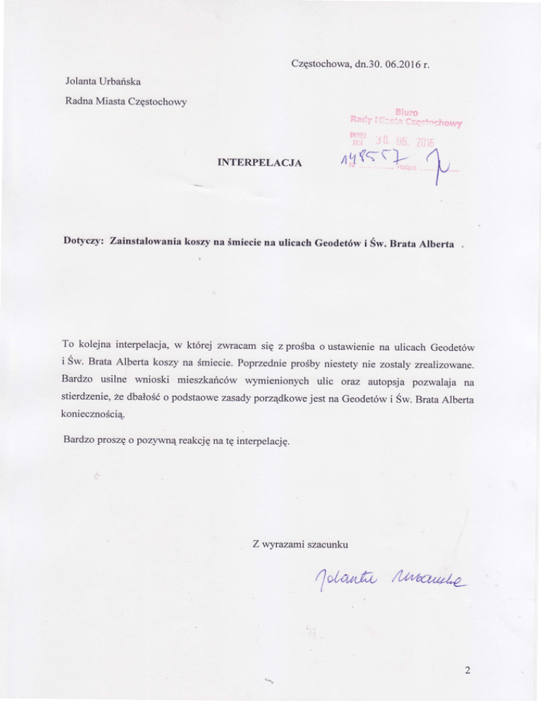 Częstochowądn.30.06.2016t, JolantaUrbańska RadnaMiasta Częstochowy Rariyr:::1P=iĘ:*^ę66* INTERPELACJA Dotycry: Zainstalowania koszy na śmieciena ulicach Geodetów i Św. Brata Albeńa To kolejna interpelacja, w której zwTacamsię z prośbao ustawienie na ulicach Geodetów i Św. Brata A|perta koszy na śmiecie.Poprzednie prośbyniestety nie zostaly neaiizowane, Bardzo usilne wnioski mieszkańców wymienionych ulic oraz autopsja pozvtalaja na stierdzenie,Że dbałość o podstaowezasadyporządkowejest na Geodetówi Św. BrataAlberta koniecznością. Bardzo proszęo pozywnąreakcjęna tę interpelację. Zvtytazami szacunku rlał,ą/tfr,,