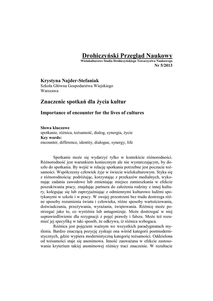 Drohiczyński Przegląd Naukowy Wielokulturowe Studia Drohiczyńskiego Towarzystwa Naukowego Nr 5/2013 Krystyna Najder-Stefaniak Szkoła Główna Gospodarstwa Wiejskiego Warszawa Znaczenie spotkań dla życia kultur Importance of encounter for the lives of cultures Słowa kluczowe spotkanie, różnica, tożsamość, dialog, synergia, życie Key words: encounter, difference, identity, dialogue, synergy, life Spotkanie może się wydarzyć tylko w kontekście różnorodności. Różnorodność jest warunkiem koniecznym ale nie wystarczającym, by doszło do spotkania. By wejść w relację spotkania potrzebne jest poczucie tożsamości. Współczesny człowiek żyje w świecie wielokulturowym. Styka się z różnorodnością: podróżując, korzystając z przekazów medialnych, wykonując zadania zawodowe lub zmieniając miejsce zamieszkania w efekcie poszukiwania pracy, znajdując partnera do założenia rodziny z innej kultury, kolegując się lub zaprzyjaźniając z odmiennymi kulturowo ludźmi spotykanymi w szkole i w pracy. W swojej przestrzeni bez trudu dostrzega różne sposoby rozumienia świata i człowieka, różne sposoby wartościowania, doświadczania, przeżywania, wyrażania, świętowania. Różnicę może postrzegać jako to, co wyróżnia lub antagonizuje. Może dostrzegać w niej usprawiedliwienie dla rezygnacji z pojęć prawdy i fałszu. Może też rozumieć jej specyfikę w taki sposób, że odkrywa, iż różnica wzbogaca. Różnica jest pojęciem ważnym we wszystkich paradygmatach myślenia. Bardzo znaczącą pozycję zyskuje ona wśród kategorii postmodernistycznych, gdzie wypiera modernistyczną kategorię tożsamości. Oddzielona od tożsamości staje się anonimowa. Inność zauważana w efekcie zastosowania kryterium takiej anonimowej różnicy traci znaczenie. W rezultacie 112 Krystyna Nader-Stefaniak chcąc przeciwdziałać antagonizmom postmodernistyczni teoretycy postulują usprawiedliwianie i akceptowanie każdej inności. Konsekwencją jest rezygnacja z uniwersalnych wartości prawdy, dobra i piękna, walka o to by nie być podobnym nawet do samego siebie i całkowita przygodność bytów. Zauważmy, że człowiek zagubiony w świecie anonimowych różnic nie wypracowuje własnej tożsamości i nie docenia tożsamości innych. W rezultacie nie potrafi realizować spotkań. By zrozumieć spotkanie potrzebne są dwa pojęcia: różnica i tożsamość. Z postmodernistycznego widzenia świata akcentującego wartość różnicy jako autoteliczną wynika, że podmiot powinien konsekwentnie koncentrować się na obronie własnej inności, czyli pilnować, by nie stać się podobnym do innych a także, by nie stać się podobnym do siebie, by nie zacząć się powtarzać. Do zaakceptowania jest tu jedynie powoływanie do istnienia „nowego”, które nie ma trwania. To „nowe” jest negatywną odpowiedzią na to, co zauważamy. Czy w kontekście takiej postawy możliwe jest poczucie tożsamości? Czy możliwe są spotkania? Pozorna obrona inności doprowadza do postawy ignorowania treści niesionych przez to, co inne. Spotkania wydają się niepotrzebne, a nawet niebezpieczne. Postmodernistyczna różnica podobnie jak modernistyczna wciąż niepokoi swoją zdolnością do antagonizowania. Rezultatem myślenia rezygnującego z tożsamości nie mogą być działania prowadzące do różnorodności niezbędnej by mogło dochodzić do spotkań. Inny sposób na uporanie się z problemem różnicy znajdujemy w myśleniu porządkowanym przez metaforę ugruntowaną w pojęciu ekosystemu. Perspektywa ekosystemu i schemat relacji ekosystemowej pozwala zauważyć, że różnica wpisuje się w systemowe zależności, jest konieczna, by mógł powstać i żyć ekosystem, a także by mogły żyć jego elementy. Zaczynamy rozumieć dlaczego różnica nie musi antagonizować. Różnorodność jest u podstaw życia ekosystemów. Umożliwia też twórcze trwanie kulturom. Dlaczego? Postawienie tego pytania sprawia, że uświadamiamy sobie wartość spotkań i to, że może do nich dojść tylko, gdy różnorodności towarzyszy poczucie tożsamości elementów, które się na nią składają. Współczesny człowiek może korzystać z różnorodności i realizować spotkania, gdy ma poczucie tożsamości. Współczesny człowiek może też być medium ułatwiającym spotykanie się kultur. W zależności od praktykowanego przez nas sposobu myślenia o różnicy, będziemy zdolni realizować różne typy spotkań. Wyróżniamy: myślenie antagonizujące, myślenie dialektyczne, myślenie komplementarne i myślenie synergiczne. Myślenie dostrzegające i akcentujące antagonizujące Znaczenie spotkań dla życia kultur 113 właściwości różnicy jest myśleniem w schemacie „albo-albo”. Pozostając w tym schemacie przyjmujemy, że różnica dyskwalifikuje jeden z członów tego, co różne. W efekcie albo odrzucamy to, co inne broniąc tego, co własne, albo zafascynowani innością akceptujemy ją kosztem własnej inności. W myśleniu dialektycznym różnicę traktujemy jako antytezę, która umożliwia osiągnięcie syntezy. Myślenie komplementarne sumuje różnice zakładając, że są one efektem różnych perspektyw postrzegania lub realizowania tego samego. Myślenie synergiczne inspiruje się różnicami do pogłębienia rozumienia. Myślenie antagonizujące implikuje spotkania typu „konkurencji” lub „wrogości”. Myślenie dialektyczne współbrzmi ze spotkaniami typu „wspólnego poczucia braku”. Myślenie komplementarne doprowadza do spotkań typu „dopełnienia”. Spotkanie typu „poczucia godności”, jednocześnie własnej, jak i w stosunku do partnera, jest łatwe, gdy myślimy o różnicy w paradygmacie synergicznym. W tym ostatnim sposobie myślenia i działania różnica nie antagonizuje, nie inspiruje do obrony tożsamości, nie dopełnia, ani też nie usprawiedliwia braku perspektywy uniwersalizmu, lecz wzbogaca rozumienie i doświadczanie