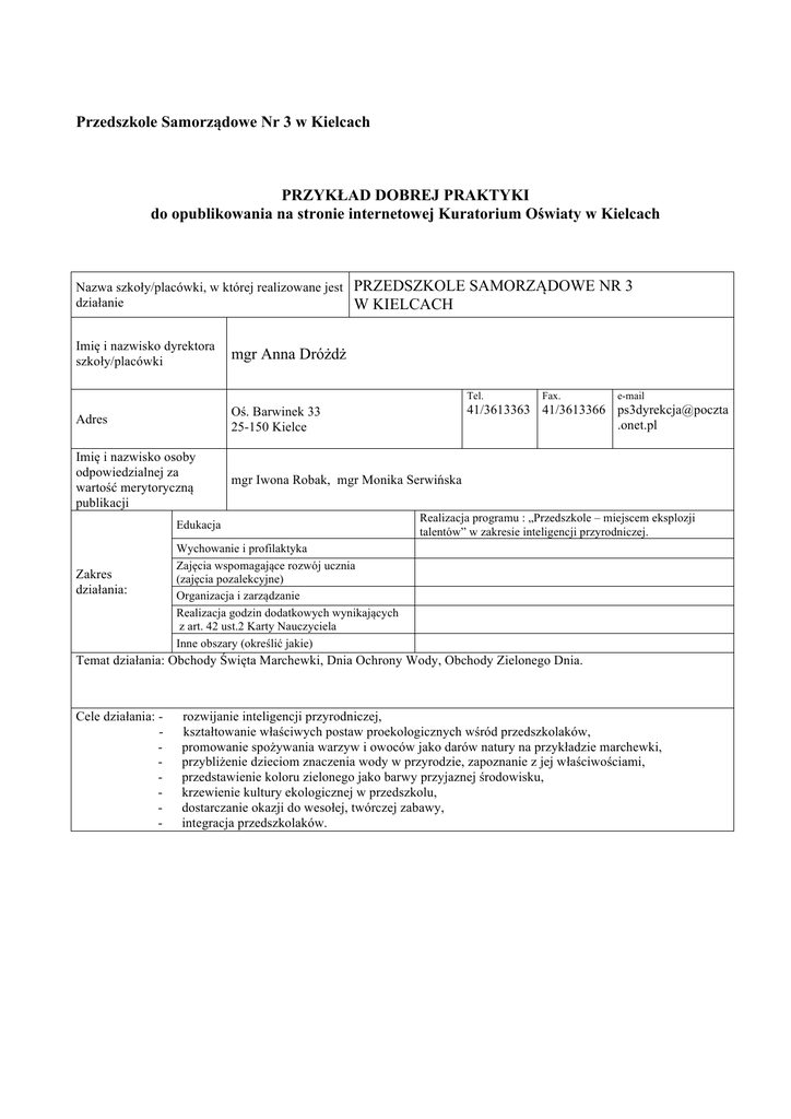 Przedszkole Samorządowe Nr 3 w Kielcach PRZYKŁAD DOBREJ PRAKTYKI do opublikowania na stronie internetowej Kuratorium Oświaty w Kielcach Nazwa szkoły/placówki, w której realizowane jest działanie PRZEDSZKOLE SAMORZĄDOWE NR 3 W KIELCACH Imię i nazwisko dyrektora szkoły/placówki mgr Anna Dróżdż Adres Oś. Barwinek 33 25-150 Kielce Imię i nazwisko osoby odpowiedzialnej za wartość merytoryczną publikacji mgr Iwona Robak, mgr Monika Serwińska Tel. Edukacja Zakres działania: Fax. e-mail 41/3613363 41/3613366 ps3dyrekcja@poczta .onet.pl Realizacja programu : „Przedszkole – miejscem eksplozji talentów” w zakresie inteligencji przyrodniczej. Wychowanie i profilaktyka Zajęcia wspomagające rozwój ucznia (zajęcia pozalekcyjne) Organizacja i zarządzanie Realizacja godzin dodatkowych wynikających z art. 42 ust.2 Karty Nauczyciela Inne obszary (określić jakie) Temat działania: Obchody Święta Marchewki, Dnia Ochrony Wody, Obchody Zielonego Dnia. Cele działania: - rozwijanie inteligencji przyrodniczej, kształtowanie właściwych postaw proekologicznych wśród przedszkolaków, promowanie spożywania warzyw i owoców jako darów natury na przykładzie marchewki, przybliżenie dzieciom znaczenia wody w przyrodzie, zapoznanie z jej właściwościami, przedstawienie koloru zielonego jako barwy przyjaznej środowisku, krzewienie kultury ekologicznej w przedszkolu, dostarczanie okazji do wesołej, twórczej zabawy, integracja przedszkolaków. Opis działania: Głównym celem i zadaniem Koncepcji Pracy naszego przedszkola jest rozwój inteligencji wielorakich naszych wychowanków oraz odkrywanie, rozwijanie i promowanie ich pasji i talentów. Wymóg kształcenia kluczowych kompetencji, rozwijania aktywnych, twórczych postaw przedszkolaków zainspirował nas nauczycieli do podejmowania wielu różnorodnych, innowacyjnych działań. Zaangażowanie dzieci w realizację wybranych działań ekologicznych rozbudziło w nich ciekawość poznania otaczającego świata przyrodniczego i sposobów jego ochrony. W ramach realizacji zaplanowanych działań ekologicznych na dany rok zorganizowaliśmy : 1. Święto Marchewki – by promować wśród wychowanków zdrowe odżywianie . 2. Dni Ochrony Wody – celem przybliżenia dzieciom jej znaczenia dla życia na Ziemi. 3. Obchody Zielonego Dnia – aby przedstawić kolor zielony jako barwę przyjazną środowisku, w którym żyjemy. Dzień 30 listopada był w naszym przedszkolu wyjątkowym dniem, ponieważ obchodziliśmy Święto Marchewki. Tego dnia dzieci przyszły ubrane na pomarańczowo, a w salach było wesoło i kolorowo. Uroczystość poprzedził cykl zajęć edukacyjnych związanych tematycznie z wyglądem i właściwościami warzyw i owoców oraz ich znaczeniem dla zdrowia człowieka. Przedszkolaki uczestniczyły w licznych pogadankach na temat zdrowotnych właściwości świeżych warzyw i owoców, a zwłaszcza marchewki i potraw z jej dodatkiem. Wysłuchały wierszy-(m.in. „Na straganie” J. Brzechwy „Marchewka”), które następnie inscenizowały, wykorzystując przygotowane przez siebie rekwizyty, uczestniczyły w licznych zabawach dydaktycznych (np. „Co nam Jesień w koszu niesie?”), których celem było wyodrębnienie marchewki i opisanie jej wyglądu, konkursach plastycznych – (np. „Na najładniej pokolorowaną marchewkę” ), wykonały również kukiełki z marchewki wykorzystując różnorodne materiały plastyczne (bibułę, szmatki, wełnę, pinezki, guziki, patyczki, itp.). Pomarańczowe ubrania przedszkolaków stały się prawdziwą ozdobą dziecięcej zabawy tanecznej do piosenki pt. „Urodziny Marchewki” oraz zabawy ruchowej do piosenki z wykorzystaniem chusty animacyjnej. Odbyły się również konkursy i zabawy, oczywiście z marchewką w roli głównej. Prawdziwą przyjemnością była degustacja świeżych marchewek i picie soku marchewkowego. rozpoznawanie marchewki zmysłami: smak, dotyk; poznanie historii marchewki, rozwiązywanie zagadek . Dzieci wspaniale bawiły się np. w „Lekcję ciszy” wg metody Montesorii – (po narysowanym okręgu przenosiły na otwartej dłoni marchewkę, tak aby nie upadła. Obchody Dnia Marchewki zakończyły się prezentacją wytworów dziecięcych oraz ich umiejętności wokalnych na scenie teatralnej naszego przedszkola. Śpiewając w/w piosenkę dzieci z dumą pokazały wykonane przez siebie kukiełki oraz inne prace plastyczne. Pamiątkowe zdjęcia uwieczniły ten wspaniały dzień. Obchody Dnia Wody zorganizowaliśmy w naszej placówce w ramach Światowego Dnia Wody, który przypada na dzień 24 marca. Celem obchodów Dnia Wody było uświadomienie dzieciom jej ogromnego znaczenia dla życia na Ziemi i potrzeby jej ochrony. Święto rozpoczęło się od rozmów nauczycieli z przedszkolakami na temat „Woda w przyrodziewoda krąży, woda to życie, woda do picia, nie ma wody na pustyni, skażenie wody, oszczędzanie wody, wspólne opracowanie REGULAMINU OSZCZĘDZANIA WODY i umieszczenie go w sali zajęć. Następnie dzieci poznały postać WODNIKA – pozytywnej postaci ekologicznej, która dba o ochronę wody na Ziemi i KAPACZA – negatywnej postaci ekologicznej, która zanieczyszcza ją – wyłonili różnice między nimi. Zapoznały się z jej właściwościami biorąc udział w zabawach badawczych doświadczeniach z wykorzystaniem wody (co pływa, co tonie, co rozpuszcza się w wodzie, oczyszczanie wody: przelewanie wody do naczyń o różnej wielkości i kształcie, porównywanie jej ilości, sprawdzanie, co pływa na jej powierzchni wody , a co w niej tonie, co się rozpuszcza, a co nie, parowanie wody). W kolejnym punkcie Obchodów Dnia Wody przedszkolaki uczestniczyły w zabawach muzyczno – ruchowych wykorzystując różnorodne rekwizyty koloru niebieskiego – stroje, koce, szarfy, bibułę, krążki do ćwiczeń, opaski z sylwetami kropelek wody oraz deszczowych chmur. Wykonały prace plastyczne na temat „Woda to życie” – malowan