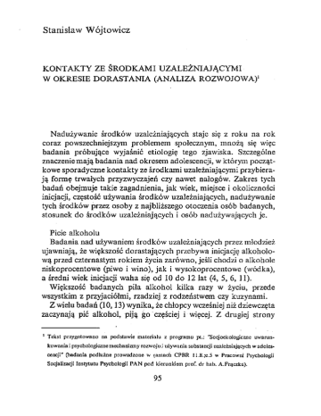 Stanisław Wójtowicz KONTAKTY ZE ŚRODKAMI UZALEŻNIAJĄCYMI W OKRESIE DORASTANIA (ANALIZA ROZWOJOWAj1 Nadużywanie środków uzależniających staje się z roku na rok coraz powszechniejszym problemem społecznym, mnożą się więc badania próbujące wyjaśnić etiologię tego zjawiska. Szczególne znaczenie mają badania nad okresem adolescencji, w którym począt kowe sporadyczne kontakty ze środkami uzależniającymi przybierają formę trwałych przyzwyczajeń czy nawet nałogów. Zakres tych badań obejmuje takie zagadnienia, jak wiek, miejsce i okoliczności inicjacji, częstość używania środków uzależniających, nadużywanie tych środków przez osoby z najbliższego otoczenia osób badanych, stosunek do środków uzależniających i osób nadużywających je. Picie alkoholu Badania nad używaniem środków uzależniających przez młodzież przebywa inicjację alkoholową przed czternastym rokiem życia zarówno, jeśli chodzi o alkohole niskoprocentowe (piwo i wino), jak i wysokoprocentowe (wódka), a średni wiek inicjacji waha się od 10 do 12 lat (4, 5, 6, 11). Większość badanych piła alkohol kilka razy w życiu, przede wszystkim z przyjaciółmi, rzadziej z rodzeństwem czy kuzynami. Z wielu badań (lO, 13) wynika, że chłopcy wcześniej niż dziewczęta zaczynają pić alkohol, piją go częściej i więcej. Z drugiej strony ujawniają, że większość dorastających I Tekst przygotowano on podstawie materiału z programu pl.: ''Socjoekologiczne uwarun- kowania i psycbologicznemecbanizmy rozwoju j używania substancji uzależniających wadolescencji" (badania podłużne prowadzone w ramach CPBR 11.8.;c.5 w Pracowni Psychologii Socjalizacji Instytutu Psychologii PAN pod kierunkiem prof. dr bab. 95 A.Frączka). Kwakman, Zuicker, Schippers i de Wuffcl (10) stwierdzili, że co prawda holenderscy 12-13-latkowie piją istotnie mniej alkoholu niż 14-15- i 16-20-latkowie, lecz nie odkryli istotnych rÓŻnic między chłopcami i dziewczętami. Spośród 350 czternastoletnich dzieci uczestniczących w badaniach przeprowadzonych w 1974 roku w Finlandii przez L. Pulkkinen do regularnego bądź o~onalnego picia alkoholu przyznało się w sumie 25% (14), w innych badaniach (6) liczbę tę szacuje się na 4-5% badanych. Badania, prowadzone w latach 1976-1978 w Polsce, wykazaly, że 51,9 % młodzieży ze szkół podstawowych spożywało alkohol (57,8% chłopców i 45,3 % dziewcząt) (9). W latach 197901980 tylko 35,5% młodzieży nie piło w ogóle (12). Spośród młodzieży szkół ponadpodstawowych 86,2 % piło alkohol, a 50,9 % chłopców i 30,4 % dziewcząt było przynajmniej raz w stanie zamroczenia alkoholowego (7). Wódz i Czekaj (16) badający studentów województwa katowickiego stwierdziii, że dla 59,1 % pierwszym spożywanym alkoholem bylo piwo bądź wino, zaś wódka dla 8,7 % badanych. Pierwszy kontakt z piwem poniżej dziesiątego roku życia deklarowało 6,8 %, z winem - 4,2 %, a z wódką - 2 % badanych, natomiast między 13 i 15 rokiem życia z piwem zetknęło się 37,8 % badanych, z winem - 48,3% i zwódką -15,6 %. Niezależnie 04 wieku ilość chłopców będących po inicjacji była większa niż ilość dziewcząt. Palenie tytoniu Według Światowejj Organizacji Zdrowia w latach 1983-1984 w krajach rozwijających się nastąpił znaczny wzrost palenia papierosów przez 14-15 latków, szczególnie dziewcząt, i jego spadek w krajach rozwiniętych (15). Ponad 50 % czeternastolatków w Stanach Zjednoczonych miało za sobą inicjację tytoniową (6). Często paliło 4 % badanej próby. Nie zanotowano istotnych różnic między chłopcami i dziewczętami, chociaż wśród nigdy nie palących więcej było dziewcząt, zaś w innych badaniach stwierdzono, że większą grupę palących wśród dorastających stanowią dziewczęta (29 %, chłopcy 20 %), lecz chłopcy palą częściej. Podobne wyniki uzyskano w innych badaniach (l, 5, 13). W badaniach norweskich (8) wykazano, że największy przyrost liczby dorastających rozpoczynających palenie jest między 11,5 i 13,5 rokiem życia. 96 Niektóre badania pokazują, że kilkuletnia intensywna kampania antynikotynowa może spowodować spadek liczby osób palących wśród uczniów szkół średnich (5, 13). Używanie innych środków uzależniających 51 % czternastolatków z grupy badanej przez Keyes i Blocka (6) paliło przynajmniej raz marihuanę, w tym 10 % używało jej często. W grupie starszej (5) osoby po "marihuanowej" inicjacji stanowiły 60% ogółu badanych, w tym palące często 21 %. Częściej palącymi marihuanę były dziewczęta. "Cięższe" środki odurzające (haszysz, kokaina, halucynogenne, barbituraty, itp.) próbowało, najczęściej w celach rozrywkowych, 12-19 % wszystkich badanych (6). Nie zanotowano istotnych różnic między płciami, chociaż do używania tych środków przyznawało się więcej dziewcząt. Wśród starszych badanych (5) używających "cięż sze" narkotyki było o ok. 10 % więcej niż w młodszej grupie (dla środków halucynogennych dane były porównywalne). Już ten pobieżny przegląd wyników niektórych badań pozwala wskazać na kilka prawidłowości w zakresie używania środków uzależniających przez dorastającą młodzież. Po pierwsze, ilość osób będących po inicjacji używania, jak i częstość używania środków uzależniających wzrasta wraz z wiekiem badanych. Po drugie, najpowszechniej używanymi środkami uzależniającymi okazały się piwo i wino, a w dalszej kolejności tytoń, marihuana i wódka. Po trzecie, mimo iż chłopcy częściej niż dziewczęta sięgają po substancje uzależniające, to różnica między nimi na ogół nie jest istotna. Po czwarte, można zaobserwować różnice między wynikami badań przeprowadzanych w różnych krajach. Cytowane powyżej badaniadostarczają danych mówiących o pewnym poziomie rozpowszechnienia i częstości używania środków uzależniających, lecz niewiele mówią nam o tend