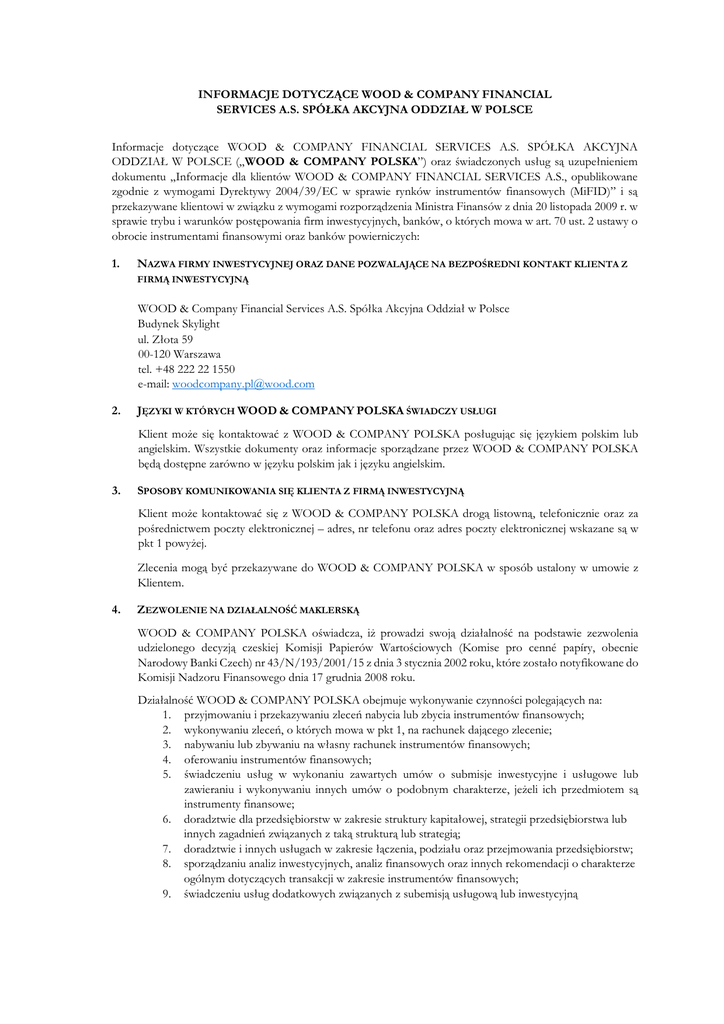 INFORMACJE DOTYCZĄCE WOOD & COMPANY FINANCIAL SERVICES A.S. SPÓŁKA AKCYJNA ODDZIAŁ W POLSCE Informacje dotyczące WOOD & COMPANY FINANCIAL SERVICES A.S. SPÓŁKA AKCYJNA ODDZIAŁ W POLSCE („WOOD & COMPANY POLSKA”) oraz świadczonych usług są uzupełnieniem dokumentu „Informacje dla klientów WOOD & COMPANY FINANCIAL SERVICES A.S., opublikowane zgodnie z wymogami Dyrektywy 2004/39/EC w sprawie rynków instrumentów finansowych (MiFID)” i są przekazywane klientowi w związku z wymogami rozporządzenia Ministra Finansów z dnia 20 listopada 2009 r. w sprawie trybu i warunków postępowania firm inwestycyjnych, banków, o których mowa w art. 70 ust. 2 ustawy o obrocie instrumentami finansowymi oraz banków powierniczych: 1. NAZWA FIRMY INWESTYCYJNEJ ORAZ DANE POZWALAJĄCE NA BEZPOŚREDNI KONTAKT KLIENTA Z FIRMĄ INWESTYCYJNĄ WOOD & Company Financial Services A.S. Spółka Akcyjna Oddział w Polsce Budynek Skylight ul. Złota 59 00-120 Warszawa tel. +48 222 22 1550 e-mail: [email protected] 2. JĘZYKI W KTÓRYCH WOOD & COMPANY POLSKA ŚWIADCZY USŁUGI Klient może się kontaktować z WOOD & COMPANY POLSKA posługując się językiem polskim lub angielskim. Wszystkie dokumenty oraz informacje sporządzane przez WOOD & COMPANY POLSKA będą dostępne zarówno w języku polskim jak i języku angielskim. 3. SPOSOBY KOMUNIKOWANIA SIĘ KLIENTA Z FIRMĄ INWESTYCYJNĄ Klient może kontaktować się z WOOD & COMPANY POLSKA drogą listowną, telefonicznie oraz za pośrednictwem poczty elektronicznej – adres, nr telefonu oraz adres poczty elektronicznej wskazane są w pkt 1 powyżej. Zlecenia mogą być przekazywane do WOOD & COMPANY POLSKA w sposób ustalony w umowie z Klientem. 4. ZEZWOLENIE NA DZIAŁALNOŚĆ MAKLERSKĄ WOOD & COMPANY POLSKA oświadcza, iż prowadzi swoją działalność na podstawie zezwolenia udzielonego decyzją czeskiej Komisji Papierów Wartościowych (Komise pro cenné papíry, obecnie Narodowy Banki Czech) nr 43/N/193/2001/15 z dnia 3 stycznia 2002 roku, które zostało notyfikowane do Komisji Nadzoru Finansowego dnia 17 grudnia 2008 roku. Działalność WOOD & COMPANY POLSKA obejmuje wykonywanie czynności polegających na: 1. przyjmowaniu i przekazywaniu zleceń nabycia lub zbycia instrumentów finansowych; 2. wykonywaniu zleceń, o których mowa w pkt 1, na rachunek dającego zlecenie; 3. nabywaniu lub zbywaniu na własny rachunek instrumentów finansowych; 4. oferowaniu instrumentów finansowych; 5. świadczeniu usług w wykonaniu zawartych umów o submisje inwestycyjne i usługowe lub zawieraniu i wykonywaniu innych umów o podobnym charakterze, jeżeli ich przedmiotem są instrumenty finansowe; 6. doradztwie dla przedsiębiorstw w zakresie struktury kapitałowej, strategii przedsiębiorstwa lub innych zagadnień związanych z taką strukturą lub strategią; 7. doradztwie i innych usługach w zakresie łączenia, podziału oraz przejmowania przedsiębiorstw; 8. sporządzaniu analiz inwestycyjnych, analiz finansowych oraz innych rekomendacji o charakterze ogólnym dotyczących transakcji w zakresie instrumentów finansowych; 9. świadczeniu usług dodatkowych związanych z subemisją usługową lub inwestycyjną 6. WSKAZANIE SZCZEGÓŁOWYCH ZASAD ŚWIADCZENIA USŁUG Szczegółowe zasady świadczenia usług są zawarte w umowie lub regulaminie dotyczącym świadczonej usługi. 7. WSKAZANIE PODSTAWOWYCH ZASAD ZAŁATWIANIA PRZEZ FIRMĘ INWESTYCYJNĄ SKARG KLIENTÓW SKŁADANYCH W ZWIĄZKU ZE ŚWIADCZONĄ USŁUGĄ MAKLERSKĄ Zasady załatwiania przez firmę inwestycyjną skarg klientów są zawarte w Procedurze Składania Reklamacji. 8. WSKAZANIE PODSTAWOWYCH ZASAD POSTĘPOWANIA FIRMY INWESTYCYJNEJ W PRZYPADKU POWSTANIA KONFLIKTU INTERESÓW Zasady postępowania WOOD & COMPANY POLSKA w przypadku powstania konfliktu interesów zostały określone w procedurze „Środki Zapobiegania Konfliktom Interesów”. 9. WSKAZANIE ZAKRESU, CZĘSTOTLIWOŚCI I TERMINÓW RAPORTÓW ZE ŚWIADCZENIA USŁUGI MAKLERSKIEJ, PRZEKAZYWANYCH KLIENTOWI PRZEZ FIRMĘ INWESTYCYJNĄ Zakres, częstotliwość i terminy raportów dotyczących świadczenia danych usług, przekazywanych klientowi przez WOOD & COMPANY POLSKA, zawarte są w umowie dotyczącej świadczenia danej usługi. 10. WSKAZANIE KOSZTÓW I OPŁAT W ZWIĄZKU Z USŁUGĄ MAKLERSKĄ Z tytułu świadczenia danych usług maklerskich, klient będzie ponosił na rzecz WOOD & COMPANY POLSKA wynagrodzenie na zasadach określonych w umowie zawieranej z klientem o świadczenie tych usług. Klient może ponosić koszty związane z prowadzeniem przez podmioty trzecie rachunku papierów wartościowych i rachunku pieniężnego służącego do jego obsługi, a także koszty związane z zawieraniem transakcji za pośrednictwem ww. podmiotu.