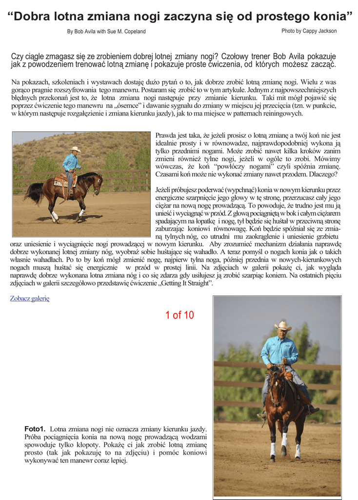 “Dobra lotna zmiana nogi zaczyna się od prostego konia” Photo by Cappy Jackson By Bob Avila with Sue M. Copeland Czy ciągle zmagasz się ze zrobieniem dobrej lotnej zmiany nogi? Czołowy trener Bob Avila pokazuje jak z powodzeniem trenować lotną zmianę i pokazuje proste ćwiczenia, od których możesz zacząć. Na pokazach, szkoleniach i wystawach dostaję dużo pytań o to, jak dobrze zrobić lotną zmianę nogi. Wielu z was gorąco pragnie rozszyfrowania tego manewru. Postaram się zrobić to w tym artykule. Jednym z najpowszechniejszych błędnych przekonań jest to, że lotna zmiana nogi następuje przy zmianie kierunku. Taki mit mógł pojawić się poprzez ćwiczenie tego manewru na „ósemce” i dawanie sygnału do zmiany w miejscu jej przecięcia (tzn. w punkcie, w którym następuje rozgałęzienie i zmiana kierunku jazdy), jak to ma miejsce w patternach reiningowych. Prawda jest taka, że jeżeli prosisz o lotną zmianę a twój koń nie jest idealnie prosty i w równowadze, najprawdopodobniej wykona ją tylko przednimi nogami. Może zrobić nawet kilka kroków zanim zmieni również tylne nogi, jeżeli w ogóle to zrobi. Mówimy wówczas, że koń “powłóczy nogami” czyli spóźnia zmianę. Czasami koń może nie wykonać zmiany nawet przodem. Dlaczego? Jeżeli próbujesz poderwać (wypchnąć) konia w nowym kierunku przez energiczne szarpnięcie jego głowy w tę stronę, przerzucasz cały jego ciężar na nową nogę prowadzącą. To powoduje, że trudno jest mu ją unieść i wyciągnąć w przód. Z głową pociągniętą w bok i całym ciężarem spadającym na łopatkę i nogę, tył będzie się huśtał w przeciwną stronę zaburzając koniowi równowagę. Koń będzie spóźniał się ze zmianą tylnych nóg, co utrudni mu zaokrąglenie i uniesienie grzbietu oraz uniesienie i wyciągnięcie nogi prowadzącej w nowym kierunku. Aby zrozumieć mechanizm działania naprawdę dobrze wykonanej lotnej zmiany nóg, wyobraź sobie huśtające się wahadło. A teraz pomyśl o nogach konia jak o takich własnie wahadłach. Po to by koń mógł zmienić nogę, najpierw tylna noga, później przednia w nowych-kierunkowych nogach muszą huśtać się energicznie w przód w prostej linii. Na zdjęciach w galerii pokażę ci, jak wygląda naprawdę dobrze wykonana lotna zmiana nóg i co się zdarza gdy usiłujesz ją zrobić szarpiąc koniem. Na ostatnich pięciu zdjęciach w galerii szczegółowo przedstawię ćwiczenie „Getting It Straight”. Zobacz galerię 1 of 10 Foto1. Lotna zmiana nogi nie oznacza zmiany kierunku jazdy. Próba pociągnięcia konia na nową nogę prowadzącą wodzami spowoduje tylko kłopoty. Pokażę ci jak zrobić lotną zmianę prosto (tak jak pokazuję to na zdjęciu) i pomóc koniowi wykonywać ten manewr coraz lepiej. 2of 10 Foto 2. Porównaj to zdjęcie z poprzednim. Na tym zdjęciu pokazuję czego szczególnie nie należy robić. Po pierwsze używając wodzy szarpiesz konia na nową nogę prowadzącą i skręcasz swoje ciało w tym kierunku dla wzmocnienia sygnału. Po drugie: energicznym szarpnięciem przodem całkowicie zaburzasz mu równowagę. Jeżeli koń nie może pozostać prostym i w równowadze (jak na następnym zdjęciu), to najprawdopodobniej zrobi lotną zmianę nóg tylko przodem. Dodatkowo koń opuści łopatkę, ponieważ jest zmuszony do wychylenia się w stronę nowej nogi prowadzącej by złapać pod tobą równowagę. Popatrz na to zdjęcie, jak mój koń jest przechylony na prawo. On nie ma żadnego wyboru! Dosłownie rzuciłem go na nową prowadzącą nogę. Kiedy powodujesz, że koń musi się pochylić, wówczas zaprzepaszczasz swoje szanse na zrobienie dobrej ( i dodatkowo punktowanej na zawodach) lotnej zmiany. W dodatku zachęcasz konia do zapadania , „nurkowania” przodem na stronę , na którą będziemy chcieli zrobić lotną zmianę nóg 3 of 10 NAPRAWDĘ DOBRZE WYKONANA LOTNA ZMIANA NOGI Foto 3. A. Mój koń jest prosty od karku do ogona. Jest w końcowej fazie kroku w galopie na lewą nogę. Obydwie tylne nogi oderwały się od ziemi. Zwróć uwagę na tylną prawą nogę, która zainicjuje lotną zmianę. Dobrze wykonywana lotna zmiana zaczyna się od tylnych nóg... co sygnalizuje, że koń jest prosty i w równowadze i…eliminuje ryzyko spóźniania (”powłoczenia”).