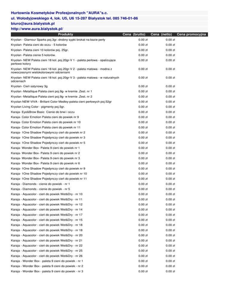 Hurtownia Kosmetyków Profesjonalnych "AURA"s.c. ul. Wołodyjowskiego 4, lok. U5, U6 15-287 Białystok tel. 085 746-01-86 [email protected] http://www.aura.bialystok.pl/ Produkty Cena (brutto) Cena (netto) Kryolan - Glamour Sparks poj.3gr.-drobny sypki brokat na bazie perły 0.00 zł 0.00 zł Kryolan- Paleta cieni do oczu - 5 kolorów 0.00 zł 0.00 zł Kryolan- Paleta cieni 10 kolorów poj. 25gr. 0.00 zł 0.00 zł Kryolan -Paleta cienie 5 kolorów. 0.00 zł 0.00 zł Kryolan- NEW Paleta cieni 18 kol. poj.20gr-V 1 - paleta perłowa - opalizujące perłowe kolory 0.00 zł 0.00 zł Kryolan- NEW Paleta cieni 18 kol. poj.20gr-V 2 - paleta matowa - modna z nowoczesnymi wielokolorowymi odcieniami 0.00 zł 0.00 zł Kryolan- NEW Paleta cieni 18 kol. poj.20gr-V 3 - paleta matowa - w naturalnych odcieniach 0.00 zł 0.00 zł Kryolan- Cień satynowy 3g 0.00 zł 0.00 zł Kryolan -Metallique Paleta cieni poj.9g- w kremie .Zest. nr 1 0.00 zł 0.00 zł Kryolan -Metallique Paleta cieni poj.9g- w kremie .Zest. nr 2 0.00 zł 0.00 zł Kryolan NEW VIVA - Brillant Color Medley-paleta cieni perłowych poj.52gr 0.00 zł 0.00 zł Kryolan Living Color - pigmenty poj.5gr. 0.00 zł 0.00 zł Karaja- Eye&Brow Basic Cienie do brwi i oczu 0.00 zł 0.00 zł Karaja- Color Emotion Paleta cieni do powiek nr 9 0.00 zł 0.00 zł Karaja- Color Emotion Paleta cieni do powiek nr 10 0.00 zł 0.00 zł Karaja- Color Emotion Paleta cieni do powiek nr 11 0.00 zł 0.00 zł Karaja- 1One Shadow Pojedynczy cień do powiek nr 2 0.00 zł 0.00 zł Karaja- 1One Shadow Pojedynczy cień do powiek nr 3 0.00 zł 0.00 zł Karaja- 1One Shadow Pojedynczy cień do powiek nr 5 0.00 zł 0.00 zł Karaja- Wonder Box- Paleta 9 cieni do powiek nr 1 0.00 zł 0.00 zł Karaja- Wonder Box- Paleta 9 cieni do powiek nr 2 0.00 zł 0.00 zł Karaja- Wonder Box- Paleta 9 cieni do powiek nr 3 0.00 zł 0.00 zł Karaja- Wonder Box- Paleta 9 cieni do powiek nr 6 0.00 zł 0.00 zł Karaja- 1One Shadow Pojedynczy cień do powiek nr 9 0.00 zł 0.00 zł Karaja- 1One Shadow Pojedynczy cień do powiek nr 10 0.00 zł 0.00 zł Karaja- 1One Shadow Pojedynczy cień do powiek nr 11 0.00 zł 0.00 zł Karaja - Diamonds - cienie do powiek - nr 1 0.00 zł 0.00 zł Karaja - Diamonds - cienie do powiek - nr 5 0.00 zł 0.00 zł Karaja - Aquacolor - cień do powiek Wet&Dry - nr 10 0.00 zł 0.00 zł Karaja - Aquacolor - cień do powiek Wet&Dry - nr 11 0.00 zł 0.00 zł Karaja - Aquacolor - cień do powiek Wet&Dry - nr 12 0.00 zł 0.00 zł Karaja - Aquacolor - cień do powiek Wet&Dry - nr 14 0.00 zł 0.00 zł Karaja - Aquacolor - cień do powiek Wet&Dry - nr 17 0.00 zł 0.00 zł Karaja - Aquacolor - cień do powiek Wet&Dry - nr 15 0.00 zł 0.00 zł Karaja - Aquacolor - cień do powiek Wet&Dry - nr 18 0.00 zł 0.00 zł Karaja - Aquacolor - cień do powiek Wet&Dry - nr 18 0.00 zł 0.00 zł Karaja - Aquacolor - cień do powiek Wet&Dry - nr 20 0.00 zł 0.00 zł Karaja - Aquacolor - cień do powiek Wet&Dry - nr 21 0.00 zł 0.00 zł Karaja - Aquacolor - cień do powiek Wet&Dry - nr 22 0.00 zł 0.00 zł Karaja - Aquacolor - cień do powiek Wet&Dry - nr 25 0.00 zł 0.00 zł Karaja - Aquacolor - cień do powiek Wet&Dry - nr 26 0.00 zł 0.00 zł Karaja - Wonder Box - paleta 9 cieni do powiek - nr 1 0.00 zł 0.00 zł Karaja - Wonder Box - paleta 9 cieni do powiek - nr 2 0.00 zł 0.00 zł Karaja - Wonder Box - paleta 9 cieni do powiek - nr 3 0.00 zł 0.00 zł Cena promocyjna Karaja - Wonder Box - paleta 9 cieni do powiek - nr 4 0.00 zł 0.00 zł Karaja - Wonder Box - paleta 9 cieni do powiek - nr 5 0.00 zł 0.00 zł Karaja - Wonder Box - paleta 9 cieni do powiek - nr 6 0.00 zł 0.00 zł Melkior - Paleta do brwi - 3 kolory 0.00 zł 0.00 zł Melkior - Cień do powiek w opakowaniu - WHISPER WHITE 0.00 zł 0.00 zł Melkior - Cień do powiek w opakowaniu - WHITE GOLD 0.00 zł 0.00 zł Melkior - Cień do powiek w opakowaniu - PURPLE HAZE 0.00 zł 0.00 zł Melkior - Cień do powiek w opakowaniu - METALIC GREEN 0.00 zł 0.00 zł Melkior - Cień do powiek w opakowaniu - BEIGE COPPER 0.00 zł 0.00 zł Melkior - Cień do powiek w opakowaniu - BLUE LAGOON 0.00 zł 0.00 zł Melkior - Cień do powiek w opakowaniu - VIOLETTE 0.00 zł 0.00 zł Melkior - Cień do powiek w opakowaniu - CAMEE ROSE 0.00 zł 0.00 zł Melkior - Cień do powiek w opakowaniu - LIGHT BEIGE 0.00 zł 0.00 zł Melkior - Cień do powiek w opakowaniu - BROWNIE 0.00 zł 0.00 zł Melkior - Cień do powiek w opakowaniu - GOLD RUSH 0.00 zł 0.00 zł Melkior - Cień do powiek w opakowaniu - GREEN COCKTAIL 0.00 zł 0.00 zł Melkior - Cień do powiek w opakowaniu - ELECTRIC BLUE 0.00 zł 0.00 zł Melkior - Cień do powiek w opakowaniu - BLUE NIGHTS 0.00 zł 0.00 zł Melkior - Cień do powiek w opakowaniu - BROWN SUGAR 0.00 zł 0.00 zł Melkior - Cień do powiek w opakowaniu - BLACK VELVET 0.00 zł 0.00 zł Melkior - Cień do powiek w opakowaniu - SOFT PEACH 0.00 zł 0.00 zł Melkior - Cień do powiek w opakowaniu - DESERT SAND 0.00 zł 0.00 zł Melkior - Cień do powiek w opakowaniu - SWEET PINK 0.00 zł 0.00 zł Melkior - Cień do powiek w opakowaniu - NATURAL SKIN 0.00 zł 0.00 zł Melkior - Cień do powiek w opakowaniu - RED LEAF 0.00 zł 0.00 zł Melkior - Cień do powiek w opakowaniu - DEEP PURPLE 0.00 zł 0.00 zł Melkior - Cień do powiek w opakowaniu - DELICATE ROSE 0.00 zł 0.00 zł Melkior - Cień do powiek w opakowaniu - PEACH 0.00 zł 0.00 zł Melkior - Cień do powiek w opakowaniu - AUTUMN SUNSET 0.00 zł 0.00 zł Melkior - Cień do powiek w opakowaniu - CITY SMOG 0.00 zł 0.00 zł Melkior - Cień do powiek w opakowaniu - MAROON 0.00 zł 0.00 zł Melkior - Cień do powiek w opakowaniu - ORANGE 0.00 zł 0.00 zł Melkior - Cień do powiek w opakowaniu - ANTHRACITE 0.00 zł 0.00 zł Melkior - Cień do powiek w opakowaniu - PURPLE HAZE 0.00 zł 0.00 zł Melkior - Cień do powiek w opakowaniu - PRUNE 0.00 zł 0.00 zł Melkior - Cień do powiek w opakowaniu - OLD BRICK 0.00 zł 0.00 zł Melkior - Cień do powiek w opakowaniu - SILVER 0.00 zł 0.00 z