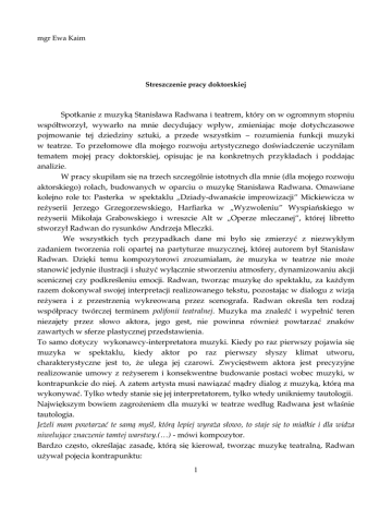 mgr Ewa Kaim Streszczenie pracy doktorskiej Spotkanie z muzyką Stanisława Radwana i teatrem, który on w ogromnym stopniu współtworzył, wywarło na mnie decydujący wpływ, zmieniając moje dotychczasowe pojmowanie tej dziedziny sztuki, a przede wszystkim – rozumienia funkcji muzyki w teatrze. To przełomowe dla mojego rozwoju artystycznego doświadczenie uczyniłam tematem mojej pracy doktorskiej, opisując je na konkretnych przykładach i poddając analizie. W pracy skupiłam się na trzech szczególnie istotnych dla mnie (dla mojego rozwoju aktorskiego) rolach, budowanych w oparciu o muzykę Stanisława Radwana. Omawiane kolejno role to: Pasterka w spektaklu „Dziady-dwanaście improwizacji” Mickiewicza w reżyserii Jerzego Grzegorzewskiego, Harfiarka w „Wyzwoleniu” Wyspiańskiego w reżyserii Mikołaja Grabowskiego i wreszcie Alt w „Operze mleczanej”, której libretto stworzył Radwan do rysunków Andrzeja Mleczki. We wszystkich tych przypadkach dane mi było się zmierzyć z niezwykłym zadaniem tworzenia roli opartej na partyturze muzycznej, której autorem był Stanisław Radwan. Dzięki temu kompozytorowi zrozumiałam, że muzyka w teatrze nie może stanowić jedynie ilustracji i służyć wyłącznie stworzeniu atmosfery, dynamizowaniu akcji scenicznej czy podkreśleniu emocji. Radwan, tworząc muzykę do spektaklu, za każdym razem dokonywał swojej interpretacji realizowanego tekstu, pozostając w dialogu z wizją reżysera i z przestrzenią wykreowaną przez scenografa. Radwan określa ten rodzaj współpracy twórczej terminem polifonii teatralnej. Muzyka ma znaleźć i wypełnić teren niezajęty przez słowo aktora, jego gest, nie powinna również powtarzać znaków zawartych w sferze plastycznej przedstawienia. To samo dotyczy wykonawcy-interpretatora muzyki. Kiedy po raz pierwszy pojawia się muzyka w spektaklu, kiedy aktor po raz pierwszy słyszy klimat utworu, charakterystyczne jest to, że ulega jej czarowi. Zwycięstwem aktora jest precyzyjne realizowanie umowy z reżyserem i konsekwentne budowanie postaci wobec muzyki, w kontrapunkcie do niej. A zatem artysta musi nawiązać mądry dialog z muzyką, którą ma wykonywać. Tylko wtedy stanie się jej interpretatorem, tylko wtedy unikniemy tautologii. Największym bowiem zagrożeniem dla muzyki w teatrze według Radwana jest właśnie tautologia. Jeżeli mam powtarzać te samą myśl, którą lepiej wyraża słowo, to staje się to miałkie i dla widza niwelujące znaczenie tamtej warstwy.(…) - mówi kompozytor. Bardzo często, określając zasadę, którą się kierował, tworząc muzykę teatralną, Radwan używał pojęcia kontrapunktu: 1 Otóż cała sfera ilustracyjności była dla mnie zawsze najmniej interesująca jako sposób istnienia muzyki na scenie, ponieważ wydaje mi się, że muzyka to jest coś ważniejszego niż to, co niesie ze sobą tylko dźwięk, tylko udźwiękowienie przestrzeni, a nie umuzycznienie jakiegoś stanu. Zawsze tego drugiego szukałem, rozumiejąc umuzycznienie jako partnerstwo dla wszystkich pozostałych elementów spektaklu. W związku z tym konieczna jest redukcja elementów muzycznych w samym umuzycznieniu. Stąd też częste zastosowanie kontrapunktu. Sam dla siebie muzyczny kontrapunkt pozbawiony jest właściwie logiki muzycznej, dlatego, że uznaje inną logikę – przewodu. Tego, co WSZYSCY RAZEM chcemy powiedzieć, co WSZYSCY RAZEM, począwszy od aktora, przez reżysera, scenografa i kompozytora chcemy wspólnie przekazać. I w tym sensie umuzycznienie to kontrapunkt (punkt – kontra – punkt), który powiększa sferę dialogu. Muzyka, jako twór kontrapunktyczny, uzupełnia i wydobywa wszystko to, co zawiera się najgłębiej w warstwie nienazwanego. W muzykowaniu podstawową umiejętnością jest otworzenie uszu na to, co robi partner. Ten słuch na partnera doskonale realizował się we współpracy Stanisława Radwana z Konradem Swinarskim, Andrzejem Wajdą, Jerzym Jarockim czy Jerzym Grzegorzewskim. Potrafił idealnie trafić w ton, którym chcieli się posługiwać, i w tak różny rodzaj teatru, którym się zajmowali. Właśnie dlatego, że bardzo dobrze wiedział i wyczuwał czego chce jego partner – reżyser. Ta umiejętność słuchania drugiego człowieka i wielkiego do niego szacunku zdaje mi się jedną z najważniejszych cech Radwana, która determinuje całą jego twórczość kompozytora teatralnego. * Są spotkania, które ustawiają nowy kierunek poszukiwań artystycznych, otwierają przed nami nowe, nieznane przestrzenie. Takim spotkaniem było dla niewątpliwie sceniczny, aktorski kontakt z twórczością Stanisława Radwana. Szczególne miejsce w mojej pracy poświęciłam analizie roli w zasadzie najmniejszej, spośród wyżej wymienionych na wstępie – a mianowicie Pasterce z „Dziadów – dwunastu improwizacji” w reżyserii Jerzego Grzegorzewskiego. To doświadczenie formatujące mnie, dzięki niemu zweryfikowałam cały dotychczasowy sposób patrzenia na sztukę w ogóle. Radykalnie zmieniły się moje poszukiwania i pojmowanie teatru. Poznawanie języka teatralnego, którym posługiwali się Grzegorzewski i Radwan, rozczytywanie ich znaków i symboli, śledzenie etapów pracy nad formą spektaklu, było dla mnie swoistym wstępowaniem w kolejne kręgi wtajemniczenia. Wcześniej, w szkole teatralnej, zetknęłam się z wielkimi osobowościami krakowskich scen. Wiersza uczyli mnie Izabela Olszewska i Jacek Romanowski, scen klasycznych Jerzy Trela, prozy Jerzy Grałek, piosenki – Mieczysław Grąbka. Sceny współczesne prowadził z nami jedyny reżyser w tym gronie, Bogdan Hussakowski. Ci wspaniali pedagodzy uczyli mnie nie tylko warsztatu aktorskiego, ale przede wszystkim – 2 myślenia na scenie i, co najważniejsze rozumienia teatru jako istotną rozmowę o nas, o otaczającym nas świecie. Podstawę nauczania stanowiło posługiwanie się słowem, psychologią postaci, konstruowanie roli w tradycji teatru reali