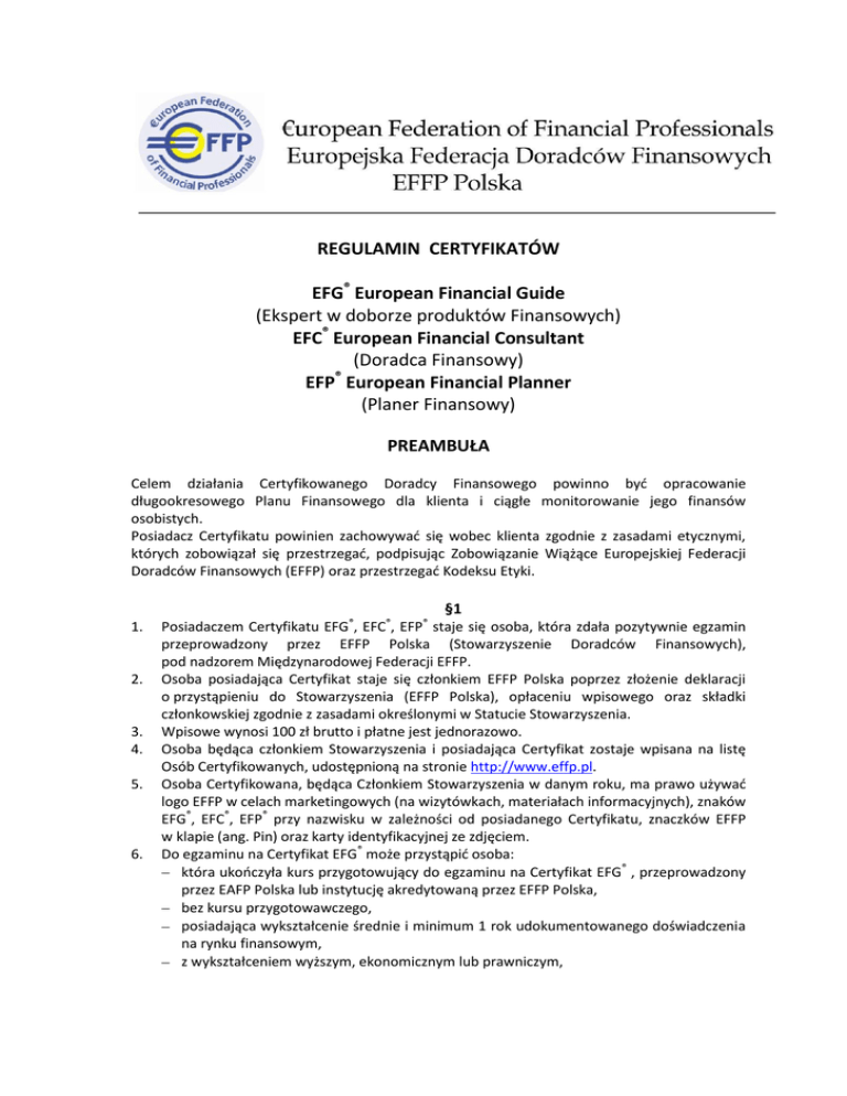 REGULAMIN CERTYFIKATÓW EFG® European Financial Guide (Ekspert w doborze produktów Finansowych) EFC® European Financial Consultant (Doradca Finansowy) ® EFP European Financial Planner (Planer Finansowy) PREAMBUŁA Celem działania Certyfikowanego Doradcy Finansowego powinno być opracowanie długookresowego Planu Finansowego dla klienta i ciągłe monitorowanie jego finansów osobistych. Posiadacz Certyfikatu powinien zachowywać się wobec klienta zgodnie z zasadami etycznymi, których zobowiązał się przestrzegać, podpisując Zobowiązanie Wiążące Europejskiej Federacji Doradców Finansowych (EFFP) oraz przestrzegać Kodeksu Etyki. §1 1. 2. 3. 4. 5. 6. ® ® ® Posiadaczem Certyfikatu EFG , EFC , EFP staje się osoba, która zdała pozytywnie egzamin przeprowadzony przez EFFP Polska (Stowarzyszenie Doradców Finansowych), pod nadzorem Międzynarodowej Federacji EFFP. Osoba posiadająca Certyfikat staje się członkiem EFFP Polska poprzez złożenie deklaracji o przystąpieniu do Stowarzyszenia (EFFP Polska), opłaceniu wpisowego oraz składki członkowskiej zgodnie z zasadami określonymi w Statucie Stowarzyszenia. Wpisowe wynosi 100 zł brutto i płatne jest jednorazowo. Osoba będąca członkiem Stowarzyszenia i posiadająca Certyfikat zostaje wpisana na listę Osób Certyfikowanych, udostępnioną na stronie http://www.effp.pl. Osoba Certyfikowana, będąca Członkiem Stowarzyszenia w danym roku, ma prawo używać logo EFFP w celach marketingowych (na wizytówkach, materiałach informacyjnych), znaków EFG®, EFC®, EFP® przy nazwisku w zależności od posiadanego Certyfikatu, znaczków EFFP w klapie (ang. Pin) oraz karty identyfikacyjnej ze zdjęciem. Do egzaminu na Certyfikat EFG® może przystąpić osoba: która ukończyła kurs przygotowujący do egzaminu na Certyfikat EFG® , przeprowadzony przez EAFP Polska lub instytucję akredytowaną przez EFFP Polska, bez kursu przygotowawczego, posiadająca wykształcenie średnie i minimum 1 rok udokumentowanego doświadczenia na rynku finansowym, z wykształceniem wyższym, ekonomicznym lub prawniczym, 7. 8. 9. 10. 11. 12. 13. 14. 15. 16. 17. 18. 19. 20. 21. z wykształceniem wyższym, innym niż ekonomiczne i prawnicze, i minimum rocznym udokumentowanym doświadczeniem na rynku finansowym. Do egzaminu na Certyfikat EFC® może przystąpić osoba: która zdała egzamin na Certyfikat EFG®, która ukończyła studium podyplomowe lub kurs przygotowujący do egzaminu na Certyfikat EFC® , przeprowadzony przez EAFP Polska lub instytucję akredytowaną przez EFFP Polska, przedłożyła pracę dyplomową w postaci Planu Finansowego gospodarstwa domowego, posiadająca wykształcenie średnie i minimum 1 rok udokumentowanego doświadczenia na rynku finansowym, z wykształceniem wyższym, ekonomicznym lub prawniczym. z wykształceniem wyższym, innym niż ekonomiczne i prawnicze, i minimum rocznym udokumentowanym doświadczeniem na rynku finansowym. Certyfikat traci swoją ważność po dwóch latach od wydania na dzień 31 grudnia roku. Aby przedłużyć ważność Certyfikatu posiadacz powinien uzupełniać wiedzę we własnym zakresie, poprzez udział w szkoleniach akredytowanych przez EFFP lub poprzez udział w specjalnych szkoleniach, kursach, konferencjach i seminariach organizowanych przez EFFP w zakresie planowania finansowego. Ważność Certyfikatu na kolejne 2 lata przedłuża odbycie co najmniej 50 godzin szkoleń i kursów, w zakresie obejmującym planowanie finansowe, według podziału tematycznego określonego w załączniku. EFFP Polska kieruje na nieodpłatne lub dofinansowane szkolenia, spełniające wymogi utrzymania ważności Certyfikatu, jedynie członków Stowarzyszenia EFFP Polska. Uczestnictwo w szkoleniach powinno być udokumentowane oświadczeniami na formularzach EFFP Polska lub innych formularzach wystawionych przez instytucje szkolące, zawierające informacje takie jak w formularzu EFFP, i przedłożone w EFFP Polska. Posiadacz Certyfikatu powinien być lojalny wobec pracodawcy, przestrzegać umów zawartych z pracodawcą oraz stosować się do przepisów dot. ochrony danych osobowych. Klient lub pracodawca może złożyć skargę na posiadacza Certyfikatu do EFFP Polska. W razie naruszenia zasad określonych w Zobowiązaniu Wiążącym EFFP lub rozpatrzenie skargi na posiadacza Certyfikatu na korzyść klienta lub pracodawcy, posiadacz Certyfikatu może zostać pozbawiony Certyfikatu, a tym samym uprawnień zawartych w punktach 2 i 4. Utrata Certyfikatu i skreślenie z listy Osób Certyfikowanych następuje gdy: brak jest udokumentowania odbycia wymaganych szkoleń, Sąd Koleżeński po rozpatrzeniu skargi na Certyfikowanego Doradcę Finansowego podjął decyzję o cofnięciu uprawnień do posługiwania się Certyfikatem i o zawieszeniu lub wykluczeniu ze Stowarzyszenia, Przedłużenie Certyfikatu i ponowne wpisanie na listę Osób Certyfikowanych następuje gdy: osoba zainteresowana ponownie zda egzamin na Certyfikat; dotyczy to przypadku skreślenia z listy w wyniku nie przedłożenia w terminie dokumentów potwierdzających odbycie szkoleń, wymaganych do przedłużenia ważności Certyfikatu, osoba, po okresie 2 lat karencji, ponownie zda egzamin na Certyfikat i przedstawi rekomendacje 2 członków Stowarzyszenia (dot. osób, w stosunku do których decyzję o zawieszeniu lub wykreśleniu z listy podjął Sąd Koleżeński). Rozpatrywanie skarg na Certyfikowanego Doradcę Finansowego prowadzi Sąd Koleżeński przy EFFP Polska zgodnie z Regulaminem Sądu Koleżeńskiego. Lista Osób Certyfikowanych w Polsce znajduje się na stronie http://www.effp.pl W przypadku utraty Certyfikatu Doradca Finansowy zostaje usunięty z listy Osób Certyfikowanych na stronie http://www.effp.pl Doradca Finansowy z Certyfikatem jest zobowiązany do informowania o zmianie pracodawcy i danych adresowych (adres, telefon, e-mail). §2 ZASADY EGZAMINU 1. 2. 3. 4. 5. 6. 7. 8. 9. 10. 11. 12. 13. 14. 15. Egzamin na Certyfikaty