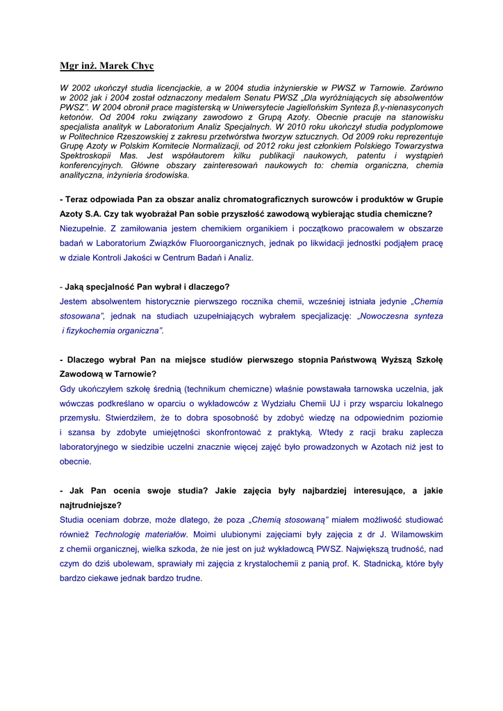 Mgr inż. Marek Chyc W 2002 ukończył studia licencjackie, a w 2004 studia inżynierskie w PWSZ w Tarnowie. Zarówno w 2002 jak i 2004 został odznaczony medalem Senatu PWSZ „Dla wyróżniających się absolwentów PWSZ”. W 2004 obronił prace magisterską w Uniwersytecie Jagiellońskim Synteza β,γ-nienasyconych ketonów. Od 2004 roku związany zawodowo z Grupą Azoty. Obecnie pracuje na stanowisku specjalista analityk w Laboratorium Analiz Specjalnych. W 2010 roku ukończył studia podyplomowe w Politechnice Rzeszowskiej z zakresu przetwórstwa tworzyw sztucznych. Od 2009 roku reprezentuje Grupę Azoty w Polskim Komitecie Normalizacji, od 2012 roku jest członkiem Polskiego Towarzystwa Spektroskopii Mas. Jest współautorem kilku publikacji naukowych, patentu i wystąpień konferencyjnych. Główne obszary zainteresowań naukowych to: chemia organiczna, chemia analityczna, inżynieria środowiska. - Teraz odpowiada Pan za obszar analiz chromatograficznych surowców i produktów w Grupie Azoty S.A. Czy tak wyobrażał Pan sobie przyszłość zawodową wybierając studia chemiczne? Niezupełnie. Z zamiłowania jestem chemikiem organikiem i początkowo pracowałem w obszarze badań w Laboratorium Związków Fluoroorganicznych, jednak po likwidacji jednostki podjąłem pracę w dziale Kontroli Jakości w Centrum Badań i Analiz. - Jaką specjalność Pan wybrał i dlaczego? Jestem absolwentem historycznie pierwszego rocznika chemii, wcześniej istniała jedynie „Chemia stosowana”, jednak na studiach uzupełniających wybrałem specjalizację: „Nowoczesna synteza i fizykochemia organiczna”. - Dlaczego wybrał Pan na miejsce studiów pierwszego stopnia Państwową Wyższą Szkołę Zawodową w Tarnowie? Gdy ukończyłem szkołę średnią (technikum chemiczne) właśnie powstawała tarnowska uczelnia, jak wówczas podkreślano w oparciu o wykładowców z Wydziału Chemii UJ i przy wsparciu lokalnego przemysłu. Stwierdziłem, że to dobra sposobność by zdobyć wiedzę na odpowiednim poziomie i szansa by zdobyte umiejętności skonfrontować z praktyką. Wtedy z racji braku zaplecza laboratoryjnego w siedzibie uczelni znacznie więcej zajęć było prowadzonych w Azotach niż jest to obecnie. - Jak Pan ocenia swoje studia? Jakie zajęcia były najbardziej interesujące, a jakie najtrudniejsze? Studia oceniam dobrze, może dlatego, że poza „Chemią stosowaną” miałem możliwość studiować również Technologię materiałów. Moimi ulubionymi zajęciami były zajęcia z dr J. Wilamowskim z chemii organicznej, wielka szkoda, że nie jest on już wykładowcą PWSZ. Największą trudność, nad czym do dziś ubolewam, sprawiały mi zajęcia z krystalochemii z panią prof. K. Stadnicką, które były bardzo ciekawe jednak bardzo trudne. - Jakie były Pan losy po studiach w PWSZ w Tarnowie, jak trafił Pan do Grupy Azoty S.A. ? Po ukończeniu studiów w Tarnowie podjąłem studia w Wydziale Chemii UJ. Po ukończeniu studiów, po dwóch miesiącach bycia bezrobotnym zostałem zatrudniony w Zakładach Azotowych S.A (Obecnie Grupa Azoty S.A.), gdzie nadal pracuję. - Na czym konkretnie polega Pana praca? Odpowiadam za pracę pracowni chromatograficznej w Laboratorium Analiz Specjalnych. W ramach pracy wykonuję rutynowe i nietypowe analizy, głównie próbek gazowych, pracuję nad identyfikacja zanieczyszczeń w wybranych strumieniach technologicznych. Ponadto reprezentuję Grupę Azoty w Polskim Komitecie Normalizacyjnym w zakresie gazownictwa oraz gazów sprężonych. - Jaki jest Pana ostatni lub największy zawodowy sukces? Trudno powiedzieć. Staram się wykonywać swoją pracę najlepiej jak potrafię, jednak ostatnim takim sukcesem była dla mnie modernizacja pracowni w której pracuję. Ale takim wymiernym sukcesem było opatentowanie wynalazku dotyczącego otrzymywania metanolanu sodu we współpracy z dr T. Bieszczadem, którego w Tarnowie i w Krakowie byłem studentem. - Co by Pan powiedział osobom, które zastanawiają się nad studiowaniem chemii w Państwowej Wyższej Szkole Zawodowej w Tarnowie? Powiedziałbym, że decydują się zawód wymagający, który daje możliwość realizacji wielu zainteresowań i że tarnowska uczelnia jest alternatywą dla krakowskich ośrodków akademickich w których później mogą kontynuować naukę. Jako opiekun praktykantów miałem do czynienia ze studentami z wielu renomowanych uczelni i myślę, że z tej perspektywy studenci PWSZ wypadają całkiem przyzwoicie. 18 września 2014r.