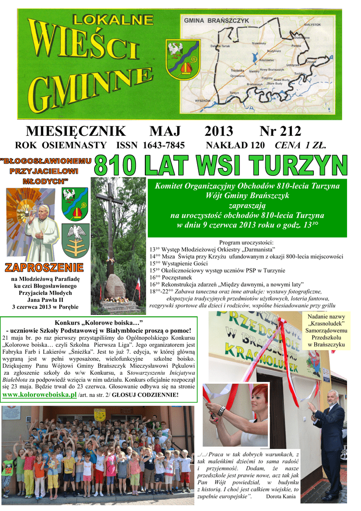 MIESIĘCZNIK MAJ ROK OSIEMNASTY ISSN 1643-7845 2013 Nr 212 NAKŁAD 120 CENA 1 ZŁ. Komitet Organizacyjny Obchodów 810-lecia Turzyna Wójt Gminy Brańszczyk zapraszają na uroczystość obchodów 810-lecia Turzyna w dniu 9 czerwca 2013 roku o godz. 13³° na Młodzieżową Parafiadę ku czci Błogosławionego Przyjaciela Młodych Jana Pawła II 3 czerwca 2013 w Porębie Program uroczystości: 13³° Występ Młodzieżowej Orkiestry „Darmanista” 14°° Msza Święta przy Krzyżu ufundowanym z okazji 800-lecia miejscowości 15°° Wystąpienie Gości 15³° Okolicznościowy występ uczniów PSP w Turzynie 16°° Poczęstunek 16³° Rekonstrukcja zdarzeń „Między dawnymi, a nowymi laty” 18°°-22°° Zabawa taneczna oraz inne atrakcje: wystawy fotograficzne, ekspozycja tradycyjnych przedmiotów użytkowych, loteria fantowa, rozgrywki sportowe dla dzieci i rodziców, wspólne biesiadowanie przy grillu Nadanie nazwy „Krasnoludek” Samorządowemu Przedszkolu w Brańszczyku Konkurs „Kolorowe boiska…” - uczniowie Szkoły Podstawowej w Białymbłocie proszą o pomoc! 21 maja br. po raz pierwszy przystąpiliśmy do Ogólnopolskiego Konkursu „Kolorowe boiska… czyli Szkolna Pierwsza Liga”. Jego organizatorem jest Fabryka Farb i Lakierów „Śnieżka”. Jest to już 7. edycja, w której główną wygraną jest w pełni wyposażone, wielofunkcyjne szkolne boisko. Dziękujemy Panu Wójtowi Gminy Brańszczyk Mieczysławowi Pękulowi za zgłoszenie szkoły do w/w Konkursu, a Stowarzyszeniu Inicjatywa Białebłota za podpowiedź wzięcia w nim udziału. Konkurs oficjalnie rozpoczął się 23 maja. Będzie trwał do 23 czerwca. Głosowanie odbywa się na stronie www.koloroweboiska.pl /art. na str. 2/ GŁOSUJ CODZIENNIE! „/…/ Praca w tak dobrych warunkach, z tak maleńkimi dziećmi to sama radość i przyjemność. Dodam, że nasze przedszkole jest prawie nowe, acz tak jak Pan Wójt powiedział, w budynku z historią. I choć jest całkiem wiejskie, to zupełnie europejskie”. Dorota Kania Konkurs „Kolorowe boiska…” 21 maja br. po raz pierwszy przystąpiliśmy do Ogólnopolskiego Konkursu „Kolorowe boiska… czyli Szkolna Pierwsza Liga”. Jego organizatorem jest Fabryka Farb i Lakierów „Śnieżka”. Jest to już 7 edycja, w której główną wygraną jest w pełni wyposażone, wielofunkcyjne szkolne boisko. Pokazaliśmy kontrast między starymi a nowymi czasy. Dawniej dzieci wykorzystywały każde dobre miejsce do gry, zabawy. Mogła to być po prostu łąka. Nie przeszkadzało im sąsiedztwo pasących się zwierząt domowych czy, np. suszącego się siana. Ważne było to, by wspólnie spędzić czas, często po ciężkiej pracy w gospodarstwie. Z tamtą epoką symbolicznie łączą nas schodki wiodące do drugiej części naszej propozycji – boiska naszych marzeń. Takie miejsce do wszechstronnego rozwoju fizycznego zapewne sprawiłoby, że nasza kolekcja sportowych trofeów powiększyłaby się! Przyczyniłyby się do tego: boisko do gry w piłkę nożną, bieżnia, skocznia do skoku w dal, miniboisko do koszykówki oraz pływalnia „Podwodna Fantazja”. Zaprojektowaliśmy również trybuny dla kibiców, w kulturalny sposób wyrażających swoje sympatie dla drużyn i zawodników. Sportowe zmagania oglądaliby również nasi rodzice, a także dziadkowie, którzy wzrastali w zupełnie innych warunkach. Taki wielofunkcyjny obiekt mógłby być także miejscem aktywności całych naszych rodzin, całego lokalnego środowiska. Projekt uwzględnia „zielone” miejsce do relaksu, odpoczynku. Kompleks sportowy jest bezpieczny dla wszystkich, którzy by tu przybyli. W pracy wykorzystaliśmy różnorodne materiały, w tym surowce wtórne, gdyż troszczymy się o nasze środowisko naturalne. Pracę wykonali zespołowo uczniowie klas III – VI oraz kl. I. Nad bezpiecznym przebiegiem poszczególnych etapów tworzenia czuwali nauczyciele: Anna Gałązka, Barbara Łapińska, Alina Obudzińska i Daniel Kuczyński. Praca plastyczna przez nas przygotowana nosi tytuł „Tak było… - tak mogłoby być…”. Inspiracją było nasze miejsce zamieszkania – wieś Białebłoto, gdzie kiedyś nasi dziadkowie i rodzice mieli inne warunki do nauki, do uprawiania sportu. Dziękujemy Panu Wójtowi Gminy Brańszczyk za zgłoszenie szkoły do w/w Konkursu, a Stowarzyszeniu Inicjatywa Białebłota za podpowiedź wzięcia w nim udziału. Konkurs oficjalnie rozpoczął się 23 maja. Będzie trwał do 23 czerwca. Żeby nas skutecznie wspierać należy głosować codziennie! Głosowanie odbywa się na stronie www.koloroweboiska.pl Bardzo prosimy wszystkich czytelników „Wieści Gminnych” oraz wszystkich życzliwych nam osób o wsparcie i głosowanie na naszą szkołę. Każdy głos się liczy! Dziękujemy za pomoc nam okazaną. Uczniowie PSP w Białymbłocie „Lokalne Wieści Gminne” Nr 212/2013 s. 2 /rok osiemnasty/ Nadanie imienia ‘KRASNOLUDEK’ Samorządowemu Przedszkolu w Brańszczyku Samorządowe Przedszkole w Brańszczyku 25 maja 2013 r. obchodziło swoje wyjątkowe święto, bowiem w tym dniu poświęcono budynek przedszkola oraz nadano nazwę „Krasnoludek”. Na uroczystość przybyło wielu zacnych gości, a wśród nich Radny Sejmiku Województwa Mazowieckiego Marian Krupiński, Starosta Powiatu Wyszkowskiego Bogdan Pągowski, Wójt Gminy Mieczysław Pękul, Zastępca Wójta Andrzej Łapiński, Przewodnicząca Rady Gminy Beata Pieńkos wraz z radnymi, Siostry Zakonne ze Zgromadzenia Rodziny Maryi, Rada Rodziców na czele z jej Przewodniczącym Andrzejem Dańczyszynem, Dyrektor GDK Maria Puścian, Dyrektor DPS Danuta Ziomek, Dyrektor BS Andrzej Zawistowski oraz Dyrektorzy szkół z terenu gminy. Wyjątkowymi gośćmi były również dawni pracownicy przedszkola, Dyrektor Przedszkola Alicja Gałązka i intendentka Krystyna Sutkowska, a także Kamil Ginko pracownik Urzędu Gminy, koordynator zakresu robót. Tłumnie wraz z rodzicami bądź babciami i dziadkami śli