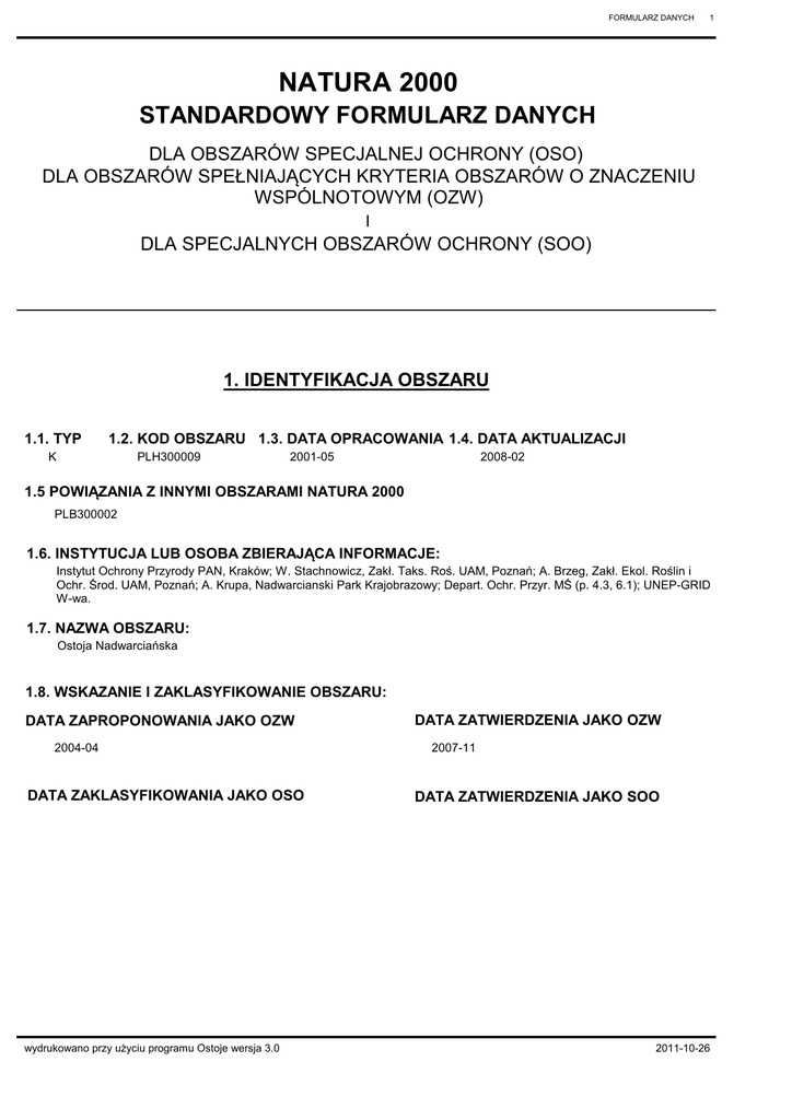 FORMULARZ DANYCH 1 NATURA 2000 STANDARDOWY FORMULARZ DANYCH DLA OBSZARÓW SPECJALNEJ OCHRONY (OSO) DLA OBSZARÓW SPEŁNIAJĄCYCH KRYTERIA OBSZARÓW O ZNACZENIU WSPÓLNOTOWYM (OZW) I DLA SPECJALNYCH OBSZARÓW OCHRONY (SOO) 1. IDENTYFIKACJA OBSZARU 1.1. TYP 1.2. KOD OBSZARU 1.3. DATA OPRACOWANIA 1.4. DATA AKTUALIZACJI K PLH300009 2001-05 2008-02 1.5 POWIĄZANIA Z INNYMI OBSZARAMI NATURA 2000 PLB300002 1.6. INSTYTUCJA LUB OSOBA ZBIERAJĄCA INFORMACJE: Instytut Ochrony Przyrody PAN, Kraków; W. Stachnowicz, Zakł. Taks. Roś. UAM, Poznań; A. Brzeg, Zakł. Ekol. Roślin i Ochr. Środ. UAM, Poznań; A. Krupa, Nadwarcianski Park Krajobrazowy; Depart. Ochr. Przyr. MŚ (p. 4.3, 6.1); UNEP-GRID W-wa. 1.7. NAZWA OBSZARU: Ostoja Nadwarciańska 1.8. WSKAZANIE I ZAKLASYFIKOWANIE OBSZARU: DATA ZAPROPONOWANIA JAKO OZW 2004-04 DATA ZAKLASYFIKOWANIA JAKO OSO wydrukowano przy użyciu programu Ostoje wersja 3.0 DATA ZATWIERDZENIA JAKO OZW 2007-11 DATA ZATWIERDZENIA JAKO SOO 2011-10-26 OBSZAR: PLH300009 Ostoja Nadwarciańska NATURA 2000 FORMULARZ DANYCH 2. POŁOŻENIE OBSZARU 2.1. POŁOŻENIE CENTRALNEGO PUNKTU OBSZARU DŁUGOŚĆ GEOGRAFICZNA E 17 55 SZEROKOŚĆ GEOGRAFICZNA 7 2.2. POWIERZCHNIA (ha): N 52 11 19 2.3. DŁUGOŚĆ OBSZARU (km): 26 653,1 2.4. WYSOKOŚĆ (m n.p.m.): MINIMALNA MAKSYMALNA ŚREDNIA 40 2.5. REGION ADMINISTRACYJNY (NUTS) Kod PL414 PL416 Nazwa regionu Koniński Kaliski % 96 4 2.6. REGION BIOGEOGRAFICZNY Nazwa regionu biogeograficznego Kontynentalny 2/ 1 2 OBSZAR: PLH300009 Ostoja Nadwarciańska NATURA 2000 FORMULARZ DANYCH 3. INFORMACJA PRZYRODNICZA 3.1. Typy SIEDLISK znajdujące się na terenie obszaru Natura 2000 oraz ocena znaczenia obszaru dla tych siedlisk 3.1.a. Typy SIEDLISK wymienione w Załączniku I Dyrektywy Rady 92/43/EWG Kod 1340 2330 3150 3160 3260 3270 4030 6120 6210 6230 6410 6430 6440 6510 7140 7150 7210 7230 9170 9190 91D0 91E0 91F0 91I0 91T0 Nazwa siedliska Śródlądowe słone łąki, pastwiska i szuwary (Glauco-Puccinietalia część - zbiorowiska śródlądowe) Wydmy śródlądowe z murawami napiaskowymi Starorzecza i naturalne eutroficzne zbiorniki wodne ze zbiorowiskami z Nympheion, Potamion Naturalne, dystroficzne zbiorniki wodne Stopień Względna Stan % pokrycia Reprezen. powierzch zachow. 1,00 2,00 3,00 1,00 Nizinne i podgórskie rzeki ze zbiorowiskami włosieniczników Ranunculion fluitantis Zalewane muliste brzegi rzek Suche wrzosowiska (Calluno-Genistion, Pohlio-Callunion, Calluno-Arctostaphylion) Ciepłolubne, śródlądowe murawy napiaskowe (Koelerion glaucae) Murawy kserotermiczne (Festuco-Brometea) - priorytetowe są tylko murawy z istotnymi stanowiskami storczyków Górskie i niżowe murawy bliźniczkowe (Nardion - płaty bogate florystycznie) Zmiennowilgotne łąki trzęślicowe (Molinion) Ziołorośla górskie (Adenostylion alliariae) i ziołorośla nadrzeczne (Convolvuletalia sepium) Łąki selemicowe (Cnidion dubii) Niżowe i górskie świeże łąki użytkowane ekstensywnie (Arrhenatherion elatioris) 1,00 1,00 0,01 0,01 5,00 3,00 1,00 0,20 0,10 Torfowiska przejściowe i trzęsawiska (przeważnie z roślinnością z Scheuchzerio-Caricetea) Obniżenia na podłożu torfowym z roślinnością ze związku Rhynchosporion Torfowiska nakredowe (Cladietum marisci, Caricetum buxbaumii, Schoenetum nigricantis) Górskie i nizinne torfowiska zasadowe o charakterze młak, turzycowisk i mechowisk Grąd środkowoeuropejski i subkontynentalny (Galio-Carpinetum, Tilio-Carpinetum) Pomorski kwaśny las brzozowo-dębowy (Betulo-Quercetum) 0,04 1,00 0,02 0,03 Bory i lasy bagienne (Vaccinio uliginosi-Betuletum pubescentis, Vaccinio uliginosi-Pinetum, Pino Łęgi wierzbowe, topolowe, olszowe i jesionowe (Salicetum albo-fragilis, Populetum albae, Alnenion Łęgowe lasy dębowo-wiązowo-jesionowe (Ficario-Ulmetum) Ciepłolubne dąbrowy (Quercetalia pubescenti-petraeae) Sosnowy bór chrobotkowy (Cladonio-Pinetum i chrobotkowa postać Peucedano-Pinetum) 3,00 0,50 0,00 0,00 A A A D D A A A D A A A A C D D B C D D D C B D D Ocena ogólna B B C A A A A A A B C C A A B A A C B B C C C B A B A B A A B A C C C B B B C C C B B B B 3.1 / 1 3 OBSZAR: PLH300009 Ostoja Nadwarciańska NATURA 2000 FORMULARZ DANYCH 3.2. GATUNKI, których dotyczy Artykuł 4 Dyrektywy Rady 79/409/EWG i gatunki wymienione w Załączniku II Dyrektywy Rady 92/43/EWG oraz ocena znaczenia obszaru dla tych gatunków 3.2.a. PTAKI wymienione w Załączniku I Dyrektywy Rady 79/409/EWG KOD NAZWA POPULACJA OSIADŁA Rozrodcza A021 A022 A023 A027 A030 A031 A037 A038 A068 A072 A073 A074 A075 A081 A082 A084 A089 A119 A120 A122 A127 A140 A151 A193 A195 A196 A197 A222 A224 A229 A234 A236 A238 A246 A255 A272 A307 A320 A321 A338 A379 Botaurus stellaris Ixobrychus minutus Nycticorax nycticorax Egretta alba (Ardea alba) Ciconia nigra Ciconia ciconia Cygnus bewickii (Cygnus Cygnus cygnus Mergus albellus (Mergellus albellus) Pernis apivorus Milvus migrans Milvus milvus Haliaeetus albicilla Circus aeruginosus Circus cyaneus Circus pygargus Aquila pomarina Porzana porzana Porzana parva Crex crex Grus grus Pluvialis apricaria Philomachus pugnax Sterna hirundo Sternula albifrons Chlidonias hybrida Chlidonias niger Asio flammeus Caprimulgus europaeus Alcedo atthis Picus canus Dryocopus martius Dendrocopos medius Lullula arborea Anthus campestris Luscinia svecica Sylvia nisoria Ficedula parva Ficedula albicollis Lanius collurio Emberiza hortulana OCENA ZNACZENIA OBSZARU MIGRUJĄCA Zimująca Populacja Stan zach. Izolacja 11-20m 1-3p 1-3p <23i 5-6p P <12i <20i <9i 2-3p >1p 1-3p 2p 85p 0-1p >15p 0-1p 30-35p <3p c.65m 10-20p <5f c.20p <35p >100p 100-150p 1p? P 20-25p 1-2p 12-15p >155p P >25p 12-17p P 2p 1m P 30-40p Ogólnie Przelotna <250i 400i <1200i D D D D D D D D D D D D D D D D D D D D D D D D D D D D D D D D D D D D D D D D D 3.2.b. Regularnie występujące Ptaki Migrujące nie wymienione w Załączniku I Dyrektywy Rady 3.2 / 1 3 OBSZAR: PLH300009 Ostoja Nadwarciańska NATURA 2000 FORMULARZ DANYCH 79/409/EWG KOD NAZWA POPULACJA OSI
