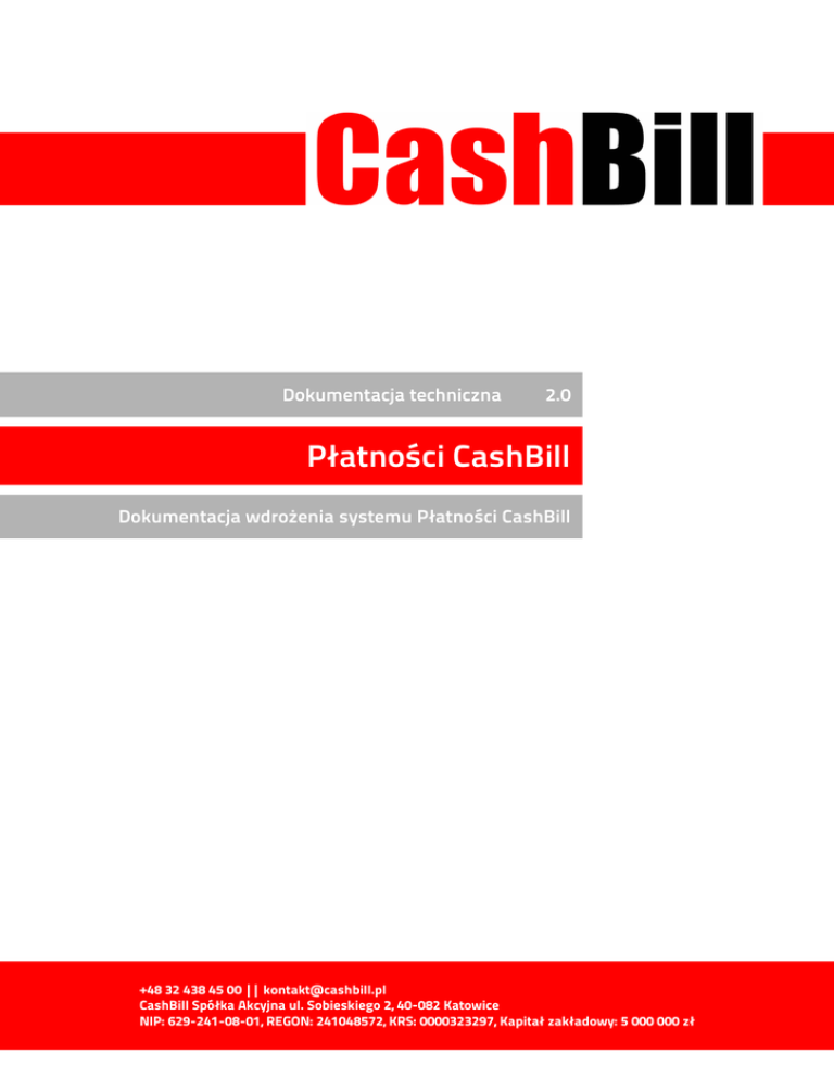 Dokumentacja techniczna 2.0 Płatności CashBill Dokumentacja wdrożenia systemu Płatności CashBill +48 32 438 45 00 || [email protected] CashBill Spółka Akcyjna ul. Sobieskiego 2, 40-082 Katowice NIP: 629-241-08-01, REGON: 241048572, KRS: 0000323297, Kapitał zakładowy: 5 000 000 zł Płatności CashBill Spis treści 1 Zgłoszenie uruchomienia usługi................................................................................................... 3 1.1 Weryfikacja Punktu Płatności.................................................................................................. 5 1.2 Optymalizacja prowizji.............................................................................................................. 6 2 Implementacja w wariancie Prosty Formularz HTML.................................................................8 2.1 Nowa płatność........................................................................................................................... 8 2.2 Odebranie potwierdzenia i przekierowanie przeglądarki klienta........................................10 2.3 Przykłady użycia...................................................................................................................... 11 3 Implementacja w wariancie Web Service SOAP........................................................................14 3.1 Autoryzacja............................................................................................................................... 14 3.2 Dodatkowe typy....................................................................................................................... 14 3.3 Pobranie dostępnych kanałów płatności..............................................................................15 3.4 Nowa płatność......................................................................................................................... 16 3.5 Pobranie informacji o płatności.............................................................................................. 17 3.6 Przykłady użycia...................................................................................................................... 18 4 Implementacja w wariancie Web Service REST.........................................................................21 4.1 Pobranie dostępnych kanałów płatności..............................................................................21 4.2 Nowa płatność......................................................................................................................... 22 4.3 Pobranie informacji o płatności.............................................................................................. 24 4.4 Przykłady użycia...................................................................................................................... 25 5 Usługa powiadamiania (Notification service)............................................................................27 5.1 Dostępne komunikaty............................................................................................................. 28 5.2 Statusy transakcji.................................................................................................................... 28 6 Historia zmian............................................................................................................................... 30 2 Płatności CashBill 1 Zgłoszenie uruchomienia usługi Pierwszym etapem uruchomienia Płatności Cashbill w sklepie internetowym jest założenie Punktu Płatności w panelu administracyjnym CashBill. Każdy sklep internetowy powinien posiadać własny Punkt Płatności. W celu udostępnienia swoim Klientom możliwości wykonania dowolnej płatności za towary lub usługi w sklepie internetowym, tworząc nowy Punkt Płatności należy wybrać opcję „Punkt Płatności Sklep Internetowy”. Zgłoszenie uruchomienia usługi 3 Płatności CashBill Wysyłając zgłoszenie uruchomienia nowego Punktu Płatności należy wypełnić formularz wstępnej konfiguracji punktu. Dostępne są dwa sposoby komunikacji sklepu internetowego z systemem Płatności Cashbill, co jest odzwierciedlone w dwóch trybach pracy Punktu Płatności: Z wykorzystaniem Prostego Formularza HTML (rozdział 2) Za pośrednictwem WebService (rozdziały 3, 4, 5) Ilustracja 1: Punkt Płatności w trybie Prosty Formularz HTML Komunikacja z wykorzystaniem formularza HTML zapewnia najprostszą i najszybszą integrację sklepu internetowego z systemem Płatności CashBill. Większość parametrów wymaganych do pracy sklepu internetowego podawana jest w panelu administracyjnym, a integracja wymaga jedynie utworzenia odpowiedniego formularza HTML na stronie sklepu. Zgłoszenie uruchomienia usługi 4 Płatności CashBill Ilustracja 2: Punkt Płatności w trybie Web Service Wykorzystanie Web Service otwiera drogę do pełnej automatyzacji obsługi płatności internetowych. Mechanizmy Web Service pozwalają oprogramowaniu sklepu na bezpośrednie komunikowanie się z systemami Płatności CashBill i przejęcie pełnej kontroli nad procesem przetwarzania płatności. Wybór sposobu komunikacji może być w każdej chwili zmieniony w panelu administracyjnym. Złożenie wniosku o uruchomienie usługi następuje poprzez przycisk „uruchom usługę” 1.1 Weryfikacja Punktu Płatności Ze względu na wymogi nakładane przez instytucje nadzoru finansowego, każdorazowe uruchomienie nowego sklepu internetowego wymaga przeprowadzenia procesu weryfikacji. Proces przeprowadzany jest przez personel systemu CashBill po każdym zgłoszeniu nowego Punktu Płatności i zwykle trwa do jednego dnia roboczego. W czasie, gdy przeprowadzana jest weryfikacja można dokonać wstępnej konfiguracji punktu. Panel administracyjny udostępnia w tym etapie wszystkie parametry wymagane do przeprowadzenia integracji z oprogramowaniem sklepu internetowego. 1.2 Optymalizacja prowizji Zgłoszenie 