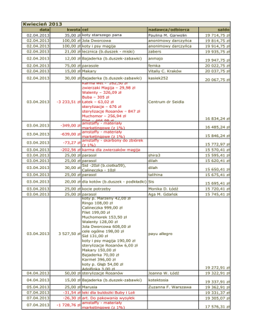 Kwiecień 2013 data 02.04.2013 kwota cel 35,00 zł koty starszego pana nadawca/odbiorca saldo Paulina M. Garwolin 19 714,75 zł 02.04.2013 100,00 zł Jola Dworcowa anonimowy darczyńca 19 814,75 zł 02.04.2013 100,00 zł koty i psy magija anonimowy darczyńca 19 914,75 zł 02.04.2013 21,00 zł lecznica (b.duszek - miski) zabers 19 935,75 zł 02.04.2013 12,00 zł Bajaderka (b.duszek-zabawki) anmajo 19 947,75 zł 02.04.2013 75,00 zł parasole femka 20 022,75 zł 02.04.2013 15,00 zł Makary Vitaliy C. Kraków 20 037,75 zł kasiek252 20 067,75 zł 02.04.2013 03.04.2013 03.04.2013 03.04.2013 03.04.2013 03.04.2013 30,00 zł Bajaderka (b.duszek-zabawki) Karma wet - 262,50 zł zwierzaki Magija – 29,98 zł Walenty – 326,09 zł Buba – 305 zł -3 233,51 zł Łatek – 63,02 zł sterylizacje – 676 zł sterylizacje Rosanów – 847 zł Muchomor – 256,94 zł Filet – 466,99 zł amstaffy - materiały -349,00 zł marketingowe (z 1%) amstaffy - materiały -639,00 zł marketingowe (z 1%) amstaffy - skarbony do zbiórek -73,27 zł (z 1%) -202,56 zł karma dla zwierzaków magija Centrum dr Seidla 16 834,24 zł 16 485,24 zł 15 846,24 zł 15 772,97 zł 15 570,41 zł 03.04.2013 25,00 zł parasol shira3 15 595,41 zł 03.04.2013 dilah 15 620,41 zł dilah 15 650,41 zł 03.04.2013 25,00 zł parasol Sid -20zł (b.ciotka59), 30,00 zł Calineczka - 10zł 25,00 zł parasol talihina 15 675,41 zł 03.04.2013 20,00 zł dla kotów (b.duszek - podkładki) Sis 15 695,41 zł 03.04.2013 25,00 zł kocie potrzeby Monika D. Łódź 15 720,41 zł Aga M. Gdańsk 15 745,41 zł 03.04.2013 03.04.2013 03.04.2013 04.04.2013 25,00 zł parasol koty p. Marzeny 42,00 zł Ringo 108,00 zł Calineczka 999,00 zł Filet 199,00 zł Muchomorek 153,50 zł Walenty 128,00 zł Jola Dworcowa 608,00 zł cele ogólne 198,00 zł 3 527,50 zł Sid 131,00 zł koty i psy magija 190,00 zł sterylizacje Rosanów 6,00 zł Makary 150,00 zł Bajaderka 70,00 zł Karmel 396,00 zł koty p. Głąb 54,00 zł Adolfinka 3,00 zł 50,00 zł sterylizacje Rosanów payu allegro 19 272,91 zł Joanna W. Łódź 19 322,91 zł 04.04.2013 15,00 zł Bajaderka (b.duszek-zabawki) kotektosia 19 337,91 zł 05.04.2013 25,00 zł Marusia Zuzanna F. Warszawa 19 362,91 zł 07.04.2013 -31,54 zł leki dla buldożki Buby i Loli 19 331,37 zł 07.04.2013 -26,30 zł art. Do pakowania wysyłek amstaffy - materiały -1 728,76 zł marketingowe (z 1%) 19 305,07 zł 07.04.2013 17 576,31 zł 07.04.2013 07.04.2013 07.04.2013 08.04.2013 08.04.2013 08.04.2013 amstaffy - usługa weterynaryjna (z 1%) -210,00 zł amstaffy - karma (z 1%) amstaffy - materiały -500,00 zł marketingowe (z 1%) 500,00 zł Jola Dworcowa Ewa L. Warszawa 100,00 zł Bajaderka Ewa L. Warszawa 50,00 zł Makary Ewa L. Warszawa -150,00 zł 17 426,31 zł 17 216,31 zł 16 716,31 zł 17 216,31 zł 17 316,31 zł 17 366,31 zł 08.04.2013 10,00 zł Marusia (b.duszek - zabawki) Sis 17 376,31 zł 08.04.2013 50,00 zł Lukrecja Elżbieta F. Warszawa 17 426,31 zł 08.04.2013 100,00 zł Marusia anonimowy darczyńca 17 526,31 zł 08.04.2013 100,00 zł Lukrecja anonimowy darczyńca 17 626,31 zł 08.04.2013 100,00 zł Bajaderka anonimowy darczyńca 17 726,31 zł 08.04.2013 50,00 zł Marusia Rafał K. Wieliczka 17 776,31 zł 08.04.2013 80,00 zł Marusia Joanna G. Łódź 17 856,31 zł 08.04.2013 30,00 zł Marusia Sylwester G. Łódź 17 886,31 zł 08.04.2013 50,00 zł Lukrecja Rafał K. Wieliczka 17 936,31 zł 08.04.2013 100,00 zł kotylion Mirosława S. Rosanów 18 036,31 zł 09.04.2013 100,00 zł Balbin Łukasz J. Stare Babice 18 136,31 zł 09.04.2013 50,00 zł sterylizacje (koty ze smutnej) Paweł F. Łódź 18 186,31 zł 09.04.2013 10,00 zł Lukrecja Malgorzata C. Czeladź 18 196,31 zł Natalia J. Wędzina 18 221,31 zł grey 18 256,31 zł dyktatura 18 264,31 zł femka 18 284,31 zł pietrucha 18 306,31 zł b-dur 18 356,31 zł filiżanka 18 374,31 zł 09.04.2013 10.04.2013 10.04.2013 10.04.2013 11.04.2013 11.04.2013 11.04.2013 11.04.2013 11.04.2013 25,00 zł Marusia cele statutowe (b.sis 35,00 zł rękodzieło) cele statutowe (b.sis 8,00 zł rękodzieło) 20,00 zł cele statutowe (torby) cele statutowe (b.sis 22,00 zł rękodzieło) 50,00 zł cele statutowe (parasol) cele statutowe (b.sis 18,00 zł rękodzieło) -93,84 zł karma dla kotów Sokolnickich 18 280,47 zł -856,63 zł karma dla kotów Joli Dworcowej 17 423,84 zł 12.04.2013 cele statutowe (b.sis 10,00 zł rękodzieło) 12.04.2013 69,00 zł Calineczka (b.ciotka59-zabawki) ciotka59 17 502,84 zł 12.04.2013 15,00 zł Calineczka (b.ciotka59-zabawki) atla 17 517,84 zł 14.04.2013 14.04.2013 14.04.2013 maupa -219,63 zł czynsz kociarnia żwirek dla kotów magija i kotów -61,50 zł w szpitaliku -45,83 zł leki dla makarego 17 433,84 zł 17 298,21 zł 17 236,71 zł 17 190,88 zł 14.04.2013 16,00 zł cele statutowe (torby) as_animali 17 206,88 zł 14.04.2013 22,00 zł myszorek1972 17 228,88 zł bumił 17 248,88 zł anmajo 17 288,88 zł 15.04.2013 cele statutowe (b.sis 20,00 zł rękodzieło) 40,00 zł cele statutowe (torby) 15.04.2013 17,00 zł Calineczka (b.ciotka59-zabawki) ciotka59 17 305,88 zł 15.04.2013 26,00 zł cele statutowe (torby) mir-best 17 331,88 zł Wioletta J. 17 431,88 zł Elżbieta S. Łódź 17 456,88 zł Agnieszka B. Łódź 17 506,88 zł 15.04.2013 15.04.2013 15.04.2013 15.04.2013 16.04.2013 100,00 zł darowizna kotylion 25,00 zł darowizna 50,00 zł darowizna -207,64 zł karma 17 299,24 zł 16.04.2013 17.04.2013 zwrot za wyciagi w formie papierowej -1 070,10 zł klatki-łapki 20,00 zł 17 319,24 zł 16 249,14 zł 17.04.2013 30,00 zł adopcja wirtualna Bartuś Joanna 16 279,14 zł 17.04.2013 26,00 zł cele statutowe (torby) Yagutka 16 305,14 zł Monika J. Warszawa 16 330,14 zł 17.04.2013 18.04.2013 18.04.2013 25,00 zł cele statutowe karma dla Ringo i zwierzaków -273,68 zł vip 10,00 zł cele statutowe (torby) 16 056,46 zł anmajo 16 066,46 zł włóczka 16 116,46 zł 18.04.2013 50,00 zł cele statutowe (parasol) 18.04.2013 50,00 zł Walenty Maciej W. Łódź cele