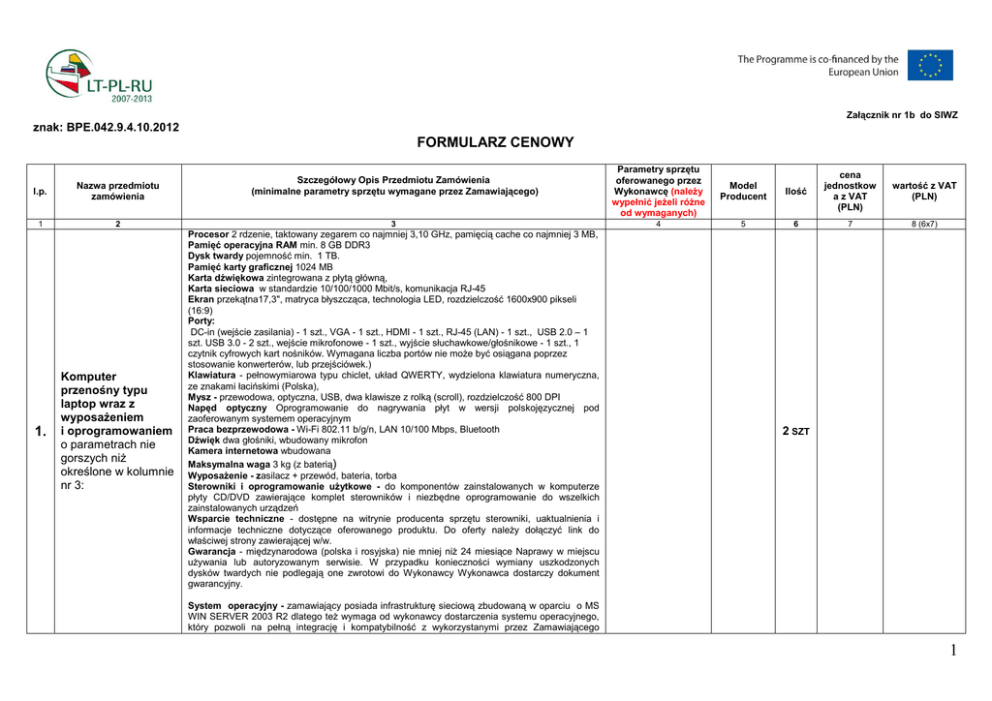 Załącznik nr 1b do SIWZ znak: BPE.042.9.4.10.2012 FORMULARZ CENOWY l.p. Nazwa przedmiotu zamówienia 1 2 1. Komputer przenośny typu laptop wraz z wyposaŜeniem i oprogramowaniem o parametrach nie gorszych niŜ określone w kolumnie nr 3: Szczegółowy Opis Przedmiotu Zamówienia (minimalne parametry sprzętu wymagane przez Zamawiającego) 3 Procesor 2 rdzenie, taktowany zegarem co najmniej 3,10 GHz, pamięcią cache co najmniej 3 MB, Pamięć operacyjna RAM min. 8 GB DDR3 Dysk twardy pojemność min. 1 TB. Pamięć karty graficznej 1024 MB Karta dźwiękowa zintegrowana z płytą główną, Karta sieciowa w standardzie 10/100/1000 Mbit/s, komunikacja RJ-45 Ekran przekątna17,3", matryca błyszcząca, technologia LED, rozdzielczość 1600x900 pikseli (16:9) Porty: DC-in (wejście zasilania) - 1 szt., VGA - 1 szt., HDMI - 1 szt., RJ-45 (LAN) - 1 szt., USB 2.0 – 1 szt. USB 3.0 - 2 szt., wejście mikrofonowe - 1 szt., wyjście słuchawkowe/głośnikowe - 1 szt., 1 czytnik cyfrowych kart nośników. Wymagana liczba portów nie moŜe być osiągana poprzez stosowanie konwerterów, lub przejściówek.) Klawiatura - pełnowymiarowa typu chiclet, układ QWERTY, wydzielona klawiatura numeryczna, ze znakami łacińskimi (Polska), Mysz - przewodowa, optyczna, USB, dwa klawisze z rolką (scroll), rozdzielczość 800 DPI Napęd optyczny Oprogramowanie do nagrywania płyt w wersji polskojęzycznej pod zaoferowanym systemem operacyjnym Praca bezprzewodowa - Wi-Fi 802.11 b/g/n, LAN 10/100 Mbps, Bluetooth Dźwięk dwa głośniki, wbudowany mikrofon Kamera internetowa wbudowana Maksymalna waga 3 kg (z baterią) WyposaŜenie - zasilacz + przewód, bateria, torba Sterowniki i oprogramowanie uŜytkowe - do komponentów zainstalowanych w komputerze płyty CD/DVD zawierające komplet sterowników i niezbędne oprogramowanie do wszelkich zainstalowanych urządzeń Wsparcie techniczne - dostępne na witrynie producenta sprzętu sterowniki, uaktualnienia i informacje techniczne dotyczące oferowanego produktu. Do oferty naleŜy dołączyć link do właściwej strony zawierającej w/w. Gwarancja - międzynarodowa (polska i rosyjska) nie mniej niŜ 24 miesiące Naprawy w miejscu uŜywania lub autoryzowanym serwisie. W przypadku konieczności wymiany uszkodzonych dysków twardych nie podlegają one zwrotowi do Wykonawcy Wykonawca dostarczy dokument gwarancyjny. Parametry sprzętu oferowanego przez Wykonawcę (naleŜy wypełnić jeŜeli róŜne od wymaganych) Model Producent 4 5 Ilość cena jednostkow a z VAT (PLN) wartość z VAT (PLN) 6 7 8 (6x7) 2 SZT System operacyjny - zamawiający posiada infrastrukturę sieciową zbudowaną w oparciu o MS WIN SERVER 2003 R2 dlatego teŜ wymaga od wykonawcy dostarczenia systemu operacyjnego, który pozwoli na pełną integrację i kompatybilność z wykorzystanymi przez Zamawiającego 1 rozwiązaniami we wszystkich aspektach warstwy logicznej, protokołów oraz wykorzystanego systemu zarządzania siecią. System w wersji polskiej posiadający co najmniej następujące właściwości: - zainstalowany system operacyjny nie wymagający juŜ aktywacji (telefonicznej lub przez Internet) w firmie producenta, - dołączony nośnik z oprogramowaniem, - moŜliwość dokonywanie bezpłatnych aktualizacji przez sieć Internet Oprogramowania: - program antywirusowy z licencją na 24 miesiące w wersji polskiej - oprogramowanie biurowe obejmujące: arkusz kalkulacyjny, edytor tekstu, prezentacje, menedŜer poczty elektronicznej w wersji polskiej który pozwoli na pełną integrację i kompatybilność z zainstalowanym systemem operacyjnym. Oprogramowanie musi zapewniać moŜliwość bezpłatnych aktualizacji i poprawek przez Internet oraz powinno działać w oparciu o okienkowy, graficzny tryb pracy z uŜytkownikiem, tzw. GUI. Powinno teŜ zapewniać: automatyczny zapis dokumentów, ustawianie domyślnego formatu zapisu, ograniczenie dostępu do konfiguracji oprogramowania oraz moŜliwość konfiguracji interfejsu uŜytkownika Do komputera naleŜy dołączyć wersje instalacyjne oprogramowania (system operacyjny, pakiet biurowy, sterowniki) na nośniku zewnętrznym (CD, DVD) 2. Komputer przenośny typu laptop wraz z wyposaŜeniem i oprogramowaniem o parametrach nie gorszych niŜ określone w kolumnie nr 3: Procesor 2 rdzenie, taktowany zegarem co najmniej 3,10 GHz, pamięcią cache co najmniej 3 MB, Pamięć operacyjna RAM min. 8 GB DDR3 Dysk twardy pojemność min. 1 TB. Pamięć karty graficznej 1024 MB Karta dźwiękowa zintegrowana z płytą główną, Karta sieciowa w standardzie 10/100/1000 Mbit/s, komunikacja RJ-45 Ekran przekątna17,3", matryca błyszcząca, technologia LED, rozdzielczość 1600x900 pikseli (16:9) Porty: DC-in (wejście zasilania) - 1 szt., VGA - 1 szt., HDMI - 1 szt., RJ-45 (LAN) - 1 szt., USB 2.0 – 1 szt. USB 3.0 - 2 szt., wejście mikrofonowe - 1 szt., wyjście słuchawkowe/głośnikowe - 1 szt., 1 czytnik cyfrowych kart nośników. Wymagana liczba portów nie moŜe być osiągana poprzez stosowanie konwerterów, lub przejściówek.) Klawiatura - pełnowymiarowa typu chiclet, układ QWERTY, wydzielona klawiatura numeryczna, klawisze, klawiatura ze znakami łącznie cyrylicy (rosyjskiej) i znakami łacińskimi), 3 SZT Mysz - przewodowa, optyczna, USB, dwa klawisze z rolką (scroll), rozdzielczość 800 DPI Napęd optyczny Oprogramowanie do nagrywania płyt w wersji polskojęzycznej pod zaoferowanym systemem operacyjnym Praca bezprzewodowa - Wi-Fi 802.11 b/g/n, LAN 10/100 Mbps, Bluetooth Dźwięk dwa głośniki, wbudowany mikrofon Kamera internetowa wbudowana Maksymalna waga 3 kg (z baterią) WyposaŜenie - zasilacz + przewód, bateria, torba Sterowniki i oprogramowanie uŜytkowe - do komponentów zainstalowanych w komputerze płyty CD/DVD zawierające komplet sterowników i niezbędne oprogramowanie do wszelkich zainstalowanych urządzeń Wsparcie techniczne - dostępne na witrynie producenta sprzętu sterowniki, uaktualnienia i 2 informacje techniczne doty
