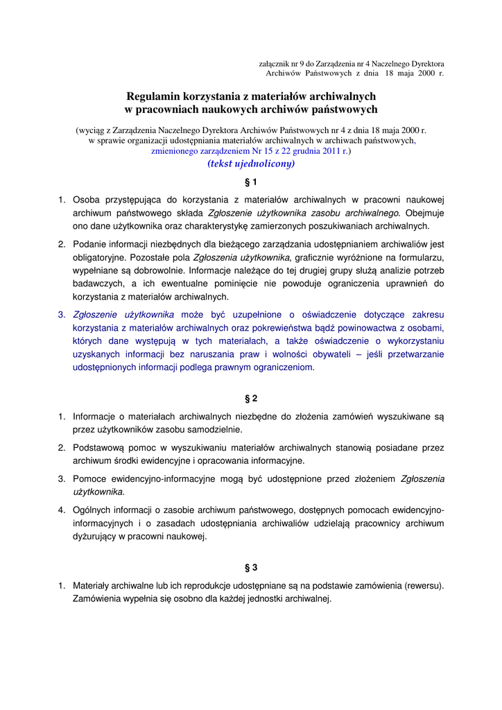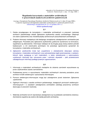 załącznik nr 9 do Zarządzenia nr 4 Naczelnego Dyrektora Archiwów Państwowych z dnia 18 maja 2000 r. Regulamin korzystania z materiałów archiwalnych w pracowniach naukowych archiwów państwowych (wyciąg z Zarządzenia Naczelnego Dyrektora Archiwów Państwowych nr 4 z dnia 18 maja 2000 r. w sprawie organizacji udostępniania materiałów archiwalnych w archiwach państwowych, zmienionego zarządzeniem Nr 15 z 22 grudnia 2011 r.) (tekst ujednolicony) §1 1. Osoba przystępująca do korzystania z materiałów archiwalnych w pracowni naukowej archiwum państwowego składa Zgłoszenie użytkownika zasobu archiwalnego. Obejmuje ono dane użytkownika oraz charakterystykę zamierzonych poszukiwaniach archiwalnych. 2. Podanie informacji niezbędnych dla bieżącego zarządzania udostępnianiem archiwaliów jest obligatoryjne. Pozostałe pola Zgłoszenia użytkownika, graficznie wyróżnione na formularzu, wypełniane są dobrowolnie. Informacje należące do tej drugiej grupy służą analizie potrzeb badawczych, a ich ewentualne pominięcie nie powoduje ograniczenia uprawnień do korzystania z materiałów archiwalnych. 3. Zgłoszenie użytkownika może być uzupełnione o oświadczenie dotyczące zakresu korzystania z materiałów archiwalnych oraz pokrewieństwa bądź powinowactwa z osobami, których dane występują w tych materiałach, a także oświadczenie o wykorzystaniu uzyskanych informacji bez naruszania praw i wolności obywateli – jeśli przetwarzanie udostępnionych informacji podlega prawnym ograniczeniom. §2 1. Informacje o materiałach archiwalnych niezbędne do złożenia zamówień wyszukiwane są przez użytkowników zasobu samodzielnie. 2. Podstawową pomoc w wyszukiwaniu materiałów archiwalnych stanowią posiadane przez archiwum środki ewidencyjne i opracowania informacyjne. 3. Pomoce ewidencyjno-informacyjne mogą być udostępnione przed złożeniem Zgłoszenia użytkownika. 4. Ogólnych informacji o zasobie archiwum państwowego, dostępnych pomocach ewidencyjnoinformacyjnych i o zasadach udostępniania archiwaliów udzielają pracownicy archiwum dyżurujący w pracowni naukowej. §3 1. Materiały archiwalne lub ich reprodukcje udostępniane są na podstawie zamówienia (rewersu). Zamówienia wypełnia się osobno dla każdej jednostki archiwalnej. 2. Udostępniane jednostki archiwalne opatrzone są drukami rejestru udostępnienia (metryczkami). Użytkownik zasobu zobowiązany jest wpisać w odpowiednich polach datę korzystania z jednostki oraz swoje imię i nazwisko; może też podać temat swojej pracy (przedmiot badań). §4 Użytkownicy zasobu mogą być zobowiązani do posługiwania się w pomieszczeniach archiwum państwowego kartą identyfikacyjną, wydawaną im przed podjęciem korzystania z archiwaliów. §5 1. Zamówione materiały archiwalne wydawane są uprawnionemu użytkownikowi z podręcznego depozytu pracowni naukowej przy każdorazowym podjęciu przezeń korzystania z archiwaliów. 2. W przypadku materiałów szczególnie cennych użytkownik przerywający pracę nad udostępnionymi mu archiwaliami i na krótki czas opuszczający pracownię naukową może być zobowiązany do każdorazowego deponowania ich u dyżurnego pracownika. 3. Dyrektor archiwum państwowego ustala maksymalną liczbę jednostek archiwalnych, jaka może być udostępniona jednej osobie w ciągu dnia – ze względu na wymogi bezpieczeństwa zasobu. 4. Po każdorazowym zakończeniu pracy korzystający z materiałów archiwalnych w pracowni naukowej zwraca je dyżurującemu pracownikowi, z dyspozycją ich zwrotu do magazynu lub zachowania w depozycie pracowni naukowej. 5. Jeżeli przerwa w korzystaniu z akt znajdujących się w podręcznym depozycie przekroczy dwa tygodnie, są one zwracane do magazynu bez dyspozycji użytkownika. Podjęcie pracy nad nimi wymaga złożenia ponownego zamówienia. Dyrektorzy archiwów państwowych mogą ustalić krótszy od podanego czas deponowania archiwaliów uznanych za szczególnie cenne. §6 1. Materiały archiwalne, z których sporządzono reprodukcje użytkowe (głównie – mikrofilmy), udostępniane są w postaci reprodukcji. Dotyczy to zwłaszcza dokumentów uznanych za szczególnie cenne. Dyrektor archiwum państwowego może dopuścić do zamówienia takich materiałów w oryginale tylko w indywidualnych i uzasadnionych przypadkach, na podstawie umotywowanego oświadczenia użytkownika o nieprzydatności korzystania w zamierzonej pracy z reprodukcji. 2. Jednostki archiwalne zawierające dokumenty luźne udostępnia się kolejno: po zwróceniu dyżurnemu wykorzystanej jednostki użytkownik otrzymuje następną. Wyjątki od tej zasady dopuszczalne są w przypadkach umotywowanych szczególnymi potrzebami badawczymi. §7 Ze względu na wymogi bezpieczeństwa zasobu archiwalnego kontroli mogą być poddane własne notatki użytkowników, wynoszone przez nich z pracowni naukowej, w celu uniknięcia 2 przypadkowego zamieszania w nie udostępnionych materiałów archiwalnych. Za pracowników upoważnionych w tym zakresie uważa się osoby dyżurujące w pracowni i pracowników ochrony, a także ich przełożonych. §8 1. Użytkownik materiałów archiwalnych korzysta z nich w ramach złożonego przezeń Zgłoszenia, nie ingerując w ich układ i treść, zachowując dbałość o ich stan fizyczny i bezpieczeństwo. 2. Korzystanie z materiałów archiwalnych w pracowni naukowej powinno być prowadzone w sposób nie zakłócający pracy innych użytkowników akt. 3. Wynoszenie poza pomieszczenie pracowni naukowej materiałów archiwalnych i pomocy ewidencyjno-informacyjnych przez użytkowników jest zabronione – pod rygorem odmowy dalszego udostępniania archiwaliów, niezależnie od ewentualnych innych sankcji przewidzianych prawem. 4. Do pracowni naukowej archiwum państwowego nie należy wnosić przedmiotów i substancji mogących spowodować uszkodzenie dokumentów (w tym artykułów spożywczych, środków barwiących, łatwopaln
