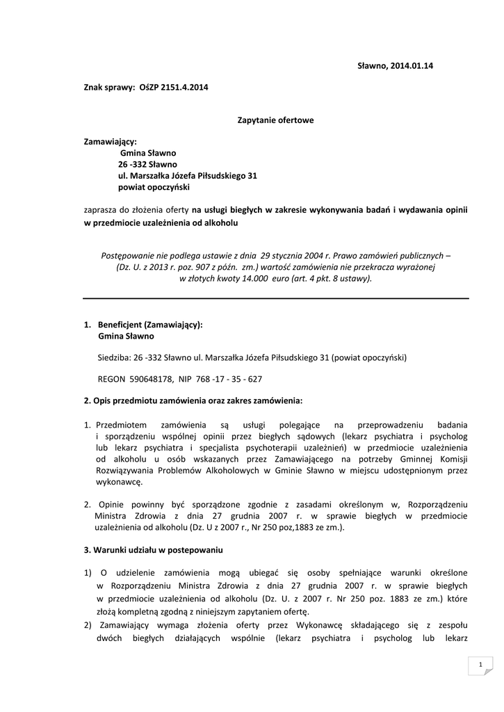 Sławno, 2014.01.14 Znak sprawy: OśZP 2151.4.2014 Zapytanie ofertowe Zamawiający: Gmina Sławno 26 -332 Sławno ul. Marszałka Józefa Piłsudskiego 31 powiat opoczyński zaprasza do złożenia oferty na usługi biegłych w zakresie wykonywania badań i wydawania opinii w przedmiocie uzależnienia od alkoholu Postępowanie nie podlega ustawie z dnia 29 stycznia 2004 r. Prawo zamówień publicznych – (Dz. U. z 2013 r. poz. 907 z późn. zm.) wartość zamówienia nie przekracza wyrażonej w złotych kwoty 14.000 euro (art. 4 pkt. 8 ustawy). 1. Beneficjent (Zamawiający): Gmina Sławno Siedziba: 26 -332 Sławno ul. Marszałka Józefa Piłsudskiego 31 (powiat opoczyński) REGON 590648178, NIP 768 -17 - 35 - 627 2. Opis przedmiotu zamówienia oraz zakres zamówienia: 1. Przedmiotem zamówienia są usługi polegające na przeprowadzeniu badania i sporządzeniu wspólnej opinii przez biegłych sądowych (lekarz psychiatra i psycholog lub lekarz psychiatra i specjalista psychoterapii uzależnień) w przedmiocie uzależnienia od alkoholu u osób wskazanych przez Zamawiającego na potrzeby Gminnej Komisji Rozwiązywania Problemów Alkoholowych w Gminie Sławno w miejscu udostępnionym przez wykonawcę. 2. Opinie powinny być sporządzone zgodnie z zasadami określonym w, Rozporządzeniu Ministra Zdrowia z dnia 27 grudnia 2007 r. w sprawie biegłych w przedmiocie uzależnienia od alkoholu (Dz. U z 2007 r., Nr 250 poz,1883 ze zm.). 3. Warunki udziału w postepowaniu 1) O udzielenie zamówienia mogą ubiegać się osoby spełniające warunki określone w Rozporządzeniu Ministra Zdrowia z dnia 27 grudnia 2007 r. w sprawie biegłych w przedmiocie uzależnienia od alkoholu (Dz. U. z 2007 r. Nr 250 poz. 1883 ze zm.) które złożą kompletną zgodną z niniejszym zapytaniem ofertę. 2) Zamawiający wymaga złożenia oferty przez Wykonawcę składającego się z zespołu dwóch biegłych działających wspólnie (lekarz psychiatra i psycholog lub lekarz 1 psychiatra i specjalista psychoterapii uzależnień) wpisanych na listę biegłych sądowych z zakresu uzależnienia od alkoholu przy Sądzie Okręgowym lub przez Wykonawcę dysponującego co najmniej jednym lekarzem psychiatrą oraz co najmniej jednym psychologiem (albo specjalistą psychoterapii uzależnień) wpisanych na listę biegłych sądowych z zakresu uzależnienia od alkoholu przy Sądzie Okręgowym. 3) Zamawiający dopuszcza złożenie oferty częściowej tj.: - lekarz psychiatra - psycholog/ specjalista psychoterapii uzależnień 4) Wykonawca będzie dysponował lokalem, w którym będą przeprowadzane badania psychiatryczno – psychologiczne w przedmiocie uzależnienia do alkoholu, znajdującym się na terenie powiatu opoczyńskiego 4. Wymagane oświadczenia i dokumenty: 1) Formularz ofertowy zgodnie z wzorem stanowiącym załącznik Nr 1 do niniejszego zapytania ofertowego. 2) oświadczenie, że osoby które będą uczestniczyć w wykonywaniu zamówienia posiadają wymagane uprawnienia określone w Rozporządzeniu Ministra Zdrowia z dnia 27 grudnia 2007 r. w sprawie biegłych w przedmiocie uzależnienia od alkoholu (Dz. U z2007 r. Nr 250 poz. 1883 ze zm.) zgodnie z wzorem stanowiącym załącznik Nr 2 do niniejszego zapytania ofertowego. 5. Rodzaje i opis kryteriów, którymi Beneficjent będzie się kierował przy wyborze oferty Przy wyborze ofert Beneficjent będzie się kierował następującymi kryteriami i ich znaczeniem: Ceną – 100 % Ocena punktowa kryterium dokonana zostanie zgodnie z formułą: Wg kryterium ceny: Px = N : W x 100 Px - ilość punktów przyznanych danej ofercie za cenę ( brutto ) N - najniższa cena ( brutto ) z zaoferowanych W - cena ( brutto ) z badanej oferty Z - znaczenie czynnika (%) Kryterium oceny oferty jest obowiązująca oferenta cena brutto 6. Termin realizacji zamówienia: Termin wykonania zamówienia: od dnia zawarcia umowy do dnia 31.12.2014 r. 2 7. Forma i sposób wynagrodzenia: 1) Za wykonanie usługi Wykonawcy przysługiwać będzie wynagrodzenie miesięczne w wysokość stanowiącej iloczyn liczby przeprowadzonych badań oraz ustalonej ceny za jedno badanie/opinię, płatnę z dołu na podstawie wystawionego przez Wykonawcę rachunku/faktury. 2) Rachunek/fakturę należy złożyć u Zamawiającego raz w miesiącu, do 5 dnia każdego miesiąca za miesiąc poprzedni. 3) Cena pozostaje niezmieniona w okresie wykonywania zamówienia. 4) Wszelkie koszty związane z realizacją zamówienia ponosi Wykonawca 5) Termin płatności – 30dni od daty wystawienia rachunku/faktury 8. Miejsce, sposób i termin składania ofert. 8.1. Ofertę w zamkniętej kopercie należy złożyć do dnia 2014.01.22 do godz. 10.00 w siedzibie zamawiającego: Urząd Gminy Sławno ul. Marszałka Józefa Piłsudskiego 31 pokój Nr 13 - sekretariat z dopiskiem: Oferta na usługi biegłych w zakresie wykonywania badań i wydawania opinii w przedmiocie uzależnienia od alkoholu 8.2.Otwarcie ofert nastąpi dnia 2014.01.22 o godz. 10.30 w siedzibie zamawiającego: Urząd Gminy Sławno ul. Marszałka Józefa Piłsudskiego 31 sala konferencyjna 9. Osobą do kontaktów w sprawie niniejszego zapytania jest: Danuta Urbańczyk tel. (44) 755 – 18 – 53 w godz. od 7.30 - 15.30 3 10. Do realizacji zamówienia zostanie wybrany wykonawca, który zaoferuje przedmiot zamówienia zgodnie z wymogami zamawiającego wraz z najniższą ceną. 11. Oferta musi być podpisana przez osobę upoważnioną do reprezentowania wykonawcy, zgodnie z formą reprezentacji oferenta określoną w rejestrze handlowym lub innym dokumencie właściwym dla formy organizacji oferenta. Zatwierdził: Wójt Gminy Sławno mgr Tadeusz Wojciechowski Załącznikiem do niniejszego zapytania jest - formularz ofertowy - oświadczenie 4