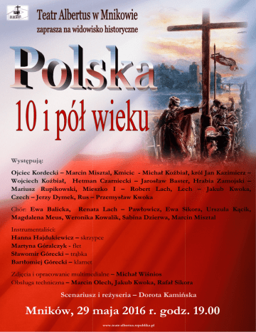 Występują: Ojciec Kordecki – Marcin Misztal, Kmicic - Michał Koźbiał, król Jan Kazimierz – Wojciech Koźbiał, Hetman etman Czarniecki – Jarosław Baster, Hrabia Zamojski – Mariusz Rupikowski, Mieszko I – Robert Lach, Lech – Jakub Kwoka, Czech – Jerzy Dymek, Rus – Przemysław Kwoka Chór: Ewa Balicka, Renata Lach – Pawłowicz,, Ewa Sikora, Urszula Kącik, Magdalena Meus, Weronika Kowalik, Kowalik Sabina Dzierwa, Marcin Misztal Instrumentaliści: Hanna Hajdukiewicz – skrzypce Martyna Góralczyk - flet Sławomir Górecki – trąbka Bartłomiej Górecki – klarnet Zdjęcia i opracowanie multimedialne – Michał Wiśnios Obsługa techniczna – Marcin Olech, Jakub Kwoka, Rafał Sikora Scenariusz i reżyseria – Dorota Kamińska Mników, 29 maja 2016 r. godz. 19.00 www.teatr-albertus.republika.pl
