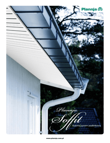 Soffit Plannja Stalowy system podbitkowy www.plannja.com.pl Plannja Soffit kompletny stalowy system podbitkowy System Plannja Soffit przeznaczony jest do wykonywania podbitek dachowych. Posiada zalety produktów wykonanych z blach, stalowych ocynkowanych i powlekanych metodą „coil- coatingu” - trwałość, sztywność, estetyczny wygląd. Charakteryzuje się łatwym szybkim montażem oraz możliwością wentylacji przestrzeni podokapowej, kalenicowej oraz ściennej. 2 Plannja Soffit Plannja Soffit 3 Plannja Soffit to pierwszy kompletny stalowy system podbitkowy Poliester Standard dostępny na rynku. System jest nowoczesnym, estetycznym i wyjątkowo trwałym rozwiązaniem techniczno-architektonicznym i doskonałym wykończeniem dachu każdego budynku. Szeroka gama kolorystyczna oraz embosowana struktura umożliwia jej indywidualne dopasowanie do wybranego elementu budynku: 70 biały 10 grafitowoszary 56 brązowy Poliester Wood dachu, rynien, ścian, okien lub drzwi. Dzięki zastosowaniu podbitki Plannja Soffit dom nabiera niepowtarzalnego indywidualnego charakteru spełniającego oczekiwania inwestorów o wyjątkowym Plastisol Embosowany subtelnym guście. biały brązowy Dane techniczne 7 7,5 15 315 105 90 2,1 105 90 15 315 7 Plannja Soffit 7,5 7,5 95o 15 4 105 90 Materiał stal ocynkowana, powlekana Powłoka Poliester Standard, Poliester Wood, Poliester Embosowany Grubość 0,50 mm Warstwa cynku 275 g/m2 Głębokość tłoczenia 7,5 mm Masa panelu 4,8 kg lub 5,4 kg Szerokość arkusza 341 mm Szerokość krycia 315 mm Długość arkusza 3600 mm Powierzchnia efektywna panelu 1,13 m² Gwarancja 10 lat Instrukcja montażu WSTĘP I Do prac montażowych związanych z wykonaniem montażu systemu podbitki dachowej i elewacji Plannja Soffit można przystąpić po dokładnym zapoznaniu się z instrukcją montażu. Montaż należy zawsze przeprowadzać z zachowaniem zasad techniki budowlanej i zgodnie ze sztuką dekarską. Transport i przechowywanie Do prac wykonawczych związanych z montażem systemu podbitki dachowej Plannja Soffit można przystąpić po dokładnym zapoznaniu się z instrukcją montażu. Montaż należy zawsze przeprowadzać z zachowaniem zasad techniki budowlanej i zgodnie ze sztuką dekarską. Pomieszczenia magazynowe powinny być suche. Przy składowaniu na zewnątrz, opakowania powinny być przykryte plandeką z zapewnieniem dostępu powietrza do arkuszy blachy. Przechowywać maksymalnie w dwóch warstwach Niezbędne narzędzia • • • • • piła do cięcia kantówki młotek metrówka kątownik poziomica • • • • gilotyna do blachy z nożem kształtowym nibler nożyce do blachy wkrętarka z regulowanym sprzęgłem i wyborem kierunku obrotów Uwaga! Nigdy nie należy używać do cięcia szlifierki kątowej. Wysoka temperatura powoduje odsunięcie w miejscu cięcia cynkowej powłoki zabezpieczającej od krawędzi i przecięty brzeg ulegnie korozji. Iskry powstające przy cięciu mogą również uszkodzić powierzchnię powłoki blachy. Stanowisko montażowe Przed przystąpieniem do prac należy zorganizować stanowisko pracy i miejsce montażu przez wyposażenie ich w niezbędne rusztowania, platformy montażowe oraz stół do cięcia paneli i elementów wykończeniowych Porady wstępne Do wykonania podbitki dachowej stosować tylko panele z otworami wentylacyjnymi. Montaż podbitki można wykonać zarówno przed jak i po montażu orynniowania. Zaleca się, gdy tylko jest to możliwe, montaż podsufitki przed montażem systemu orynnowania. Taki montaż jest łatwiejszy i szybszy. Nie stosujemy wówczas listwy startowej od strony deski czołowej. Po zakończeniu montowania paneli podsufitkowych instalujemy do deski czołowej specjalną podbitkową obróbkę deski, która maskuje wkręty montażowe i stanowi estetyczne wykończenie systemu. Plannja Soffit 5 II Montaż PODBITKI DACHOWEJ 1. Wykonanie konstrukcji nośnej Podsufitkowe panele Plannja Soffit należy mocować na specjalnej konstrukcji nośnej i ruszcie drewnianym wykonanych z drewnianych łat o wymiarach minimalnych 25 mm x 50 mm. Muszą być one suche, proste i zaimpregnowane nie powodującymi korozji środkami grzybobójczymi. Ruszt drewniany należy mocować do każdej krokwi za pośrednictwem pionowych usytuowanych przy ścianie budynku łat. W przypadku gdy szerokość okapu jest większa od 1 m należy stosować po środku rusztu dodatkową łatę poziomą przymocowaną do krokwi za pomocą pionowej listwy. Dla podbitek skośnych łaty należy mocować bezpośrednio do krokwi. Stosować wkręty do drewna o minimalnej długości 50 mm. Cała konstrukcja nośna musi być dokładnie wypoziomowana. Schematy rozmieszczenia łat dla okapów poziomych przedstawiono na rysunkach. Krokiew Blachodachówka Plannja Krokiew Blachodachówka Plannja Ściana Ściana Łata pionowa Łaty pionowe Łata pozioma Łaty poziome Deska czołowa Deska czołowa Rozmieszczenie łat dla okapu poziomego <1 m Rozmieszczenie łat dla okapu poziomego o szerokości >1 m Schemat rozmieszczenia łat dla okapów skośnych przedstawiono na rysunkach. Krokiew Blachodachówka Plannja Krokiew Blachodachówka Plannja Ściana Ściana Łaty skośne Łaty skośne Deska czołowa Deska czołowa Rozmieszczenie łat dla podbitki skośnej o szerokości <1 m Rozmieszczenie łat dla podbitki skośnej o szerokości >1 m 2. Montaż listew startowych i maskujących Do łat umieszczonych wzdłużnie przy ścianie budynku należy przymocować listwę startową za pomocą wkrętów 4,2x25. Blachodachówka Plannja Listwa startowa „J” Podbitkowa obróbka deski Panel podbitkowy 6 Plannja Soffit Przy okapach narożnikowych stosować, w zależności od sposobu montażu po przekątnej lub wzdłużnie na przedłużeniu przyściennej listwy startowej, dwie listwy startowe zwrócone do siebie krótszym bokiem. Listwy startowe „J” Blachodachówka Plannja Listwy startowe „J” Panel podbitkowy Panel podbitkowy Listwy startowe „J” Narożne ściany b