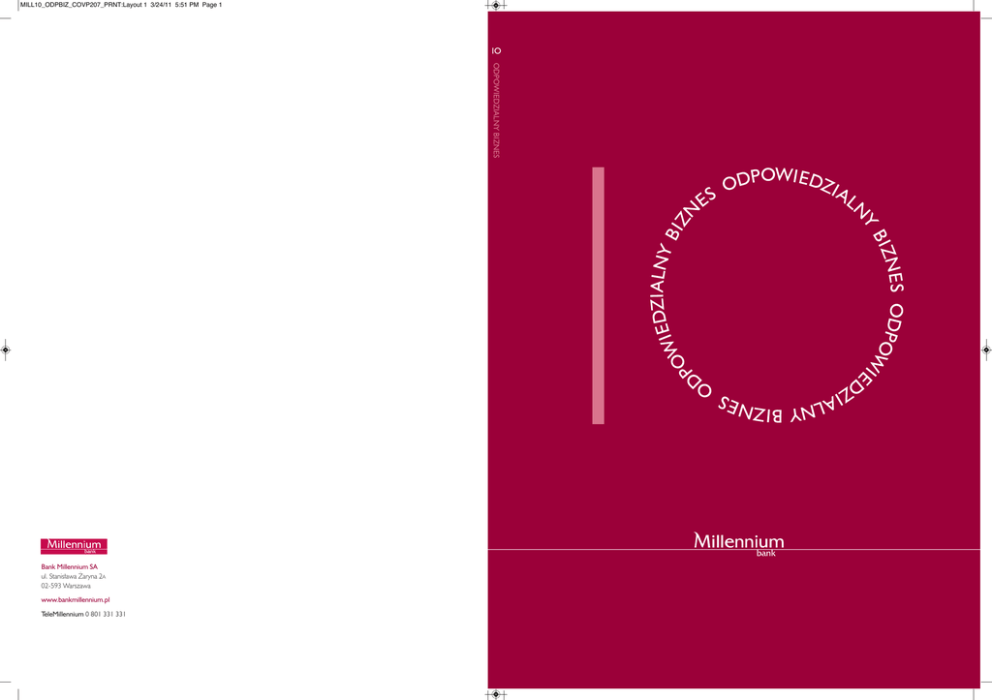 MILL10_ODPBIZ_COVP207_PRNT:Layout 1 3/24/11 5:51 PM Page 1 1O ODPOWIEDZIALNY BIZNES Bank Millennium SA ul. Stanis∏awa ˚aryna 2A 02-593 Warszawa www.bankmillennium.pl TeleMillennium 0 801 331 331 ABC Wprowadzenie 5 List Prezesa Banku Millennium 7 Misja, wartoÊci i kultura korporacyjna Dialog z Interesariuszami 13 9 PrzejrzystoÊç dzia∏ania i bezpieczeƒstwo Dobre miejsce pracy 41 51 Aspekty oddzia∏ywania Banku na Êrodowisko Dzia∏ania na rzecz spo∏eczeƒstwa 69 63 Wprowadzenie Bank Millennium, po raz piàty z kolei, przygotowa∏ opracowanie zawierajàce opis dzia∏aƒ zwiàzanych z realizacjà przez Bank zasad odpowiedzialnego biznesu. Dzia∏ania wynikajàce z realizacji tych zasad stanowià codziennà praktyk´ Banku i sà cz´Êcià jego kultury korporacyjnej. Uk∏ad tegorocznego wydawnictwa jest zbli˝ony do poprzednich edycji, co pozwala na porównanie informacji z poszczególnych, omawianych obszarów. Tam gdzie to by∏o mo˝liwe, zakres informacji prezentowanych w raporcie zosta∏ rozszerzony. Bank do∏o˝y∏ te˝ staraƒ, by raport mia∏ charakter zrównowa˝ony. Opracowanie „Odpowiedzialny biznes 2010” stanowi uzupe∏nienie informacji zawartych w „Raporcie Rocznym 2010” Banku Millennium, w którym przedstawione sà podstawowe obszary dzia∏alnoÊci biznesowej spó∏ki wraz z danymi finansowymi za rok 2010. 5 List Prezesa Zarzàdu Banku Millennium Szanowni Paƒstwo, oddajemy do ràk Paƒstwa kolejnà, piàtà z kolei, edycj´ raportu przedstawiajàcego dzia∏ania Banku Millennium wynikajàce z realizacji zasad prowadzenia odpowiedzialnego biznesu. Na naszà dzia∏alnoÊç w roku 2010 zasadniczy wp∏yw mia∏y nadal niekorzystne czynniki zwiàzane ze Êwiatowym kryzysem gospodarczym. Odczu∏a je tak˝e, choç w stopniu mniejszym ni˝ inne kraje europejskie, polska gospodarka, a w tym system bankowy. Naszym celem w minionym roku, po dokonaniu redefinicji bie˝àcych celów biznesowych i niezb´dnych zmianach organizacyjnych, by∏a nadal profesjonalna obs∏uga naszych Klientów. Szczególne znaczenie mia∏ dla nas dialog prowadzony na ró˝nych poziomach wspó∏pracy z Klientami pozwalajàcy lepiej zrozumieç wzajemne oczekiwania oraz umo˝liwiajàcy rozwiàzywanie problemów, które nios∏a biznesowa wspó∏praca. Informacje o efektach naszych dzia∏aƒ biznesowych znajdziecie Paƒstwa w opublikowanym „Raporcie Rocznym 2010”. W tym trudnym roku, dbaliÊmy o to, by w naszej dzia∏alnoÊci uwzgl´dniaç potrzeby i racje naszych Interesariuszy, realizowaç polityk´ zrównowa˝onego rozwoju i prowadziç biznes w sposób odpowiedzialny. Praktyczna realizacja tych zasad w zakresie ładu korporacyjnego, polityki informacyjnej, relacji z Inwestorami oraz działalnoÊci w obszarze relacji społecznych, ekologii i spraw pracowniczych była podstawà zaliczenia Banku Millennium do grona szesnastu spółek giełdowych tworzàcych Index Respect – pierwszego w naszej cz´Êci Europy indeksu spółek społecznie odpowiedzialnych To dla nas sukces i ogromne wyzwanie na przyszłoÊç. Z powa˝aniem BOGUS¸AW KOTT Prezes Zarzàdu Banku Millennium 7 Misja, wartoÊci i kultura korporacyjna Na realia dzia∏alnoÊci Banku Millennium w roku 2010 istotny wp∏yw mia∏y skutki kryzysu gospodarczego, odczuwalne nadal w minionym roku w polskiej gospodarce i systemie bankowym. W tej sytuacji specjalne znaczenie mia∏o prowadzenie przez Bank dzia∏alnoÊci zgodnej z katalogiem wartoÊci przypisanych jego marce oraz transparentne, charakterystyczne dla instytucji zaufania publicznego, komunikowanie planów i dokonywanych zmian. Konieczna korekta strategii biznesowej oraz towarzyszàce jej zmiany organizacyjne pozwoli∏y Bankowi dostosowaç si´ do zmienionych warunków prowadzenia dzia∏alnoÊci. Szczególnà uwag´ zwrócono na kompleks dzia∏aƒ poprawiajàcych bezpieczeƒstwo prowadzonej dzia∏alnoÊci oraz zmniejszajàce towarzyszàce jej ryzyka. Zrozumienie potrzeb Klientów i utrzymanie wzajemnego zaufania by∏y celami dialogu, który Bank prowadzi∏ ze swoimi partnerami na wszystkich etapach wspó∏pracy. Dzi´ki temu Bank móg∏ konsekwentnie realizowaç swojà strategi´, zachowujàc standardy i wartoÊci wynikajàce z jego misji. 9 Misja, wartoÊci i kultura korporacyjna Motto „Inspiruje nas ˝ycie”, towarzyszàce codziennej dzia∏alnoÊci Banku w minionym roku nadal stanowi∏o zobowiàzanie do realizacji potrzeb Klientów w zakresie wszechstronnej obs∏ugi bankowej i uznanie aktywnych relacji z nimi za najistotniejszy cel z punktu widzenia Banku. Aktualne pozostajà te˝ wartoÊci, zwiàzane z markà Millennium: • Zaufanie – przestrzeganie przez Bank wysokich norm etycznych i odpowiedzialnoÊç za podejmowane dzia∏ania; • Otwarcie na Klienta – poznawanie i wychodzenie naprzeciw oczekiwaniom i potrzebom Klientów; • Etyka i OdpowiedzialnoÊç w dzia∏aniu; • Doskona∏oÊç – wysoka jakoÊç Êwiadczonych us∏ug; • InnowacyjnoÊç – dà˝enie, poszukiwanie nowych rozwiàzaƒ w obs∏udze Klientów i na rynku finansowym; • Szacunek dla Interesariuszy. Realizacja w roku 2010 strategii dzia∏ania Banku by∏a istotnie uzale˝niona od rozwoju sytuacji na mi´dzynarodowym i polskim rynku gospodarczym. Mimo gwa∏townych zawirowaƒ na rynku, Bank konsekwentnie realizowa∏ swój program, zachowujàc standardy i wartoÊci zwiàzane z jego misjà. 10 WIZJA JesteÊmy cz´Êcià grupy finansowej o ponadnarodowej to˝samoÊci, której dzia∏ania koncentrujà si´ na tworzeniu wartoÊci w kluczowych obszarach biznesowych na rynkach z jasno okreÊlonym profilem, w oparciu o doskona∏à jakoÊç i innowacyjnoÊç w tworzeniu oraz dystrybucji produktów i us∏ug finansowych. Has∏o „Inspiruje nas ˝ycie” to element ∏àczàcy wymagania Klientów oraz oczekiwania Spo∏eczeƒstwa i Pracowników. MISJA Nasza misja to tworzenie wartoÊci dla Klientów poprzez oferowanie produktów i us∏ug finansowych o najwy˝szej j